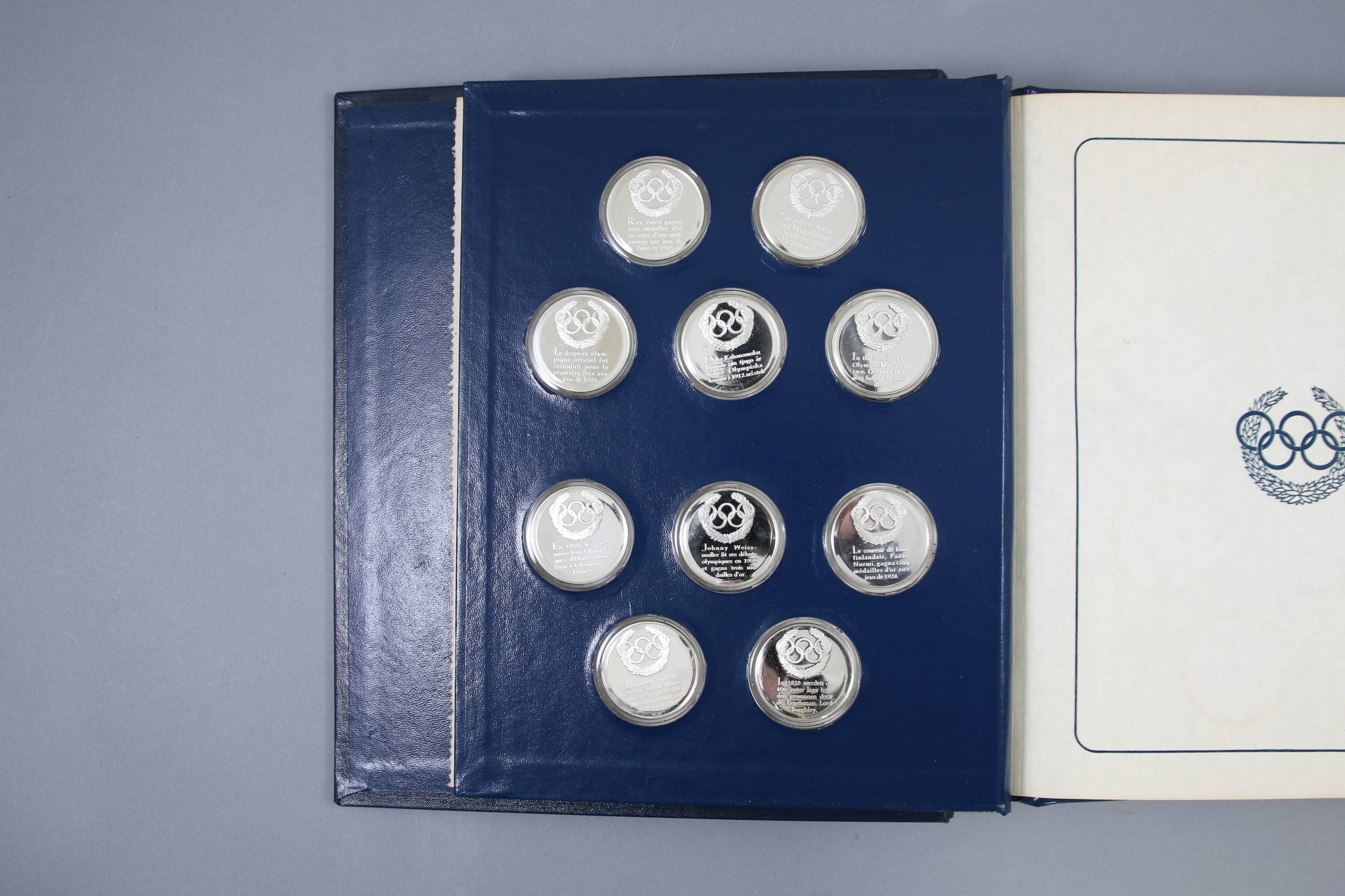 50 médailles commémoratives en argent célébrant les jeux de 1896 à 1976 à travers 50 champions des jeux d'hiver et d'été : a) de 1896 à 1928 (Ewry, Dorando Pietri, Nurmi, Sonja Henie, lors Burghley, Weissmuller, Kahanamoku, etc) ; b) de 1932 à 1948 (Owens, Didrikson, Button, Matthias, Blankers-Koen) ; c) de 1948 à 1956 (Elvstroem, Adhémar Ferreira, Zatopek, Papp, Sailer, Bob Richards) ; d) de 1960 à 1968 (Bikila, Killy, Fleming, Rafer Johnson) ; e) de 1968 à 1976 (Beamon, Oerter, Monti, Comaneci, Alexiev).