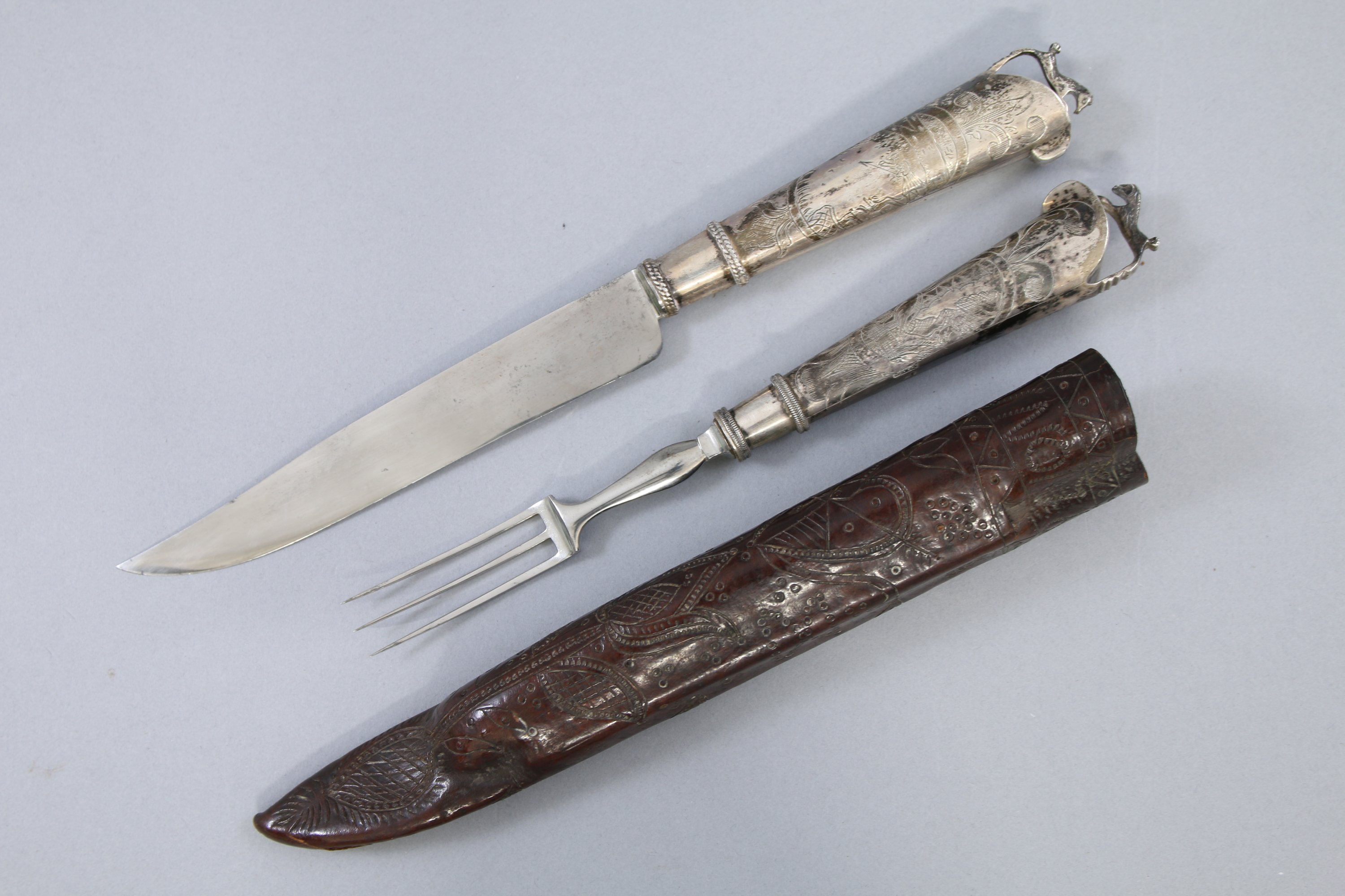 Manches en argent gravé, lame et dents en acier.