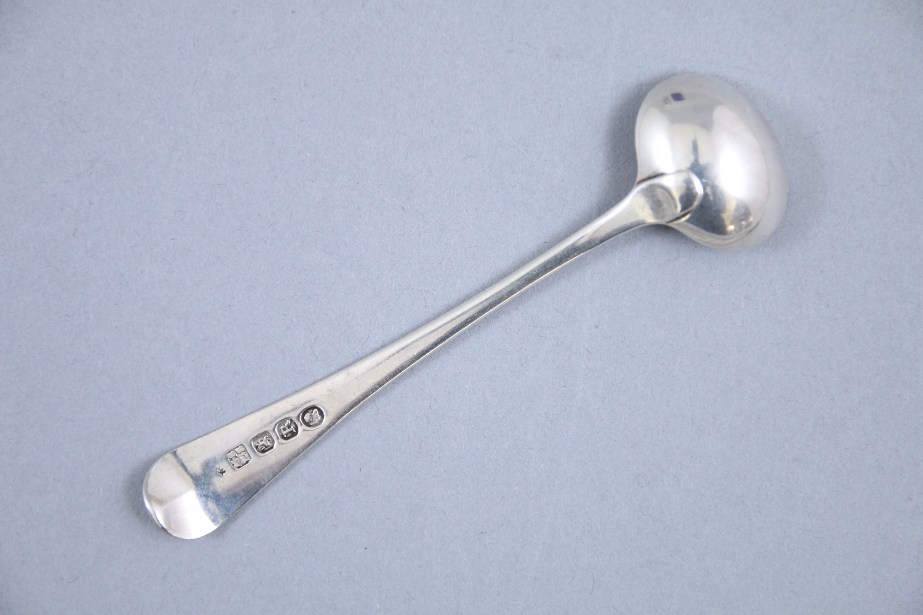 Joint : une cuiller à moutarde en argent modèle uniplat monogrammé "EAM". Travail anglais entre 1836 et 1849 (poinçon de William IV) Long. 10,5 Poids : 9,9 g.