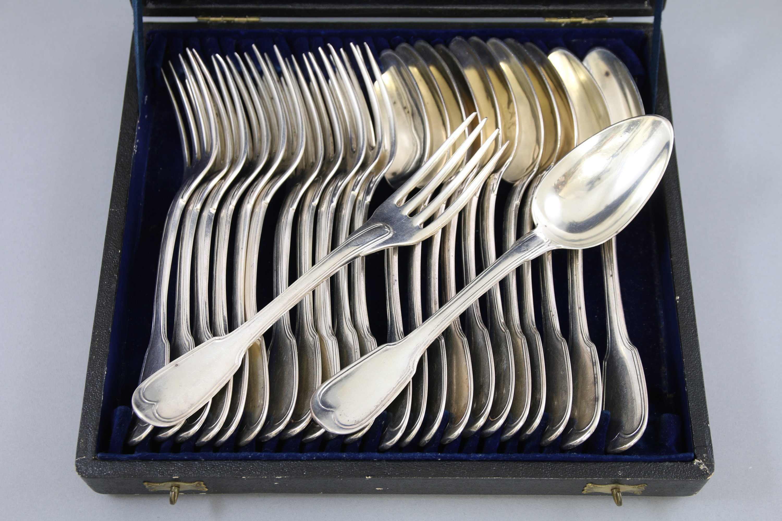 Poinçons : deuxième Coq 1er titre pour trois couverts et Vieillard (1819-1838) pour neuf couverts. Poinçons de grosse garantie. Plusieurs poinçons d'orfèvres différents.