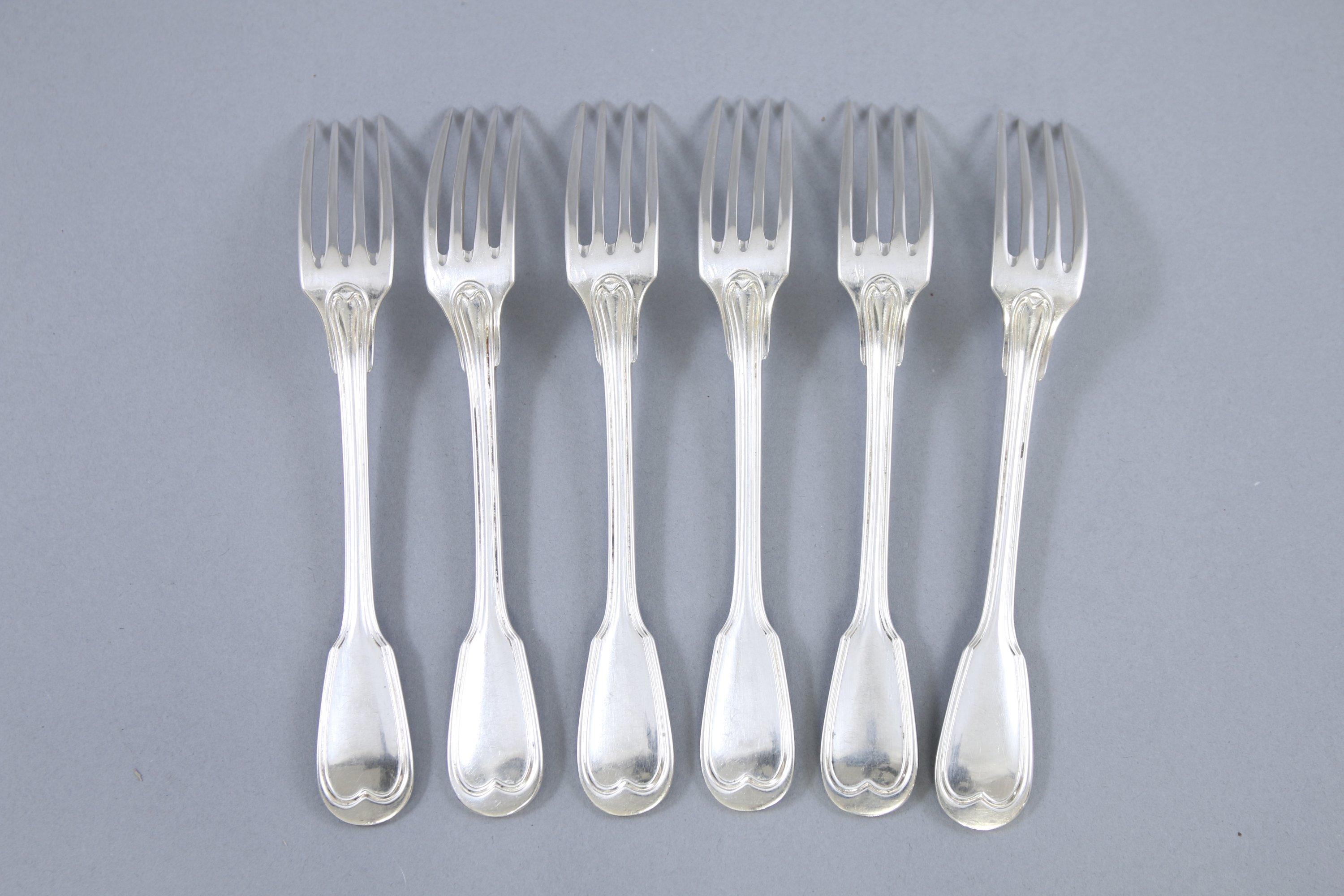Joint : Six fourchettes à entremets, modèle filet. Poinçon Minerve 1er titre. Orfèvre Henri Soufflot (1884-1910). Poids : 293 g.