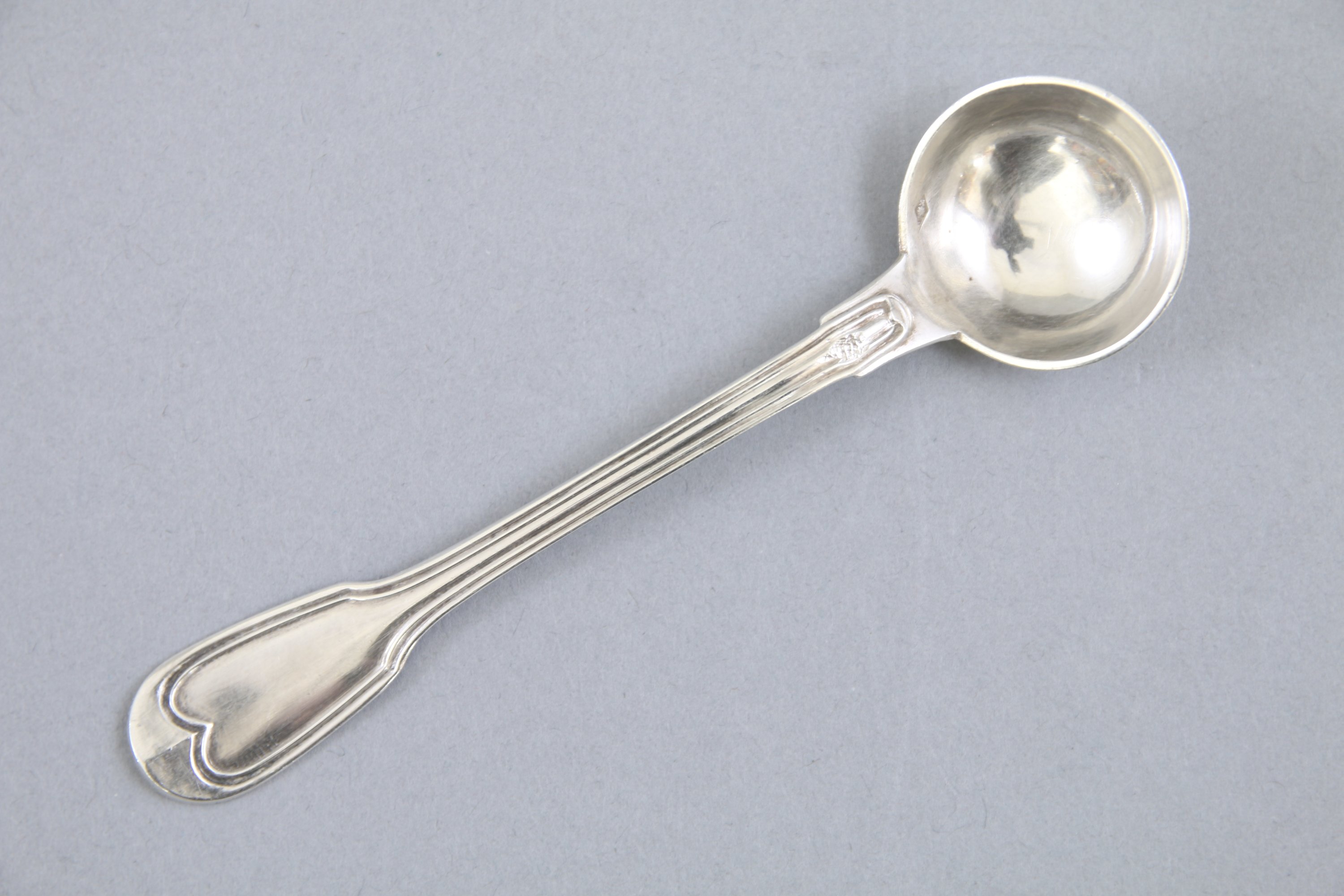 Joint : une cuiller à moutarde en argent, modèle filets et contours. Poinçon Minerve 1er titre. Orfèvre : non identifié "N avec un soleil". Poids : 15,7 g.