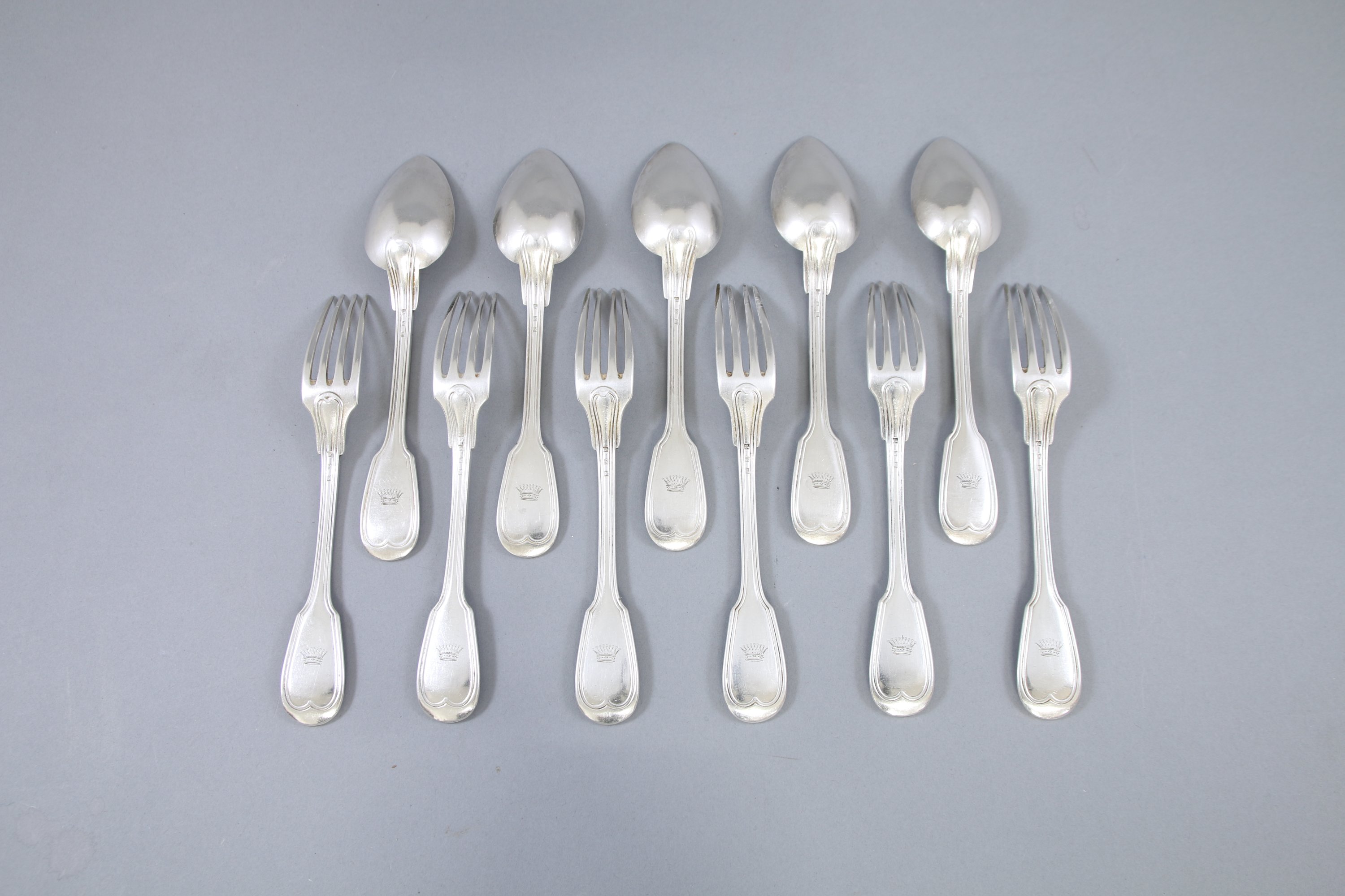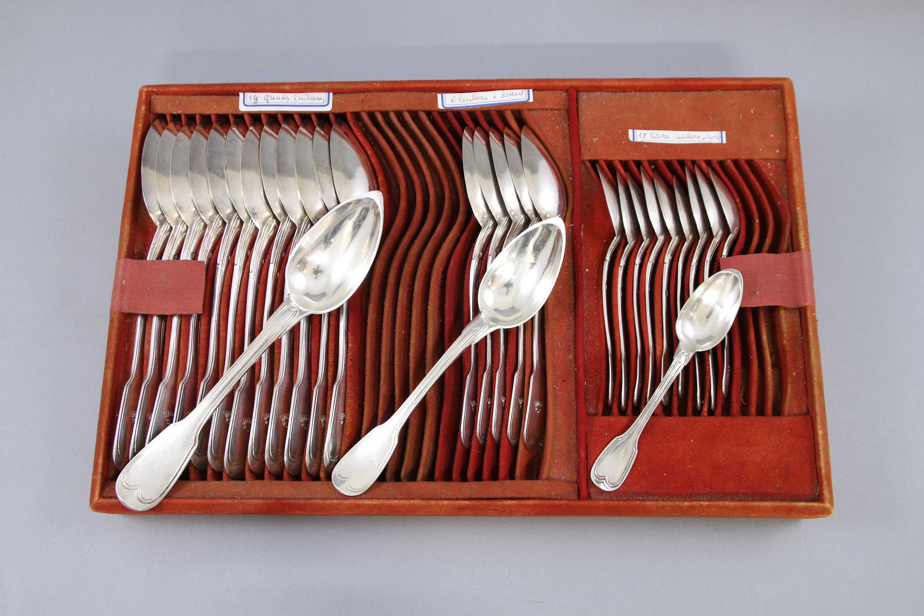 Modèle à filets-contours comprenant 18 fourchettes de table, 13 cuillers de table, 6 couverts à entremets, 9 cuillers à café et une cuiller à moka. La plupart des pièces gravées d'une couronne comtale.