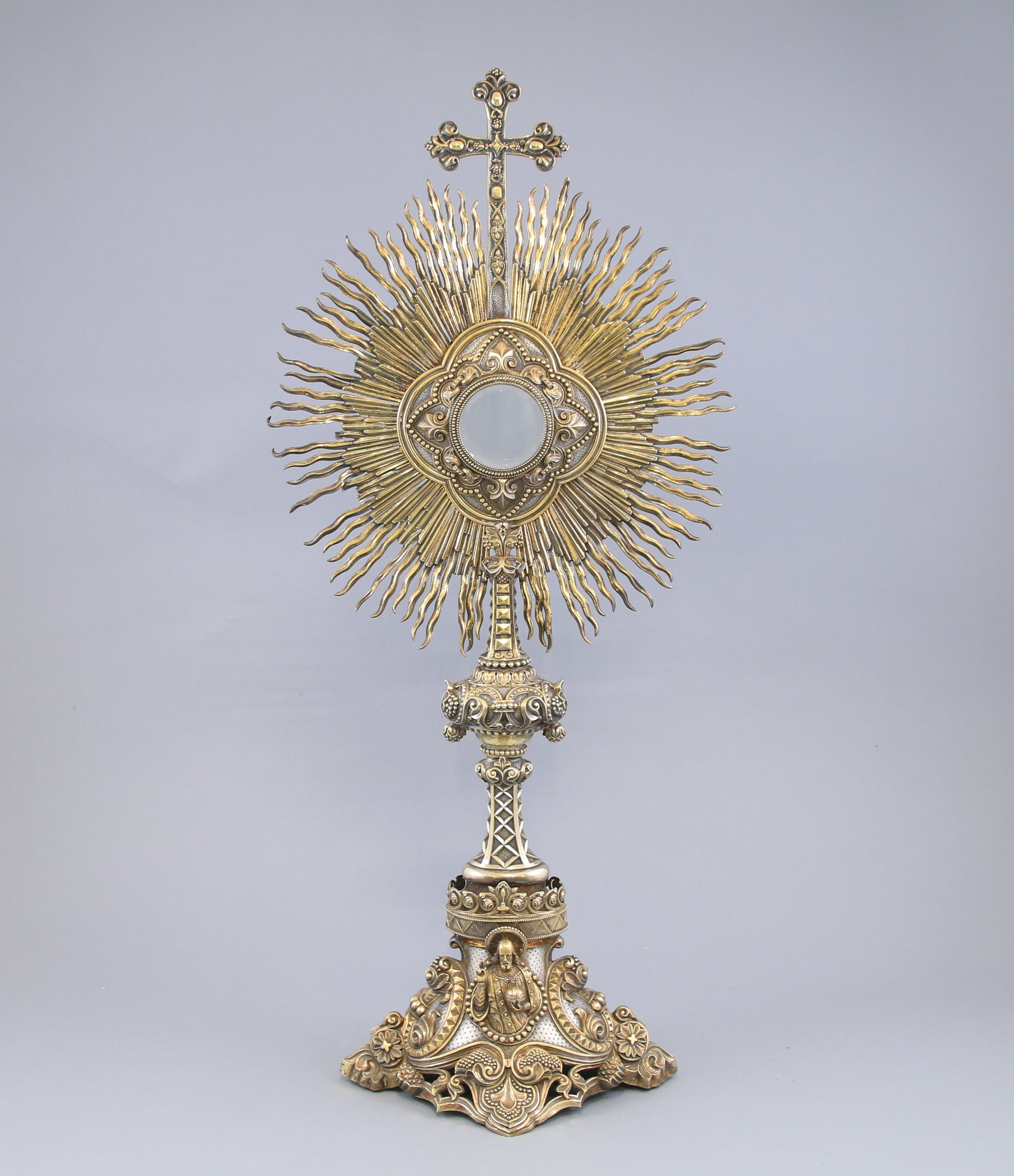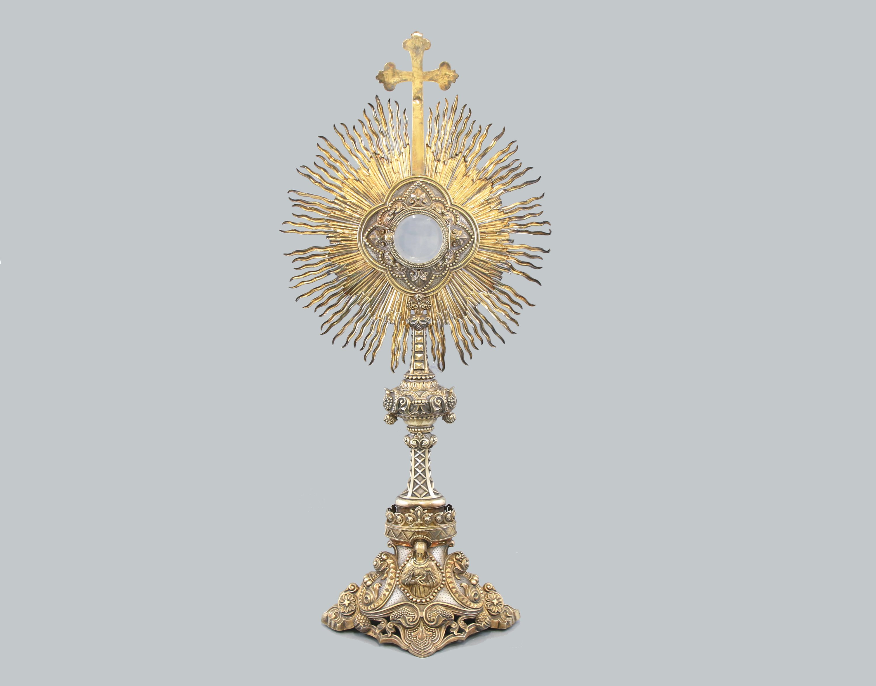 Une croix surmontant la monstrance inscrite dans un quadrilobe et entouré d'un décor de rayons. Elle repose sur un fût à décor de pointes de diamants et une ombilic ornée de graines et feuilles d'acanthe. Le pied à décor ajouré de motifs de végétaux et enroulements est orné des portraits en ronde bosse de la Vierge et du Christ bénissant.