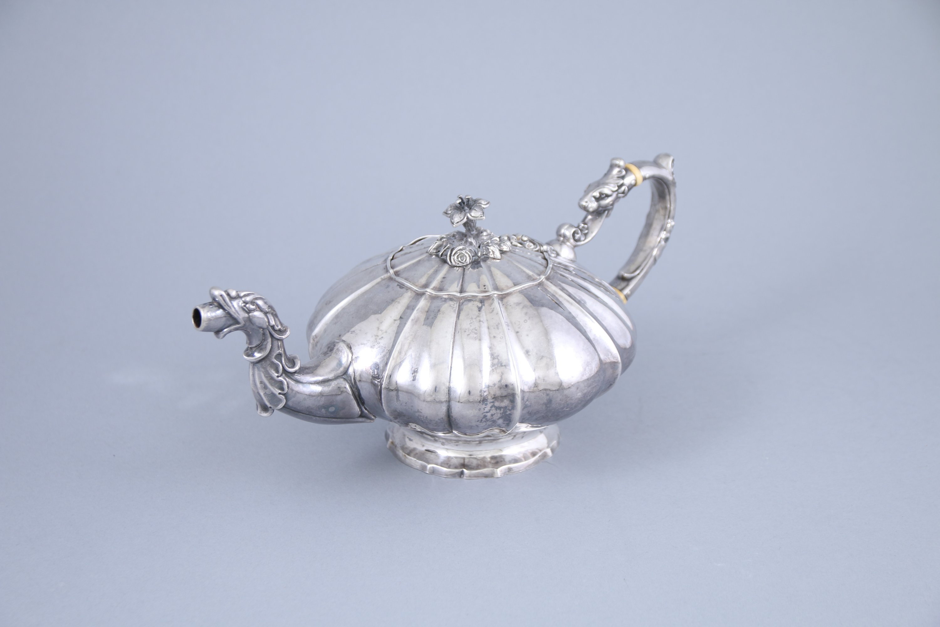 Le couvercle est sommé d'une fleur épanouie sur une terrasse végétale. L'anse à deux bagues est terminée par une tête de lion et feuille d'acanthe. Le bec zoomorphe est inscrit dans une panse godronnée soutenue par un pied circulaire.