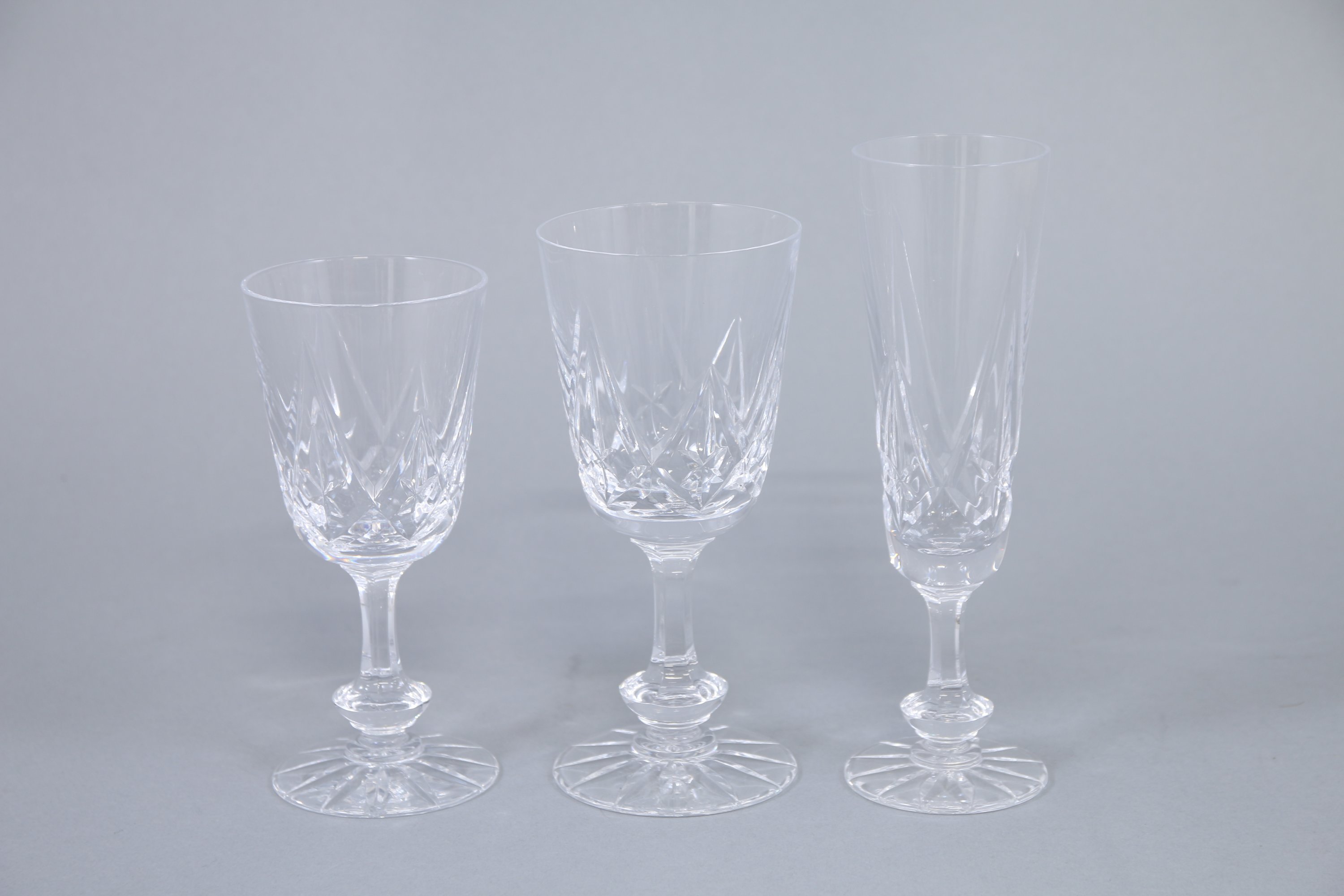 Il comprend 10 flûtes à Champagne, 11 verres à vin et 10 verres à eau à décor d'étoiles et pied à une ombilic.