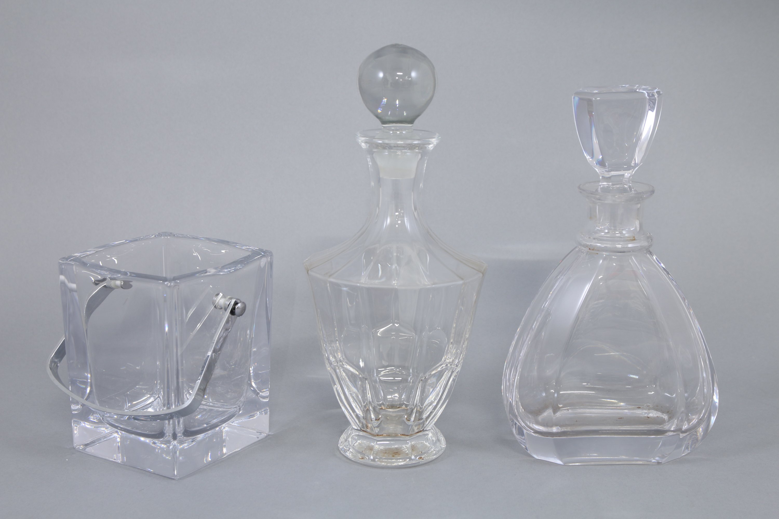 - Deux carafes en cristal, l'une à bouchon en boule, l'autre à pans coupés. Haut. 25,5 et 30,5 cm.