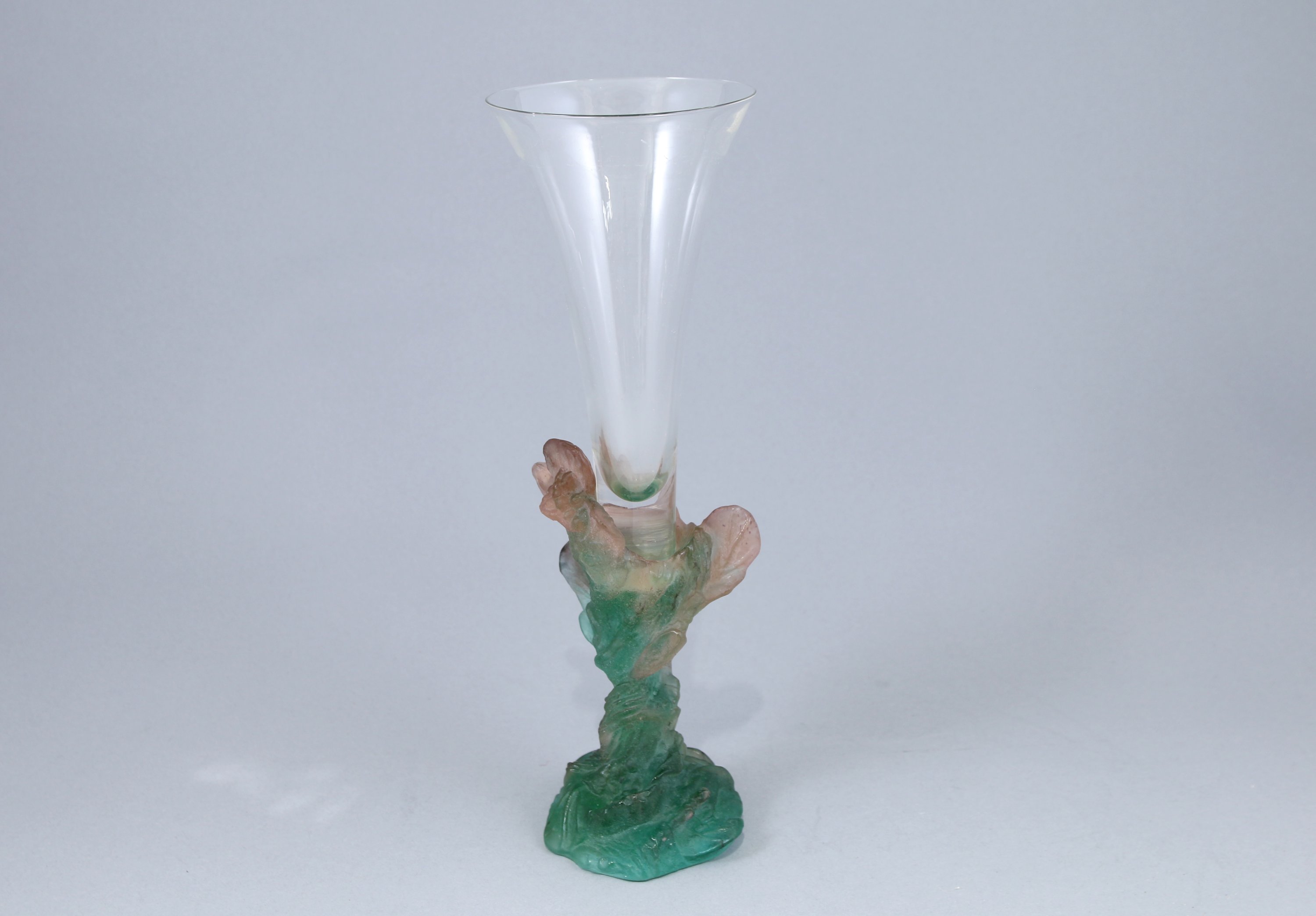 Pied en pâte de verre rose et verte et cornet en cristal blanc.