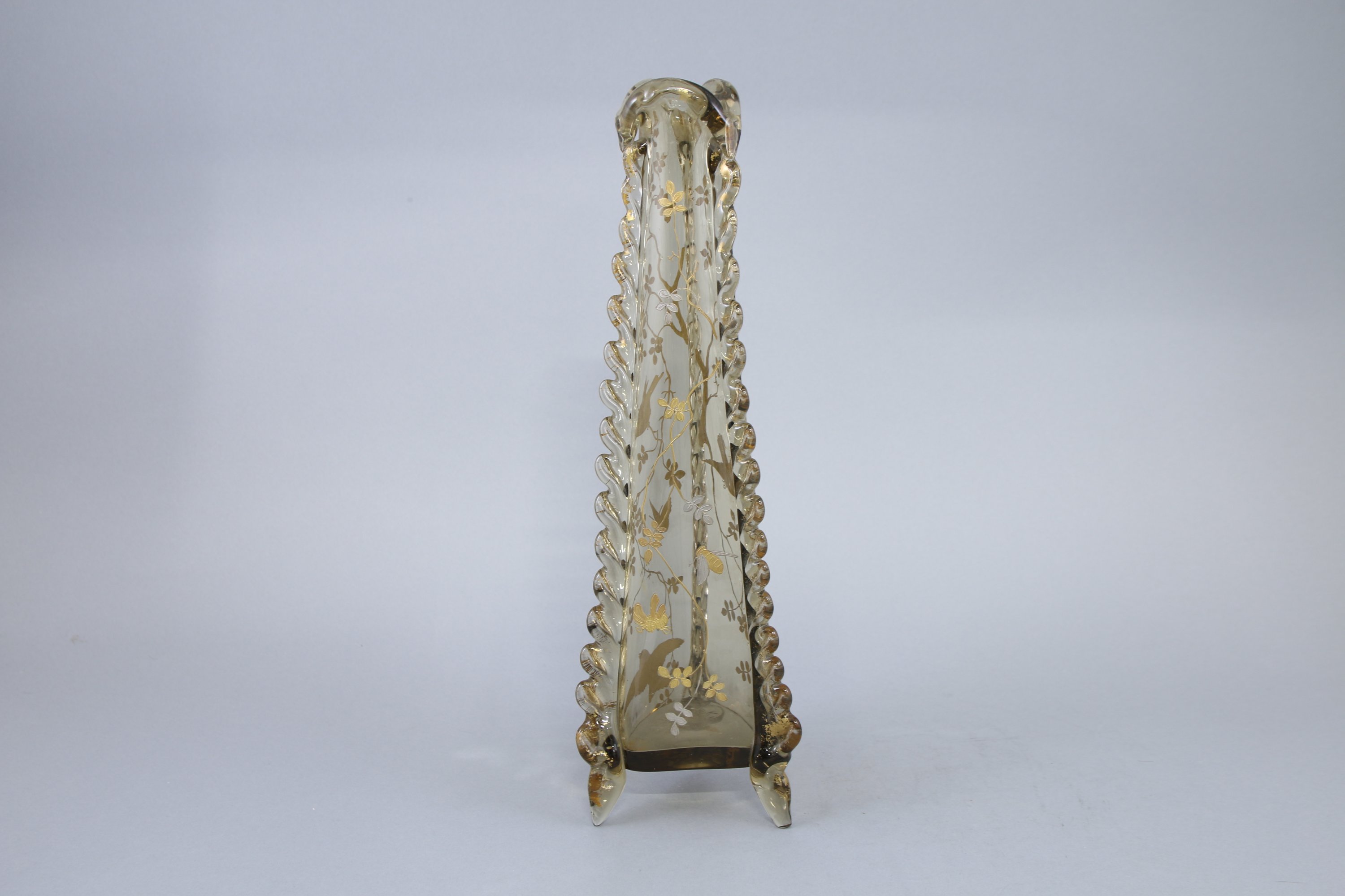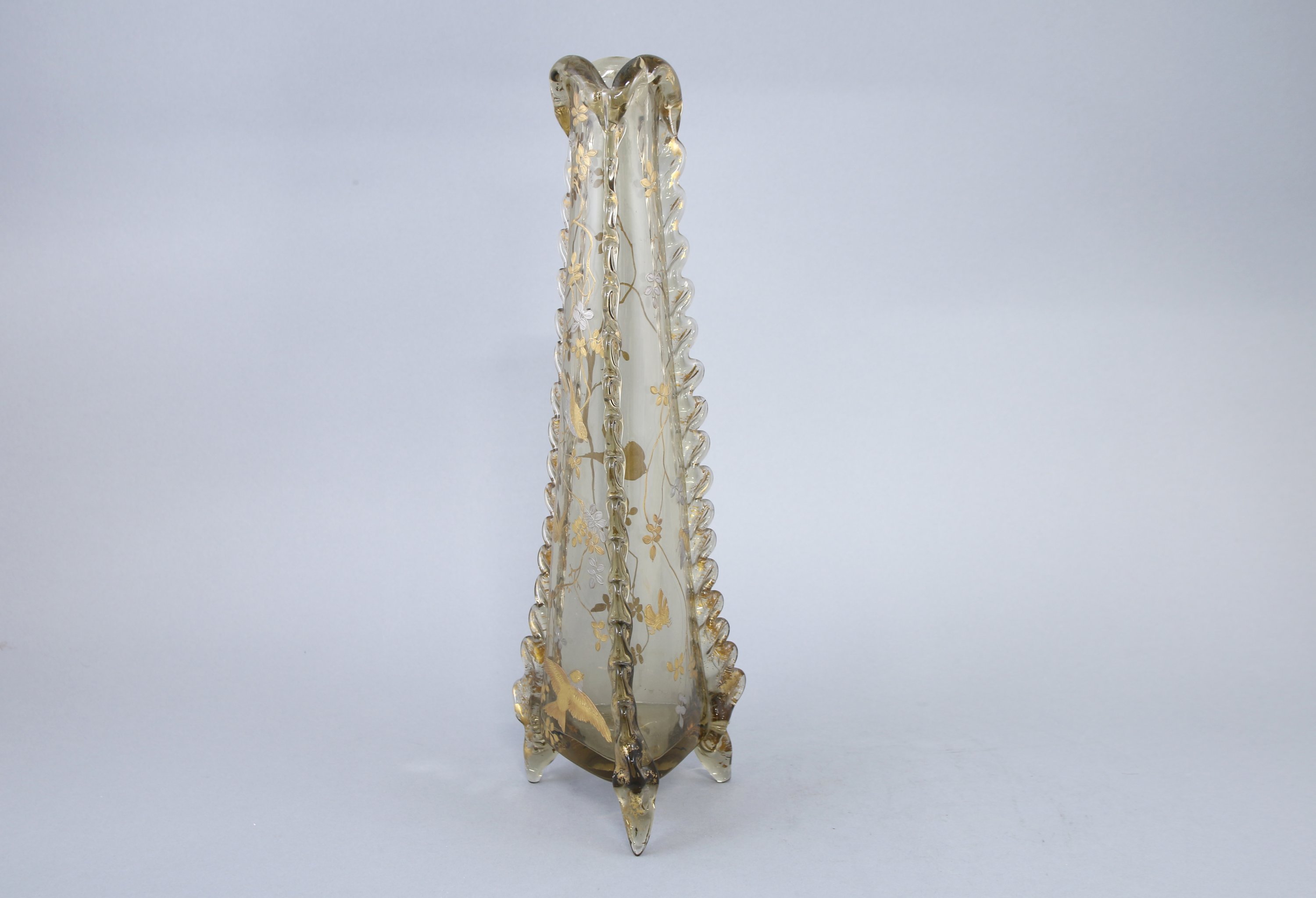 De forme tronconnique, les côtés cotelés et le col mouvementé en application. Riche décor émaillé plat et en relief d'inspiration japonisante d'oiseaux et d'insectes évoluant dans des branchages.