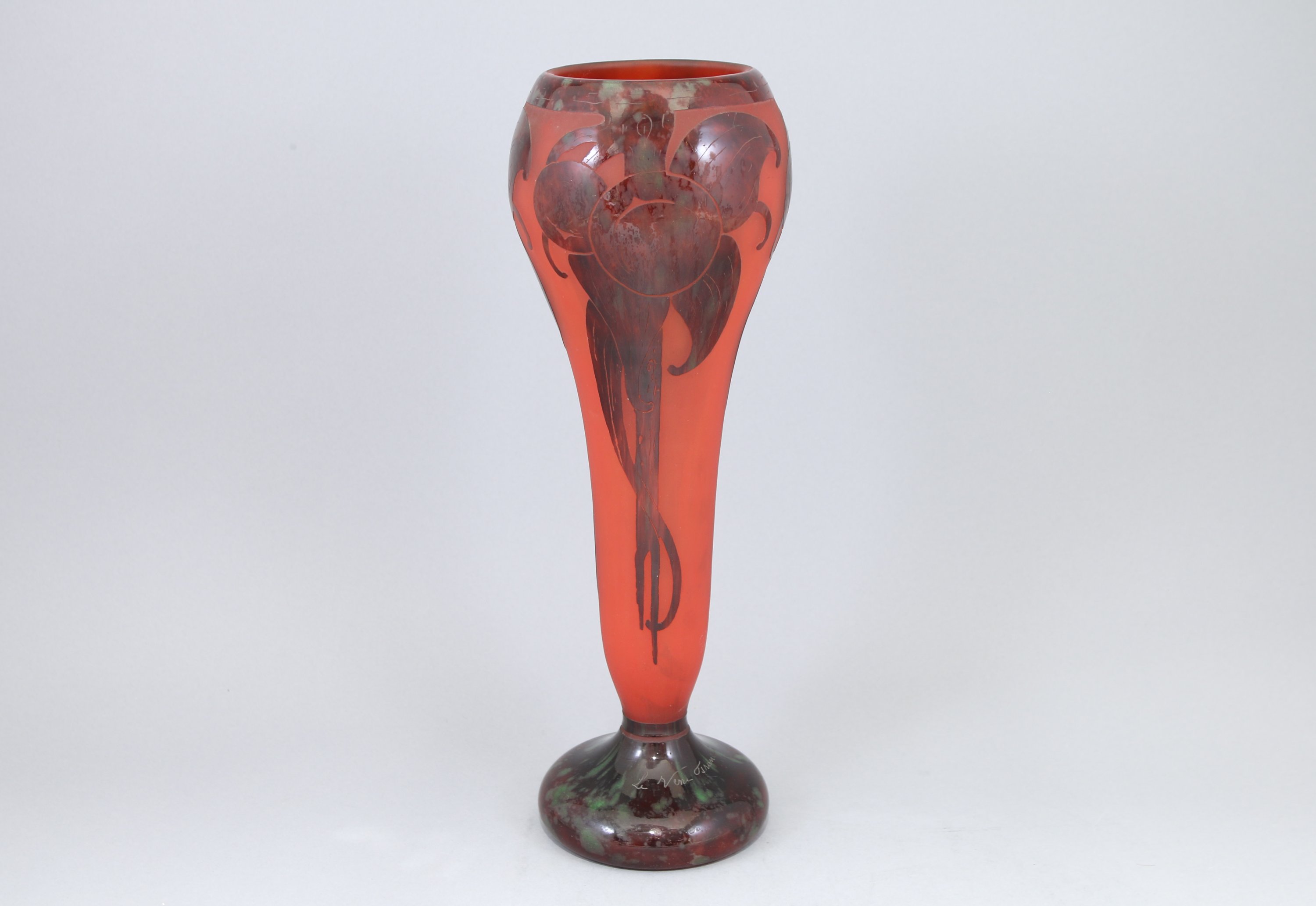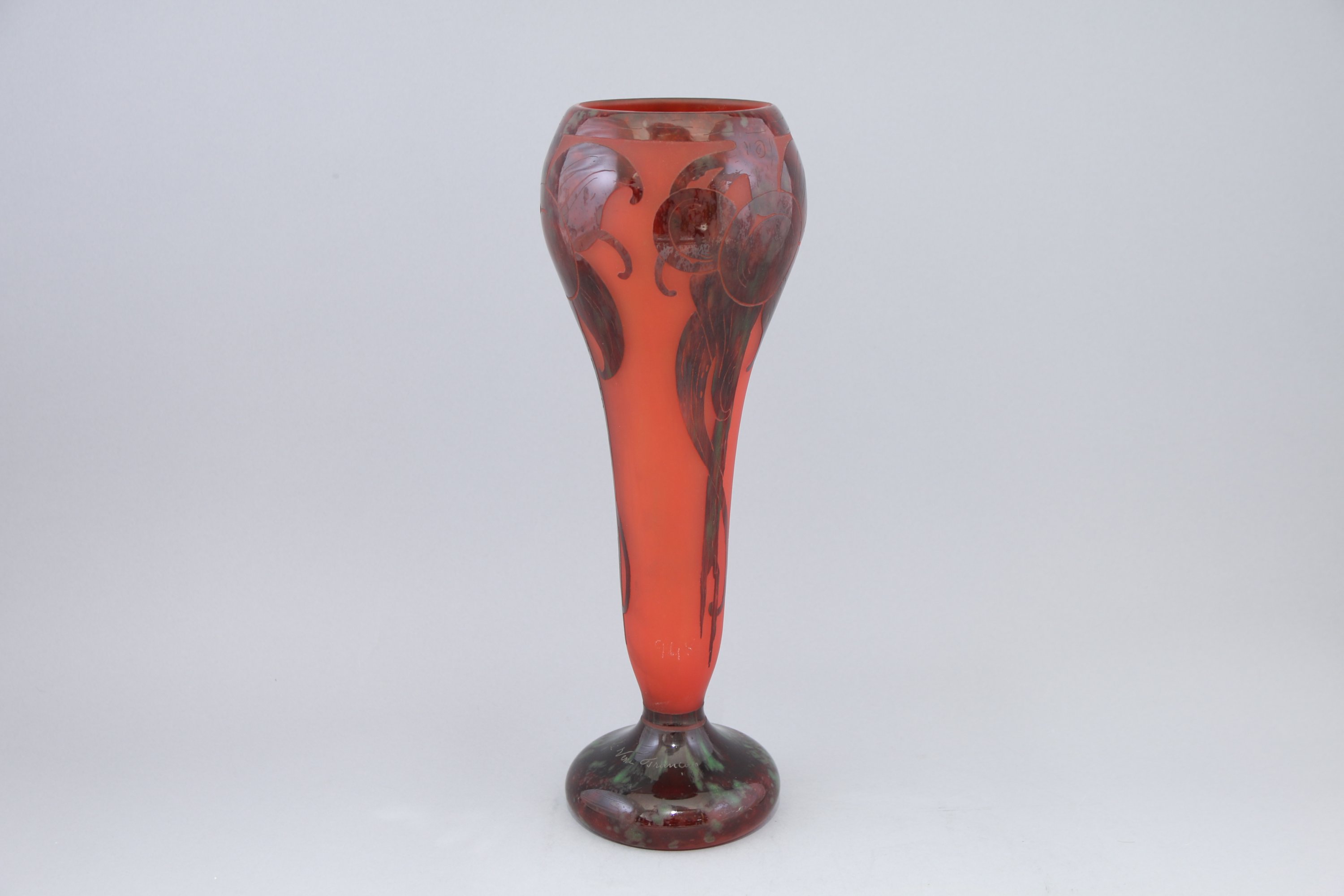 De forme cornet à col renflé, il repose sur un piedouche, à décor dit de "prunes" en verre rouge et vert sur un fond rouge poudré.