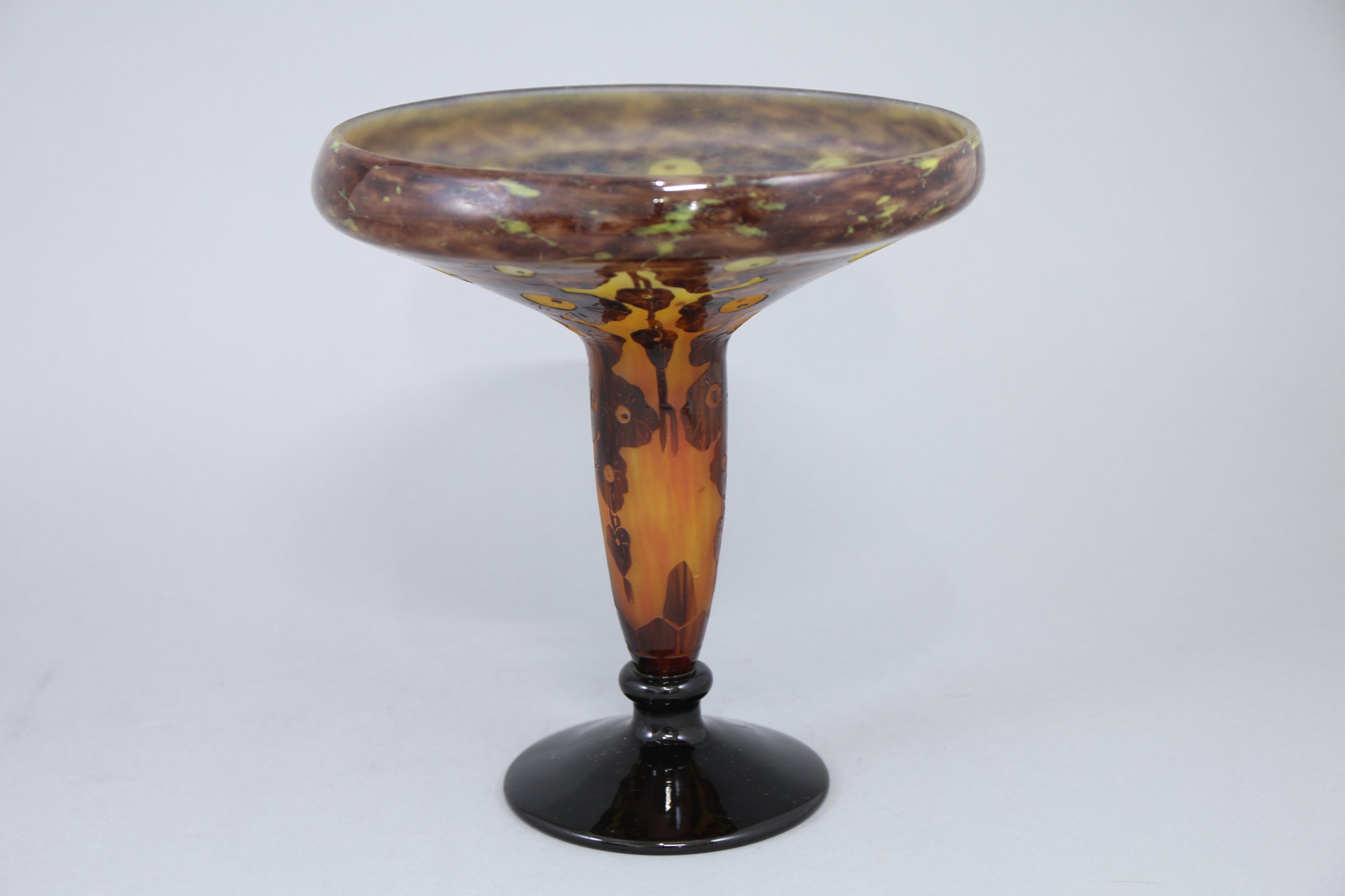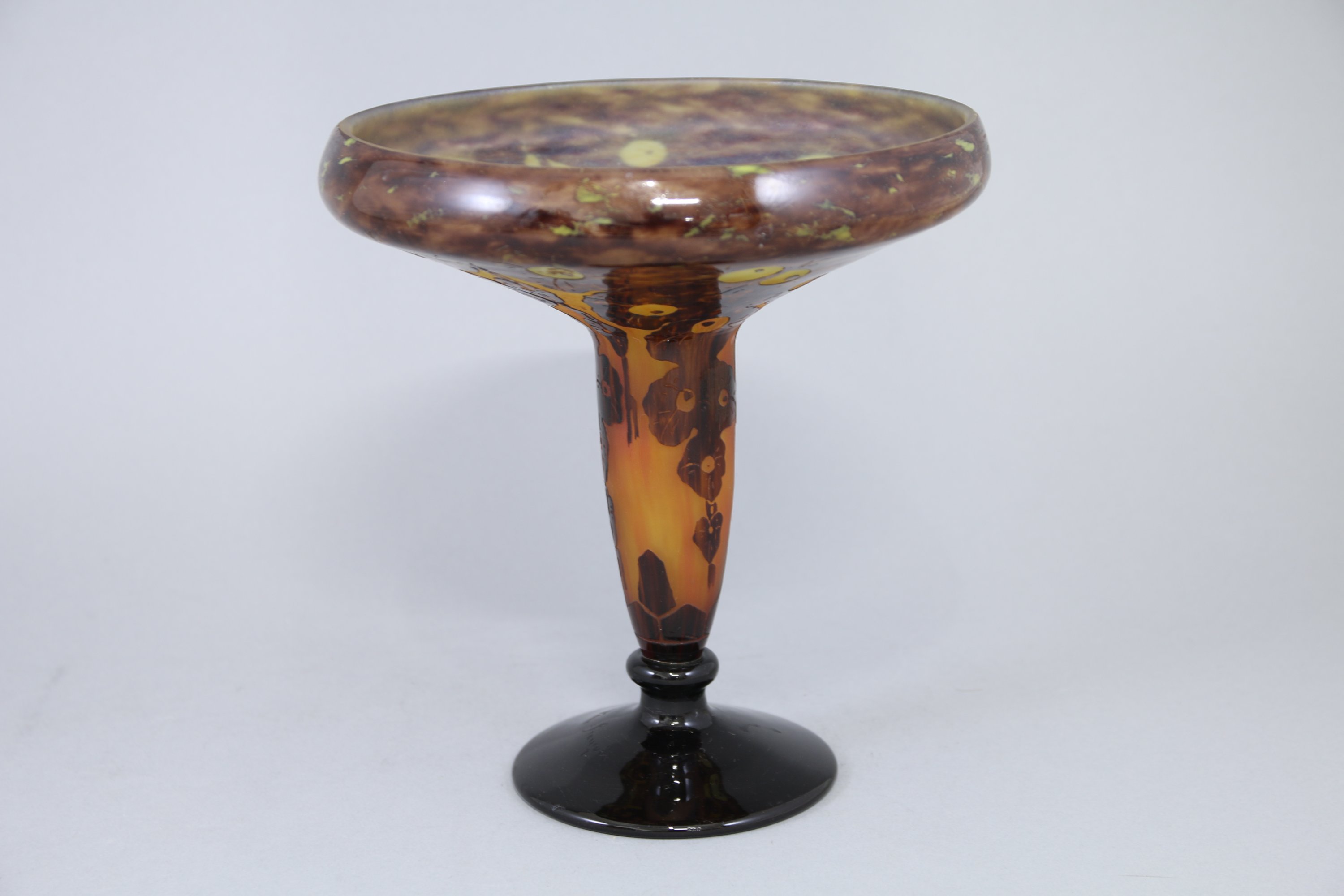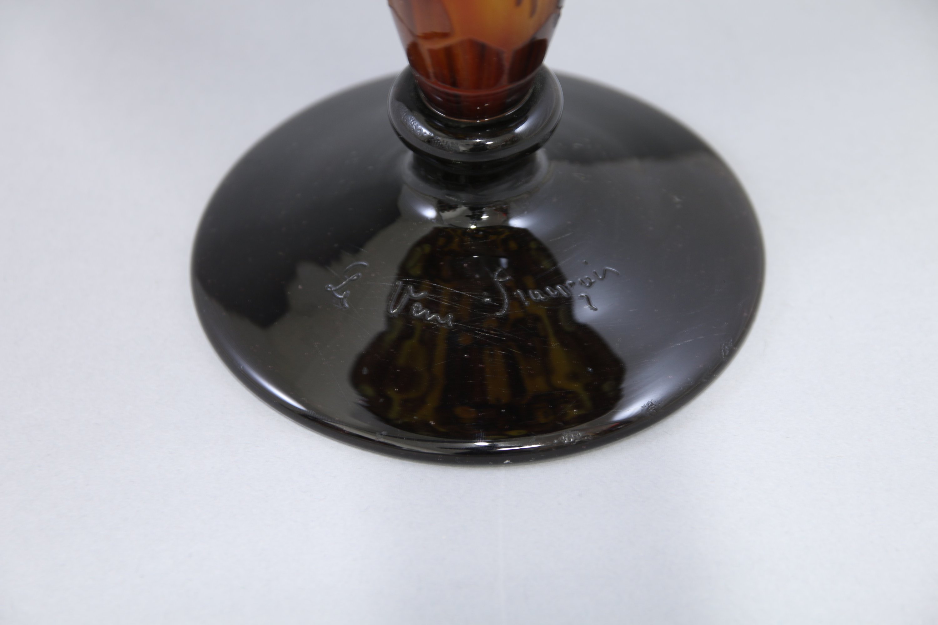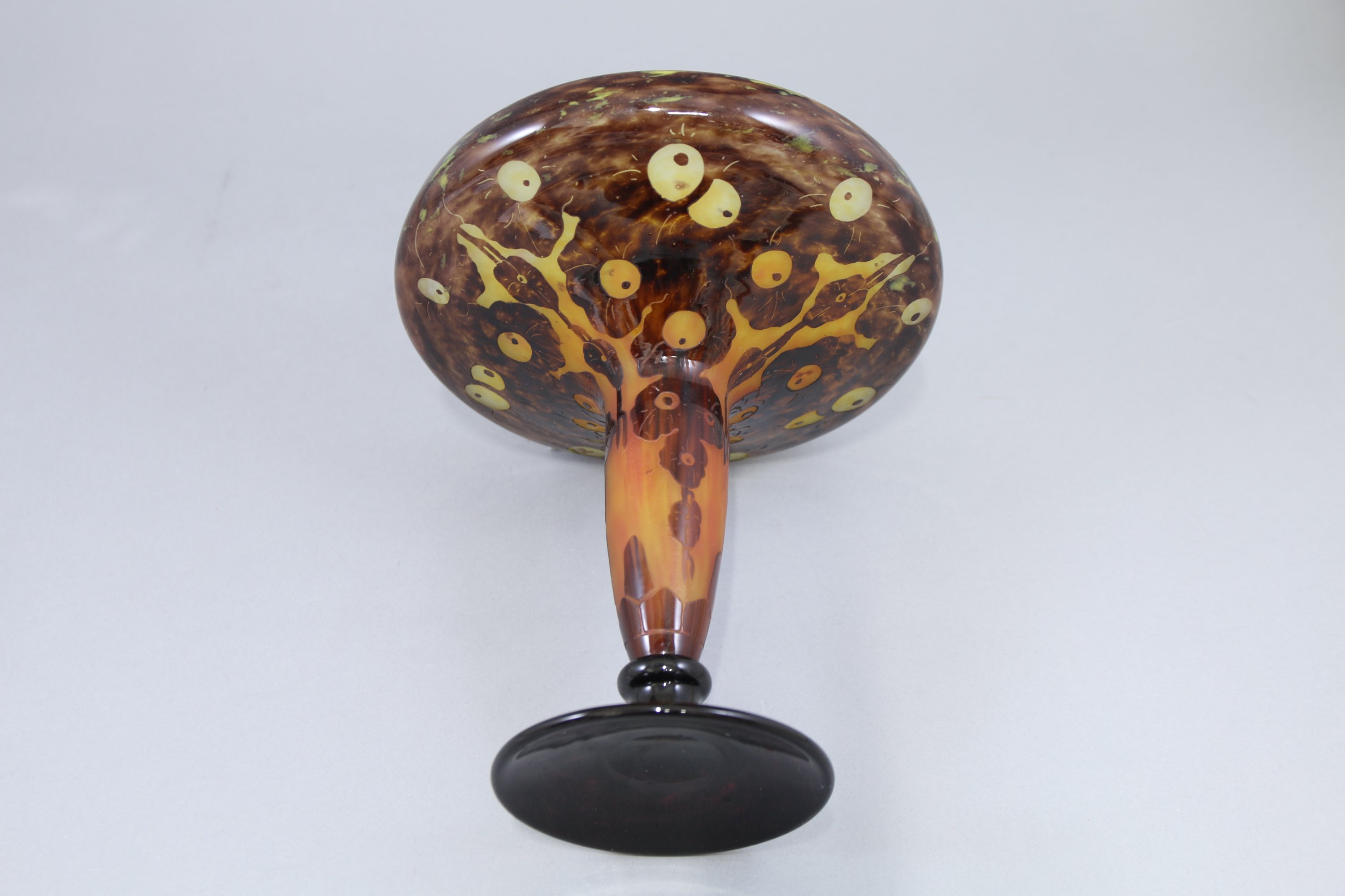 Verre multicouche à décor dégagé à l'acide de glycines brune sur un fond jaune marmoréen.