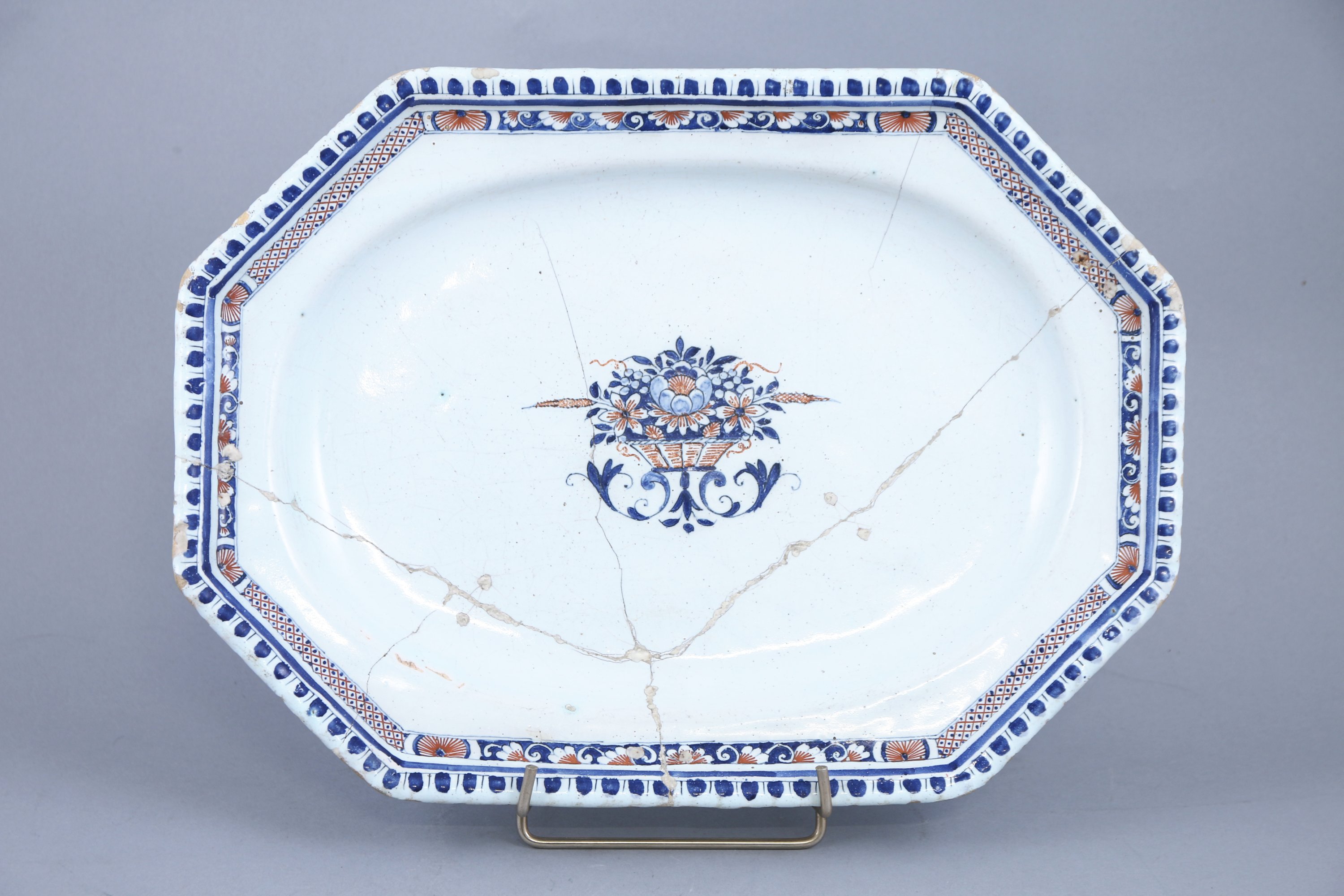 Faïence blanche à décor émaillé polychrome d'une panière fleurie au centre et l'aile ornée de cartouches de croisillons et motifs végétaux.