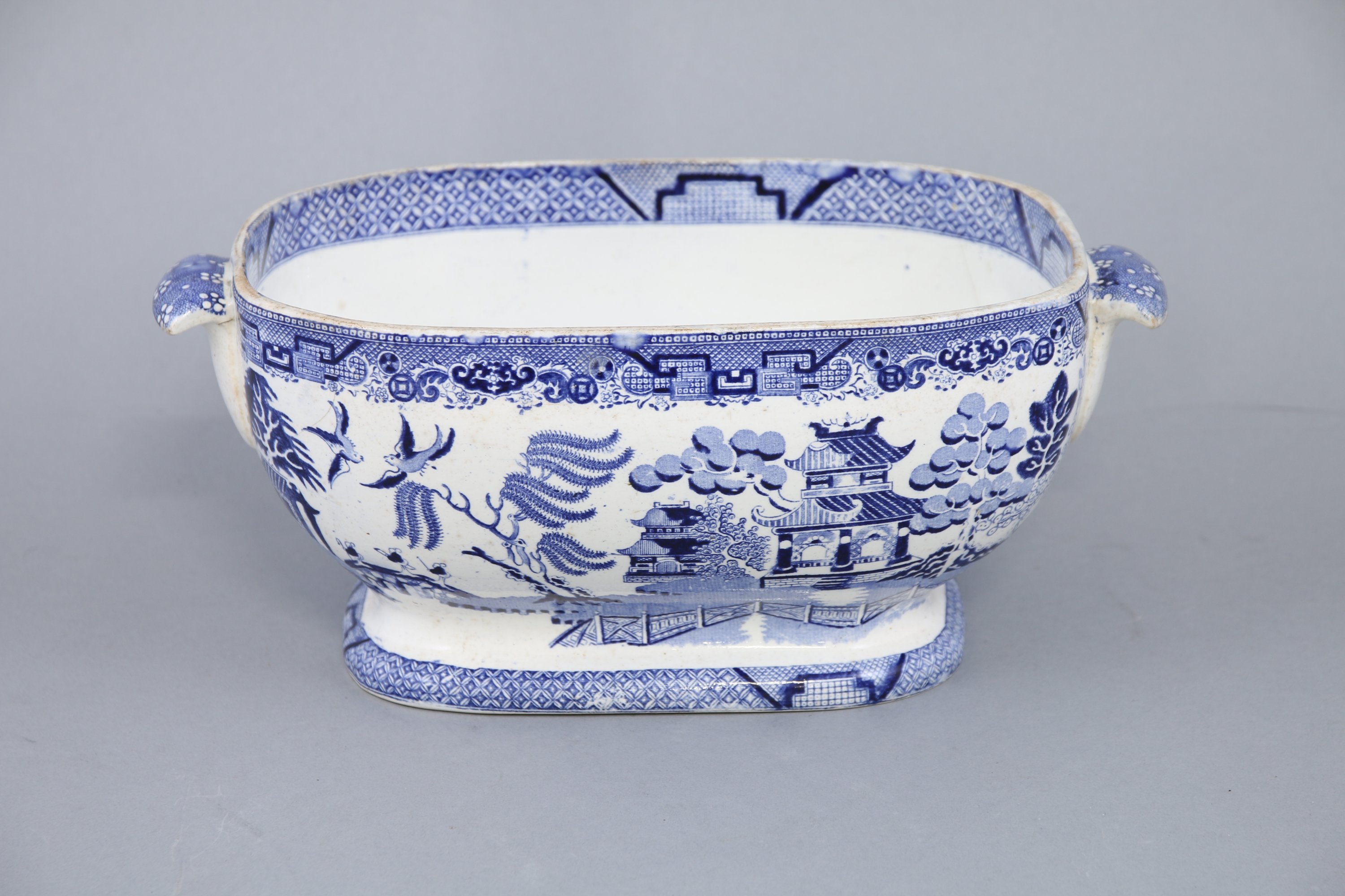 Joint : Angleterre - XIXe siècle. Soupière en faïence bleue et blanche dans le goût chinois à décor d'oiseaux et de scènes de palais. Haut. 14 Larg. 32,5 Prof. 18 cm. (accidents et restaurations).