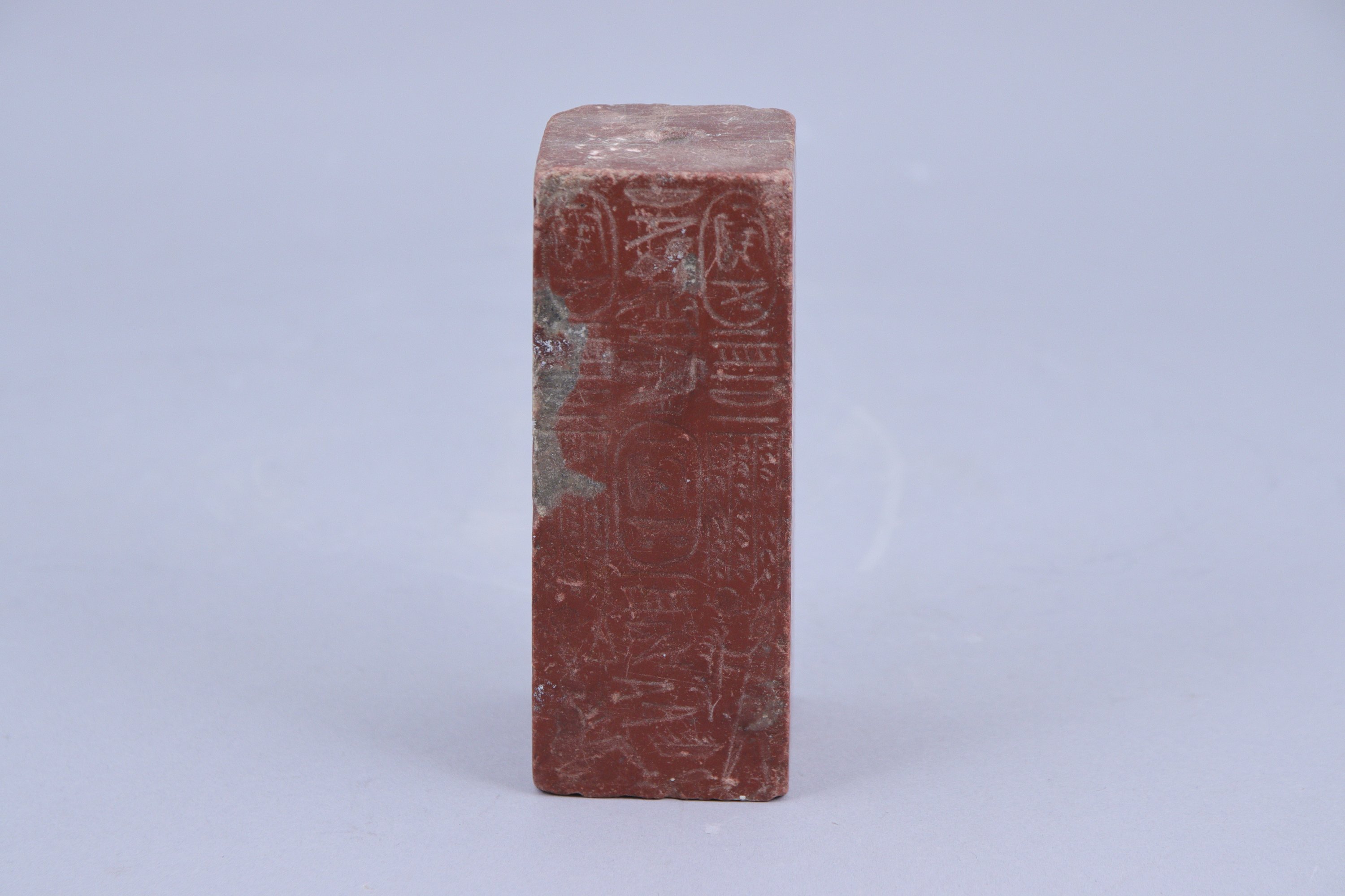 Pierre rouge orné sur ses quatre faces de hiéroglyphes dans le style antique, dont celui de Ramsès II.
