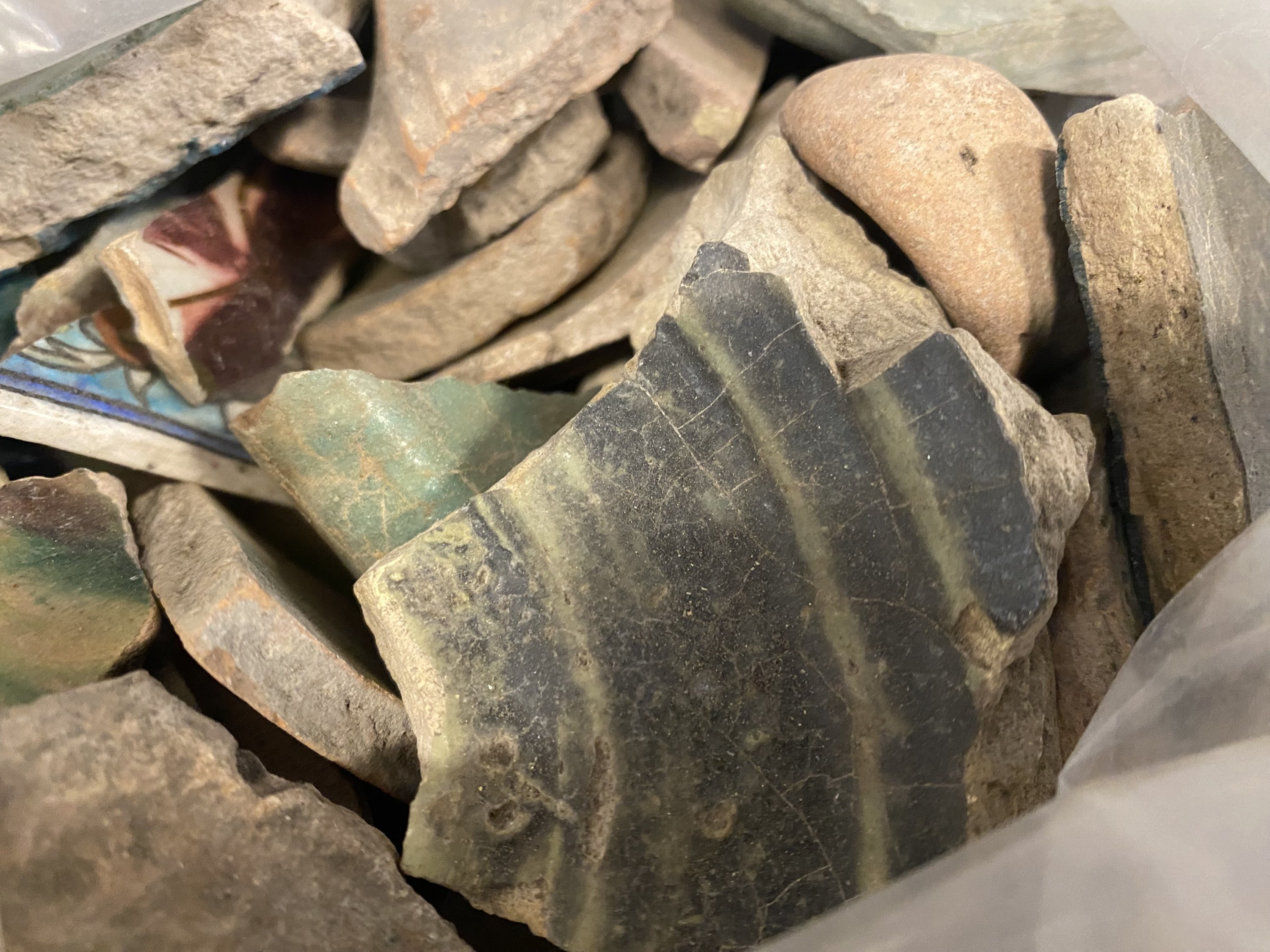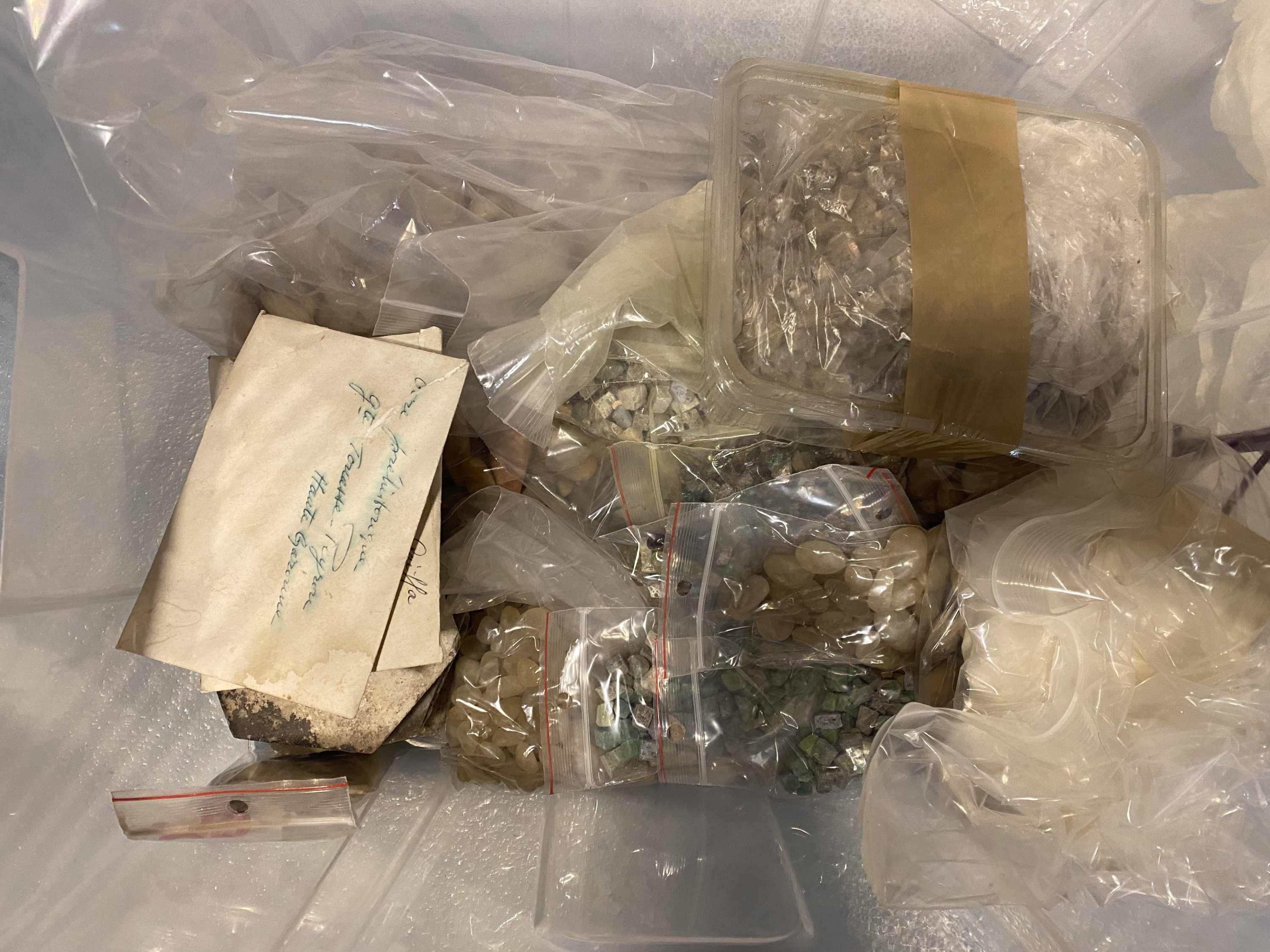 quatre carreaux hexagonaux en marbre (10 cm), des sachets de tesselles de mosaïques en verre et de galets de quartz provenant du « Désert du Hedjaz -Maann » d’après une étiquette. Un sachet de céramiques glaçurées, une enveloppe de « fards antique. Caiffa », une enveloppe de « ocre préhistorique, gte Touasse-Peyrou, Haute Garonne » une boîte avec des pigments et un sachet avec une feuille repliée contenant de la poudre d’or.