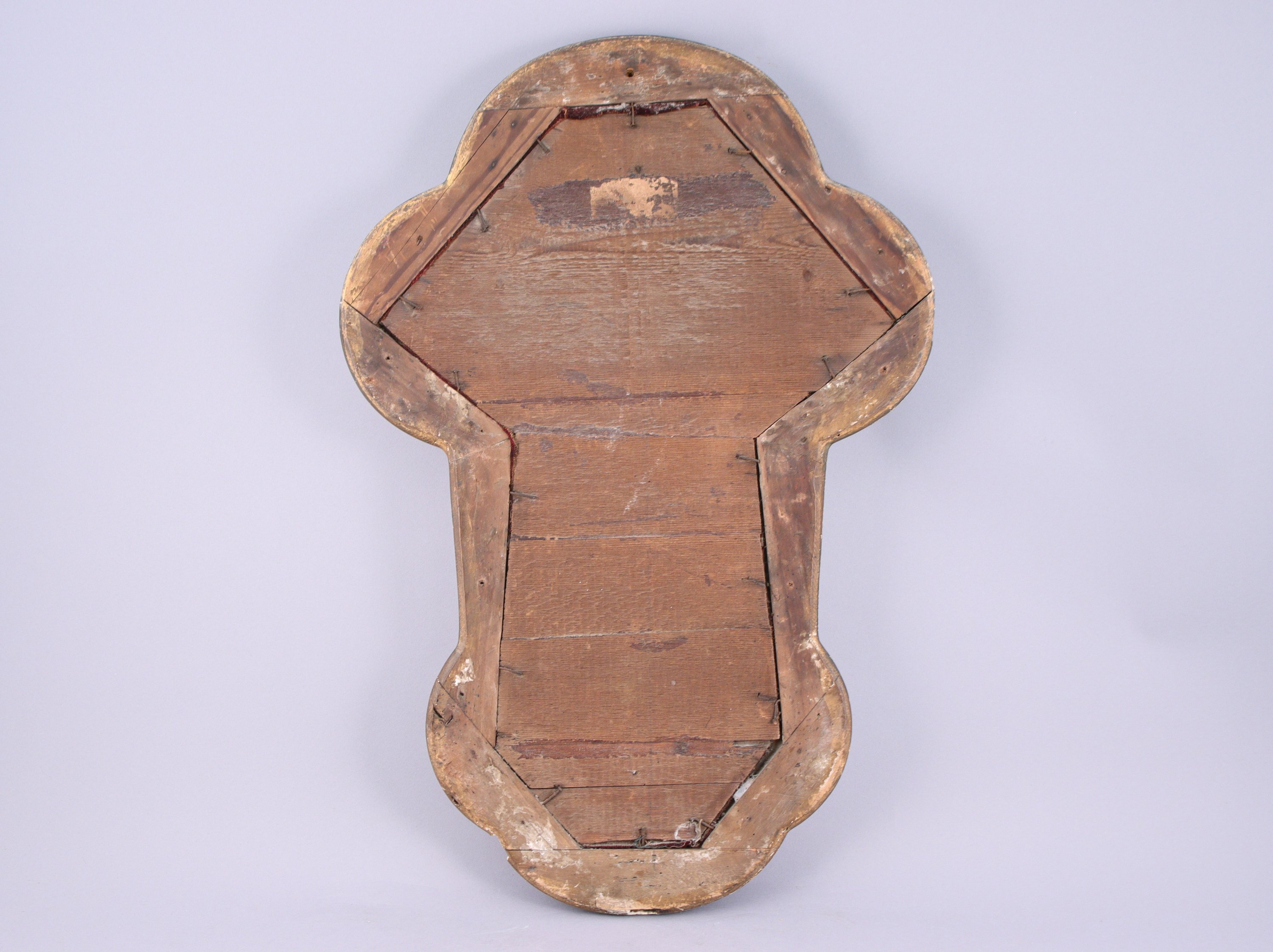 Statuette en plâtre doré sur une croix en bois portant une gravure « INRI » fixée sur un fond en velours rouge, dans un cadre en bois doré ornementé formant un Panneau-Crucifix.