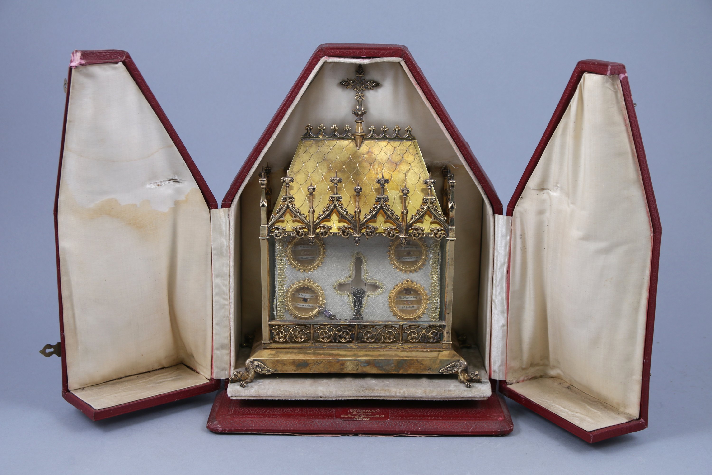 De forme rectangulaire, elle est sommée d'une croix latine sur un couvercle en forme de toiture à fleurons. Il est retenu par des pinacles et baies trilobées. Elle enchâsse à l'intérieur les reliques supposées de "Saint Louis.roi", "Saint Charles Borr", "Saint Jacques", "Saint Marcellin", "Sainte Eugénie", "Sainte Rose de Viterbe", "B.Maria.Vierge", Saint Joseph" et une croix. Elle repose sur quatre pieds en forme de gargouilles.