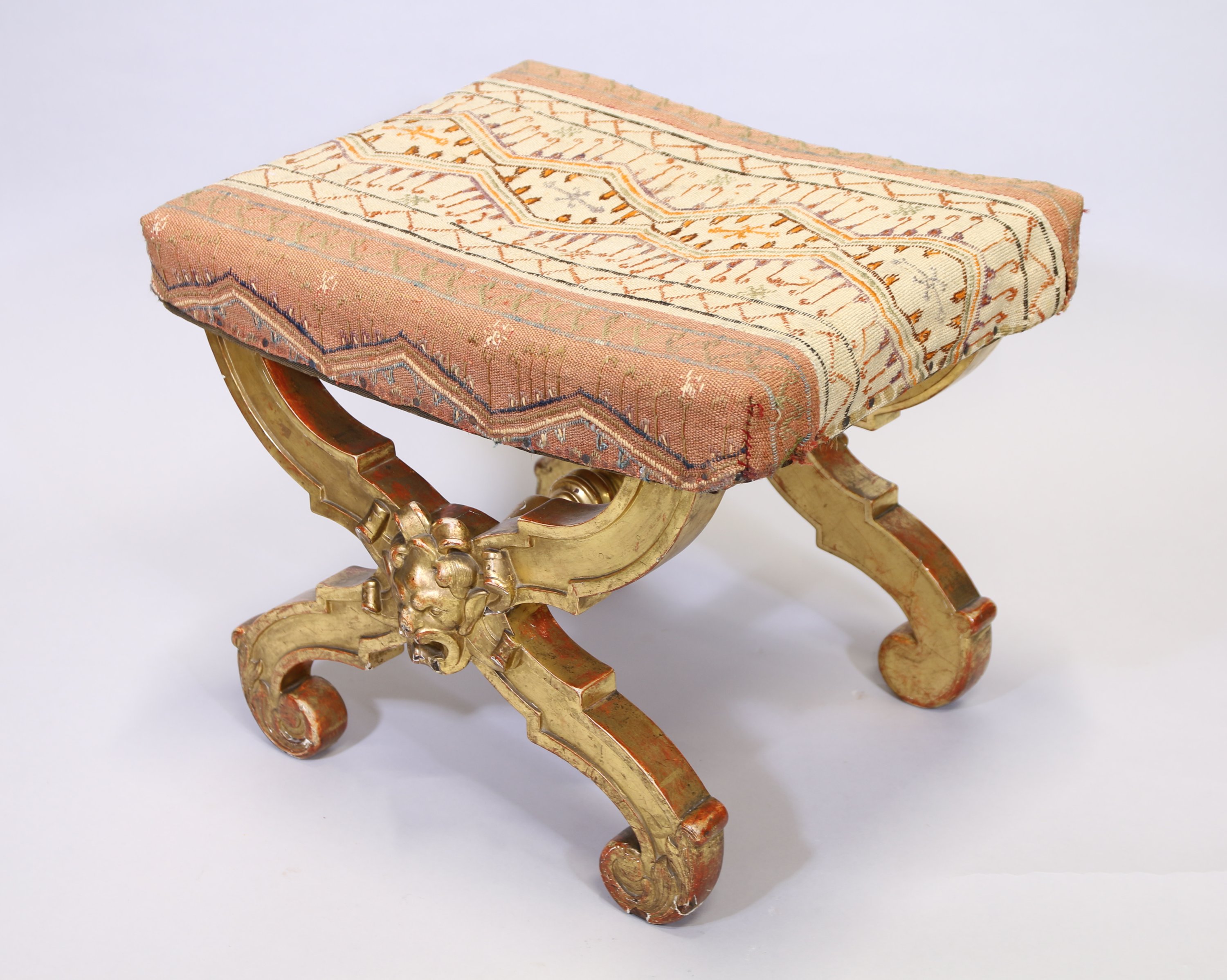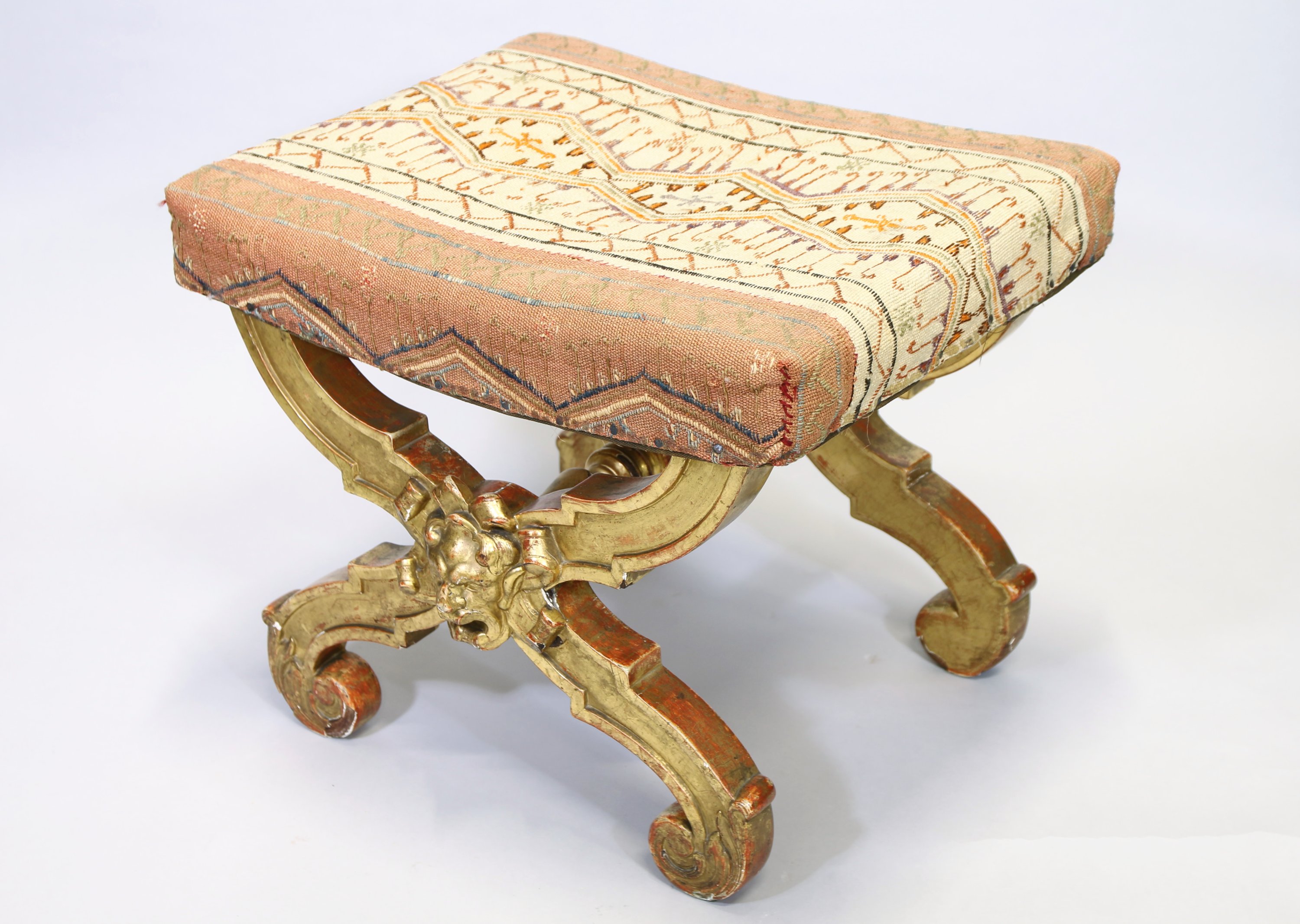 Quatre pieds en X décorés au centre d'une tête de faune et terminés par des feuilles d'acanthe. Ils sont réunis par une barre d'entrejambe en bois tourné.