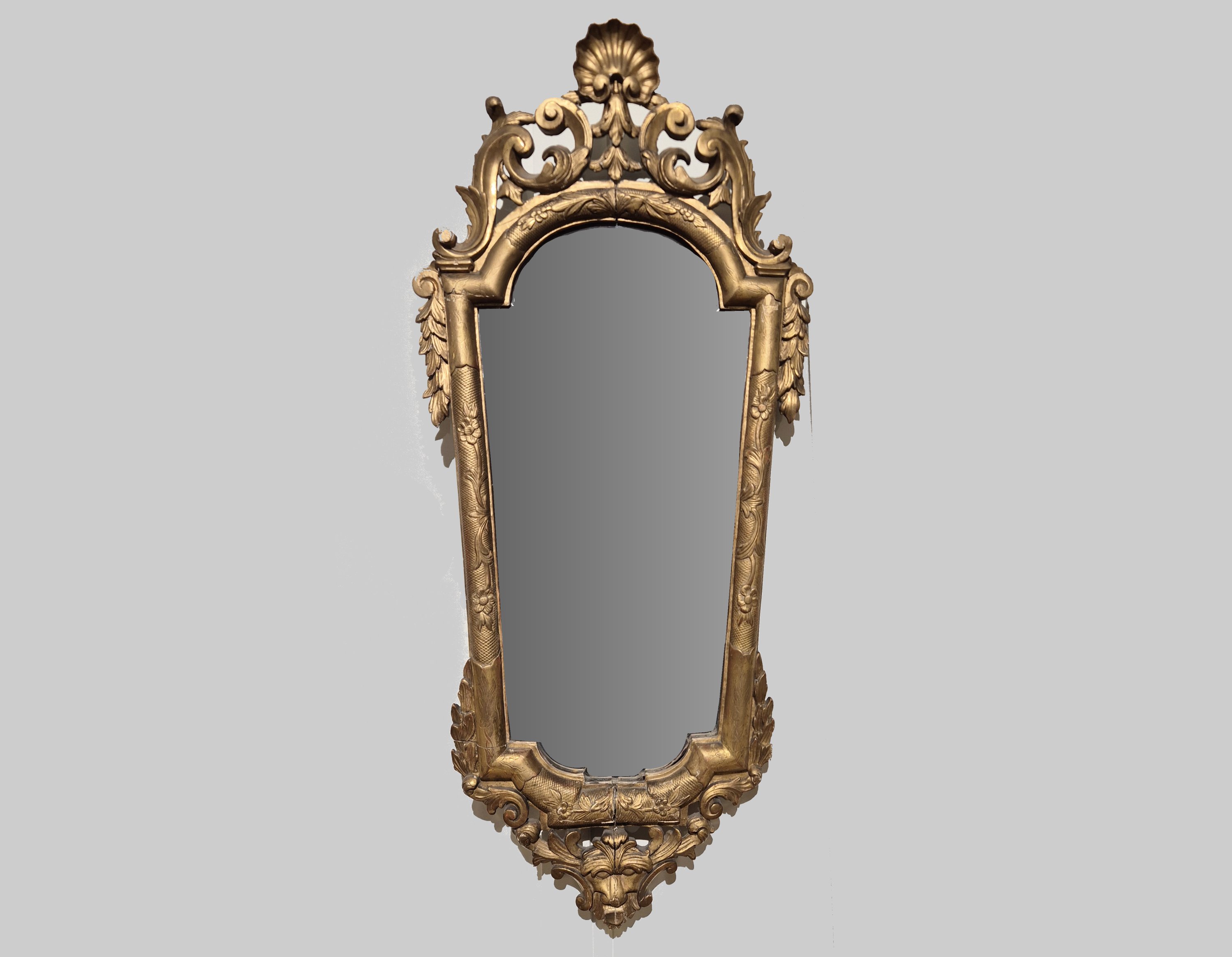 Il est coiffé d'un fronton ajouré à décor d'une coquille entourée de rinceaux et feuilles d'acanthe se prolongeant sur les côtés par des motifs floraux sur fond de croisillons. La partie inférieure se termine par un masque grimaçant dans des feuillages.