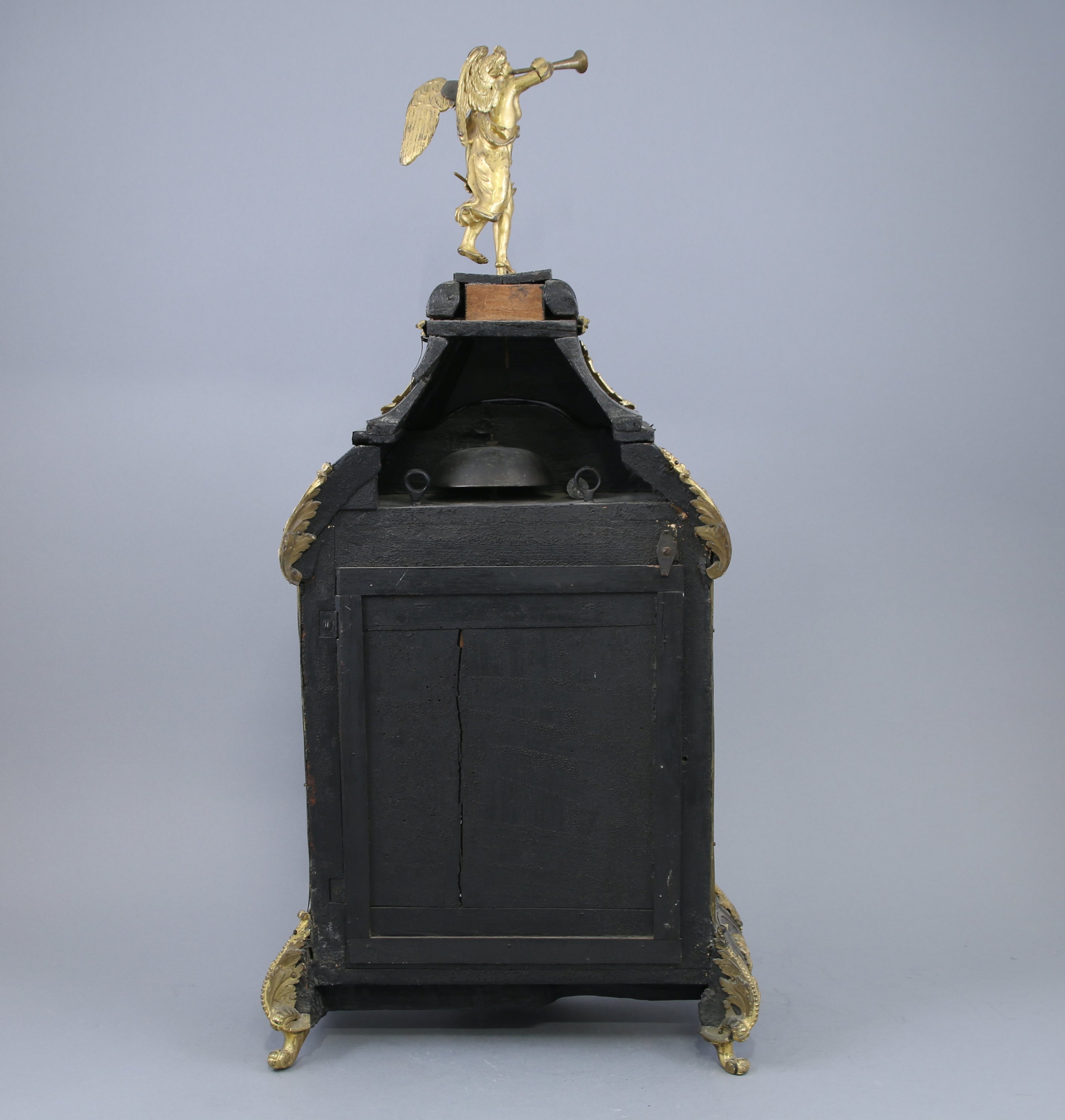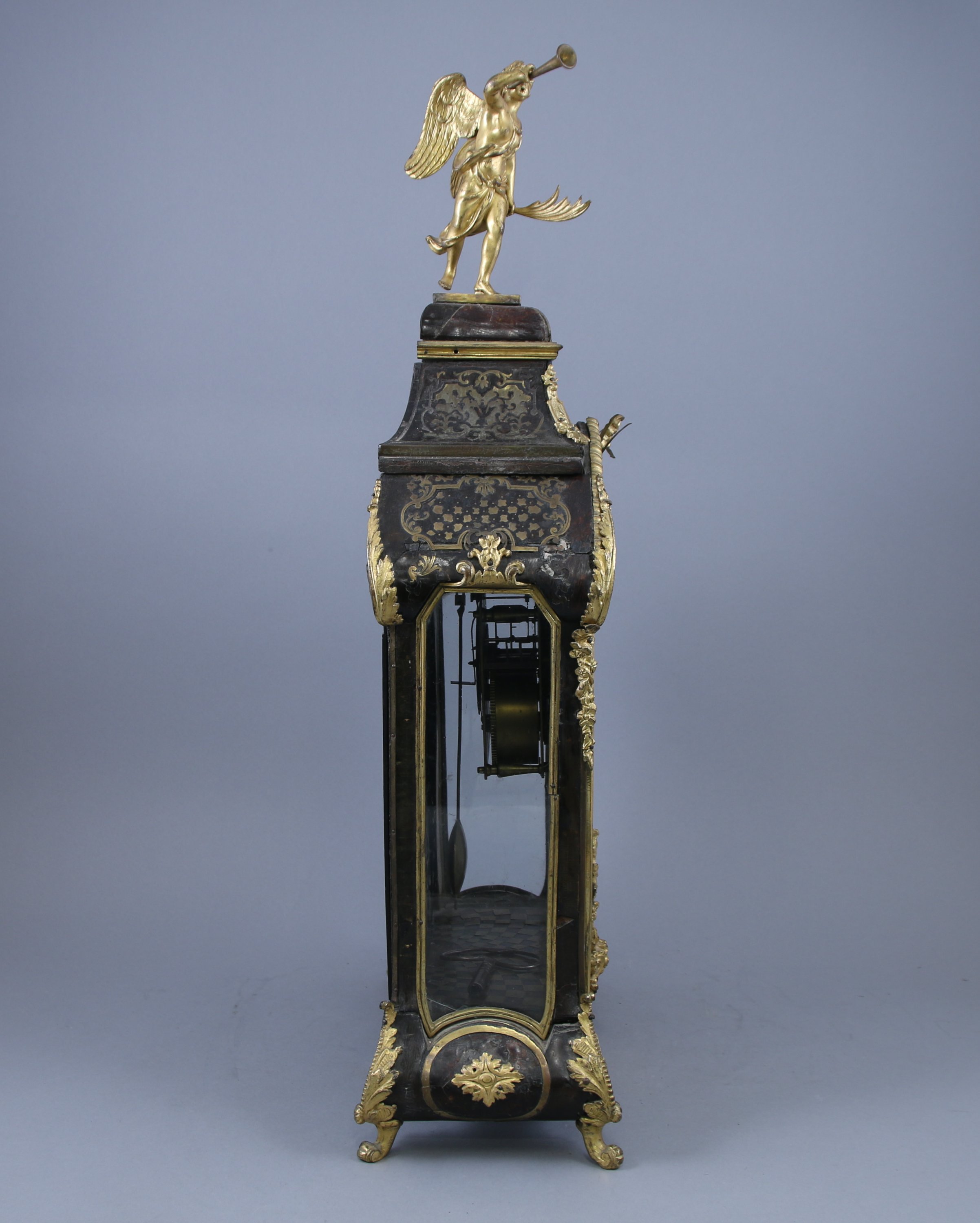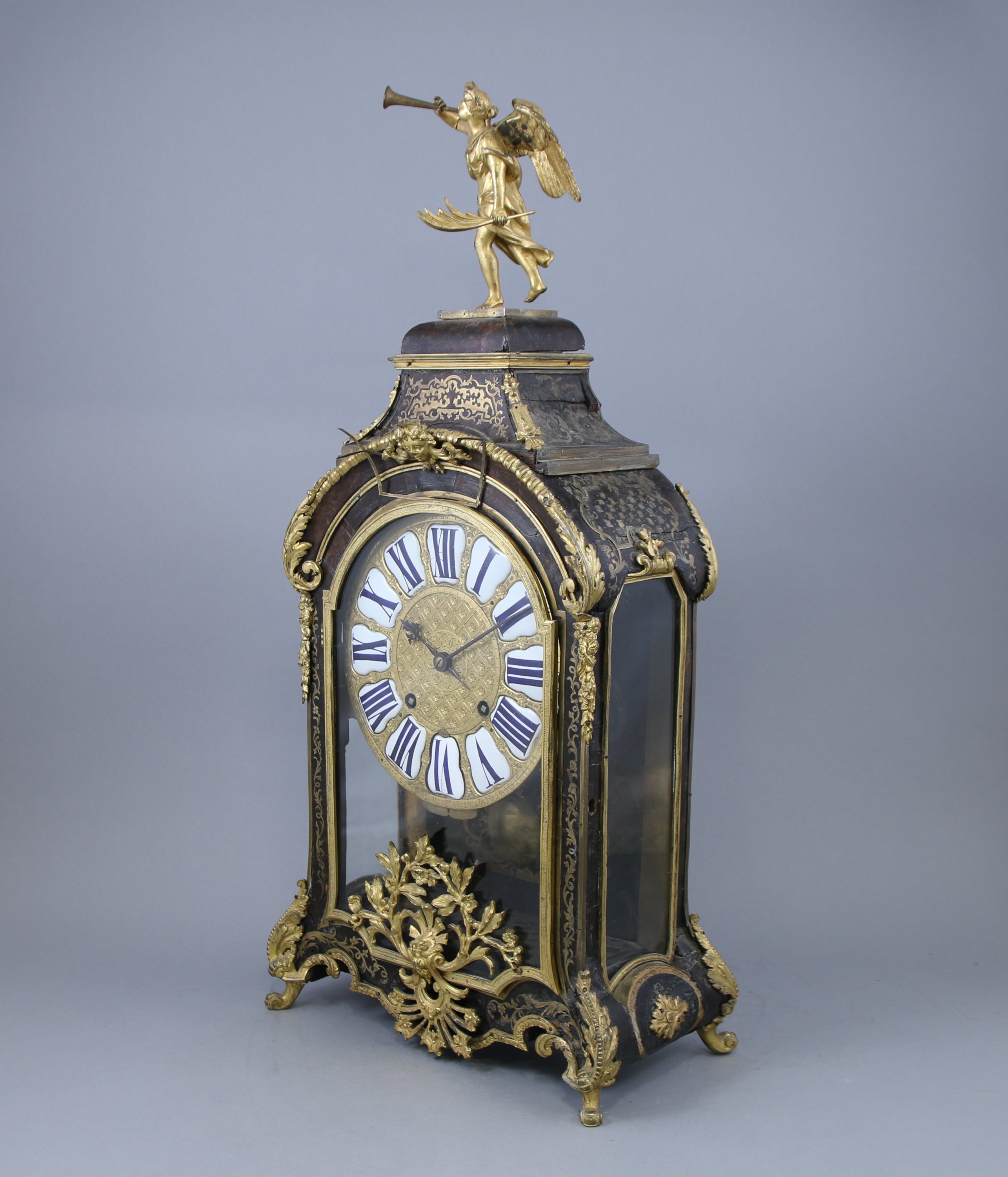 Le cadran indiquant les heures par des cartouches aux chiffres romains. La partie supérieure sommée d'une renommée. Le cul de lampe à décor d'une figure d'Apollon.