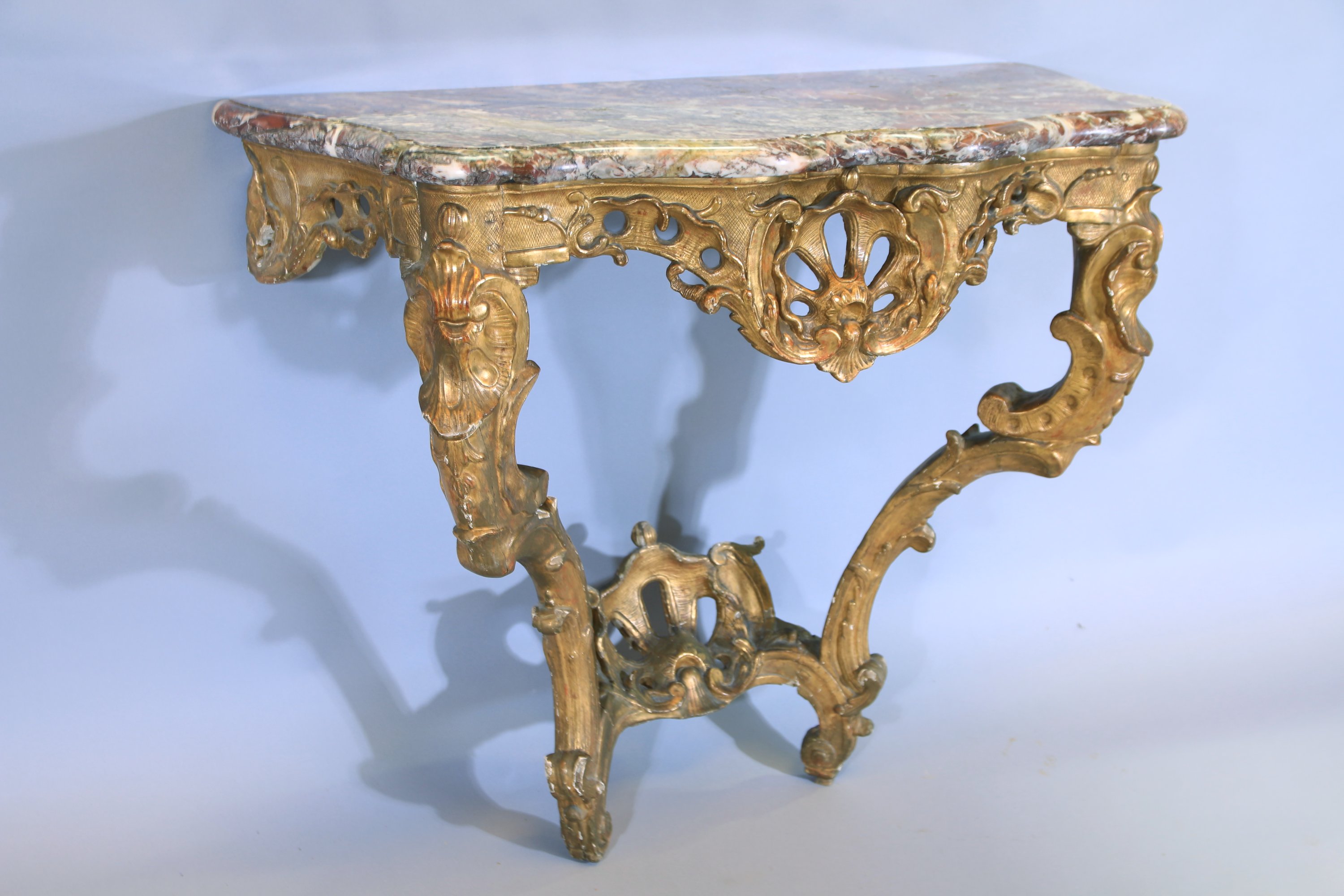 A riche décor en partie ajouré de rinceaux coquilles et acanthes sur fond de treillages. Pieds cambrés reliés par une entretoise ornée d'une coquille stylisée et ajourée.