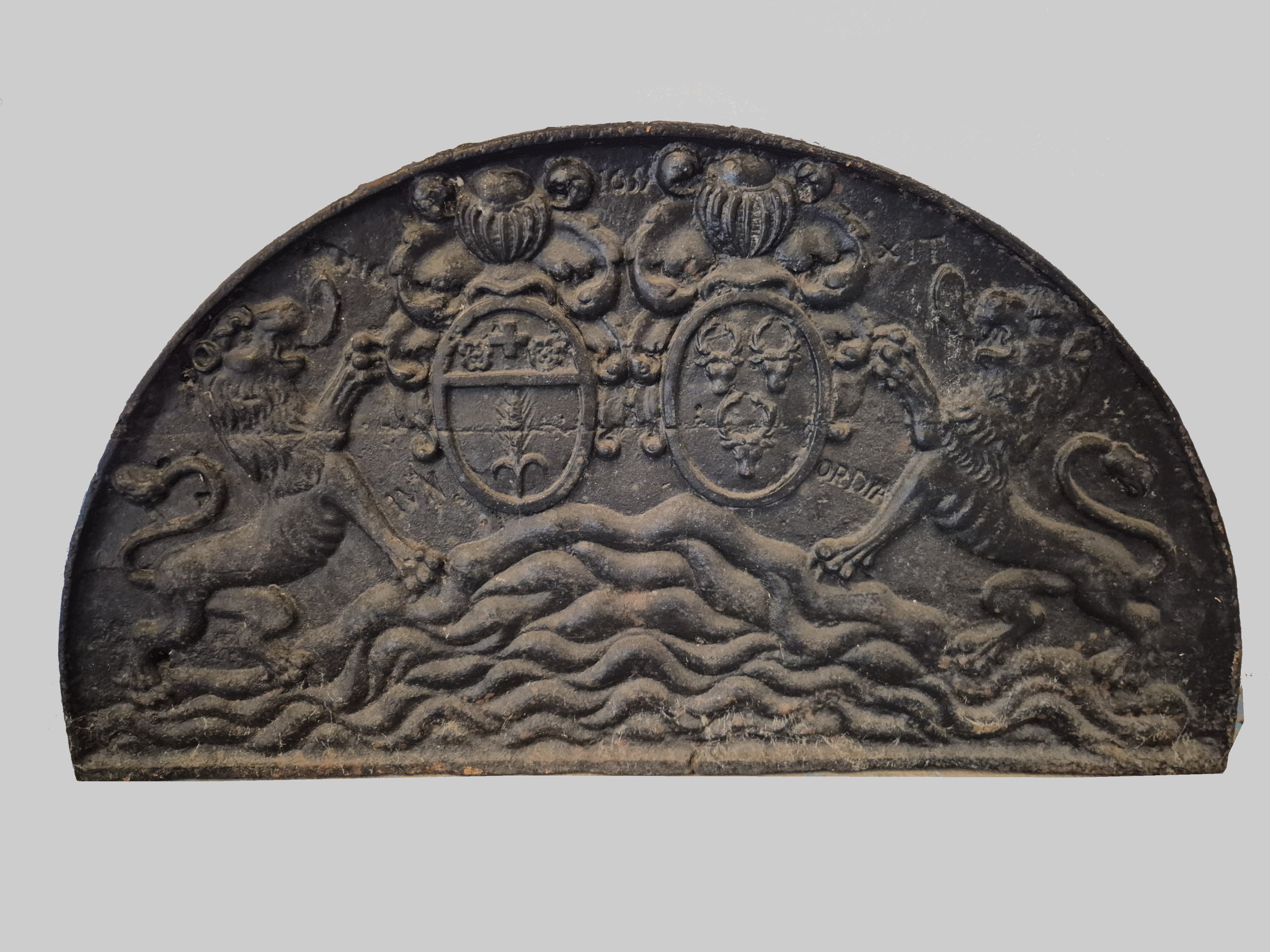 La partie supérieure en plein cintre, elle présente un décor de deux lions affrontés à armes d'alliances, notamment de la famille Richoufftz de Manin.