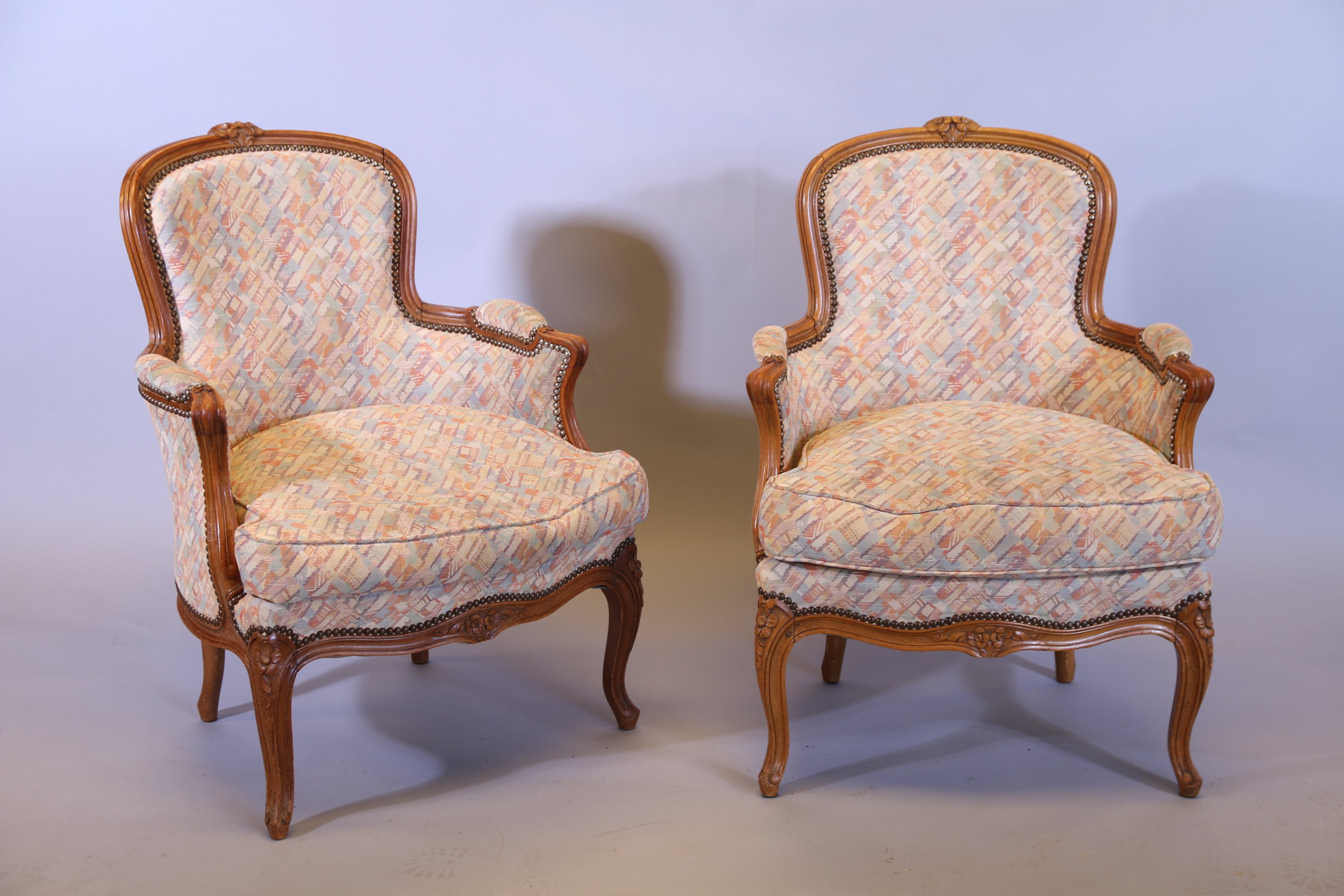 Dossiers surmontés de fleurs, accotoirs mouvementés et en retrait terminés en crosse, ceinture chantournée et jonctions des pieds à décors de fleurs. Elles reposent sur quatres pieds galbés.