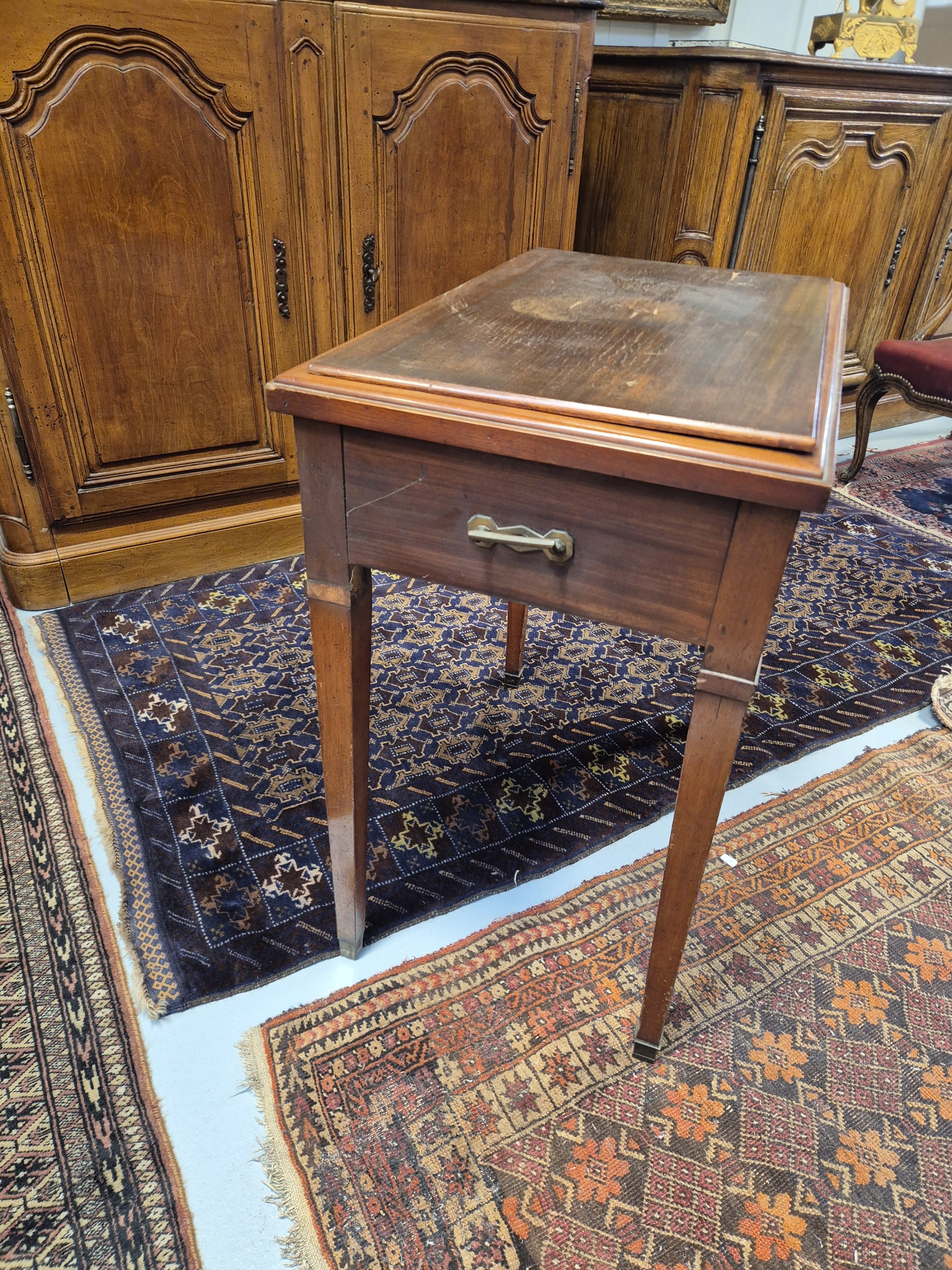 De forme rectangulaire, elle repose sur quatre pieds en gaine sabotés de laiton. Recouvert d'un couvercle en placage d'acajou.
