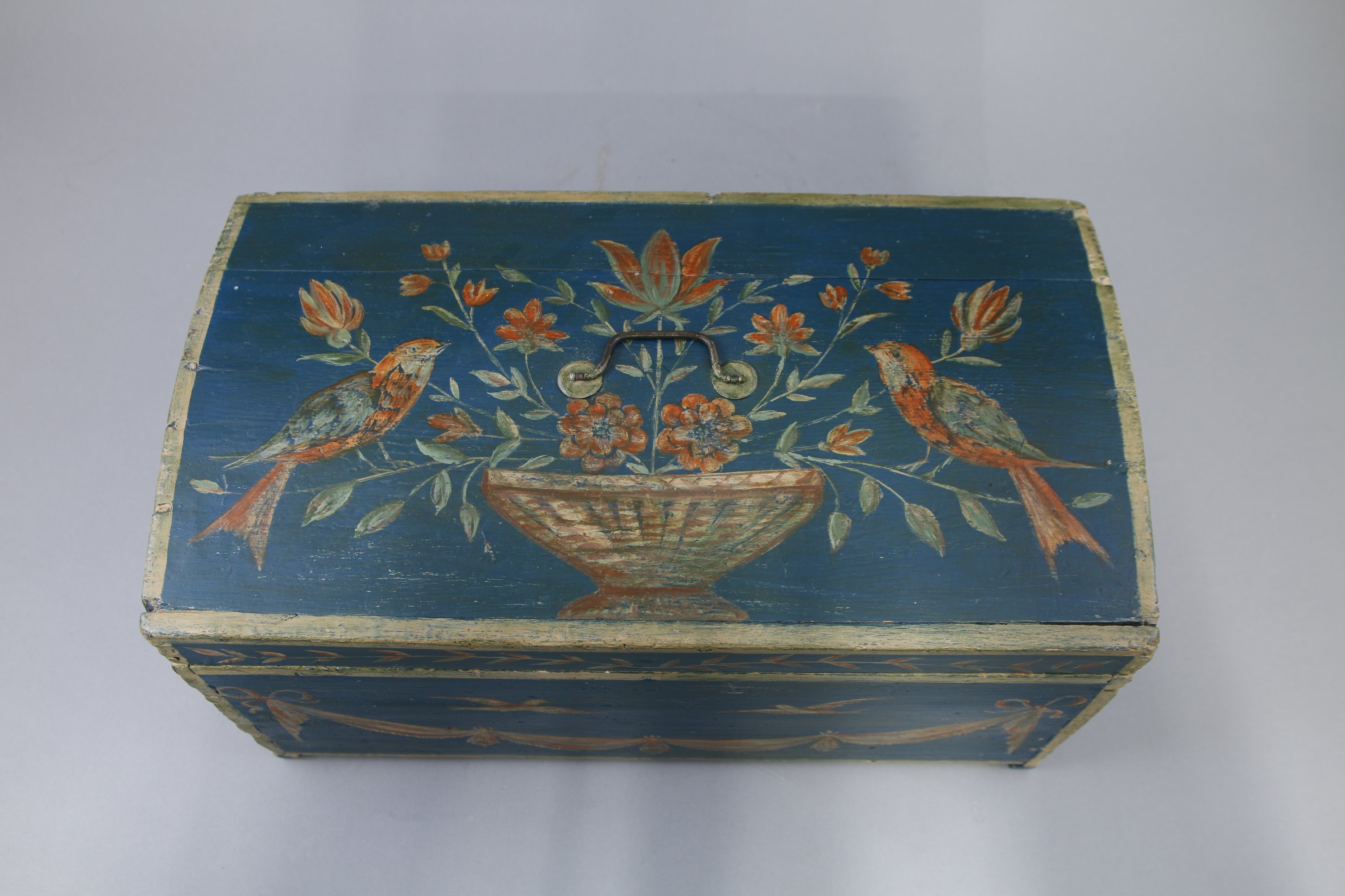 Le couvercle bombé à décor de deux oiseaux autour d'un vase fleuri. La façade ornée de guirlandes.