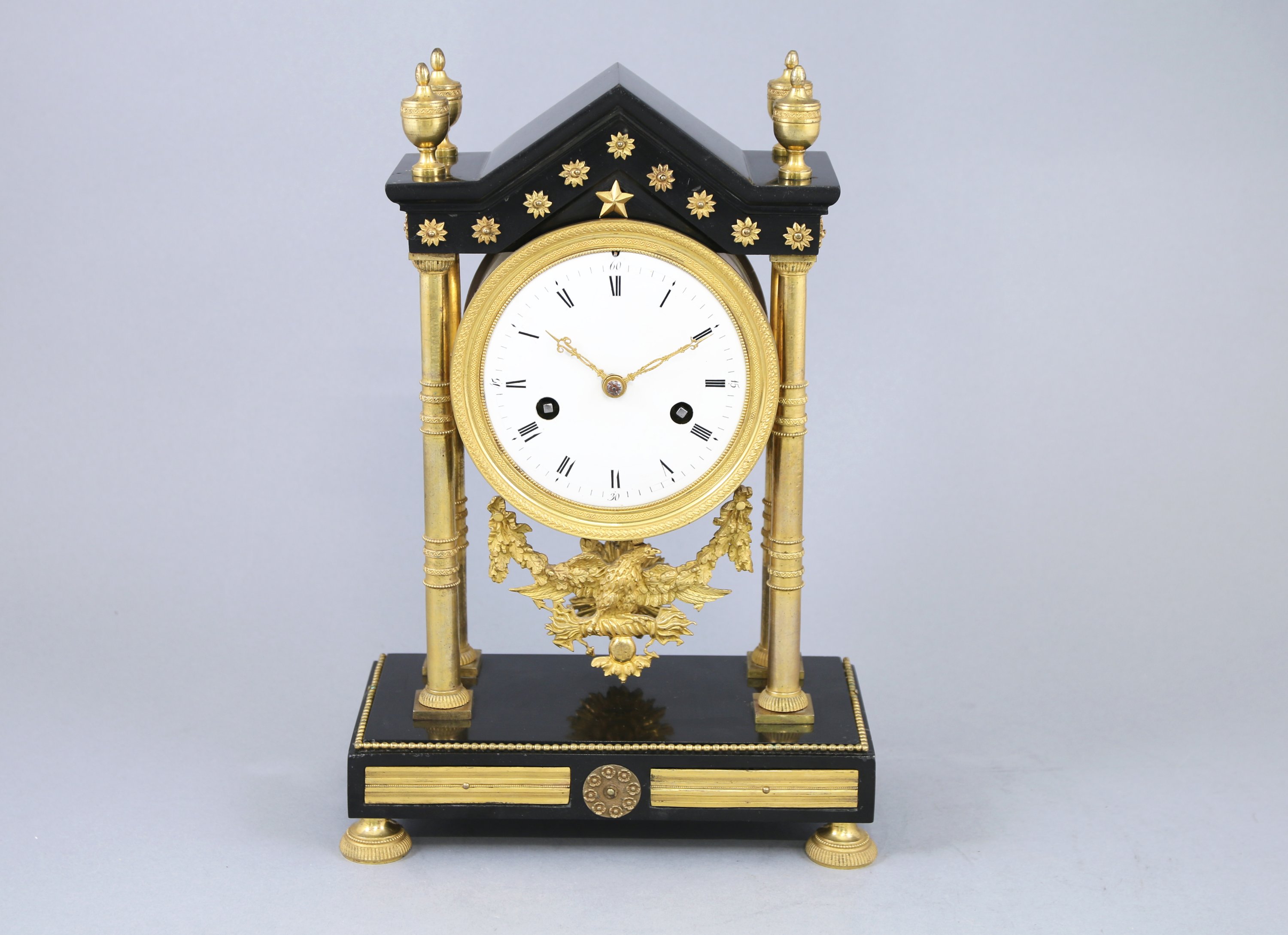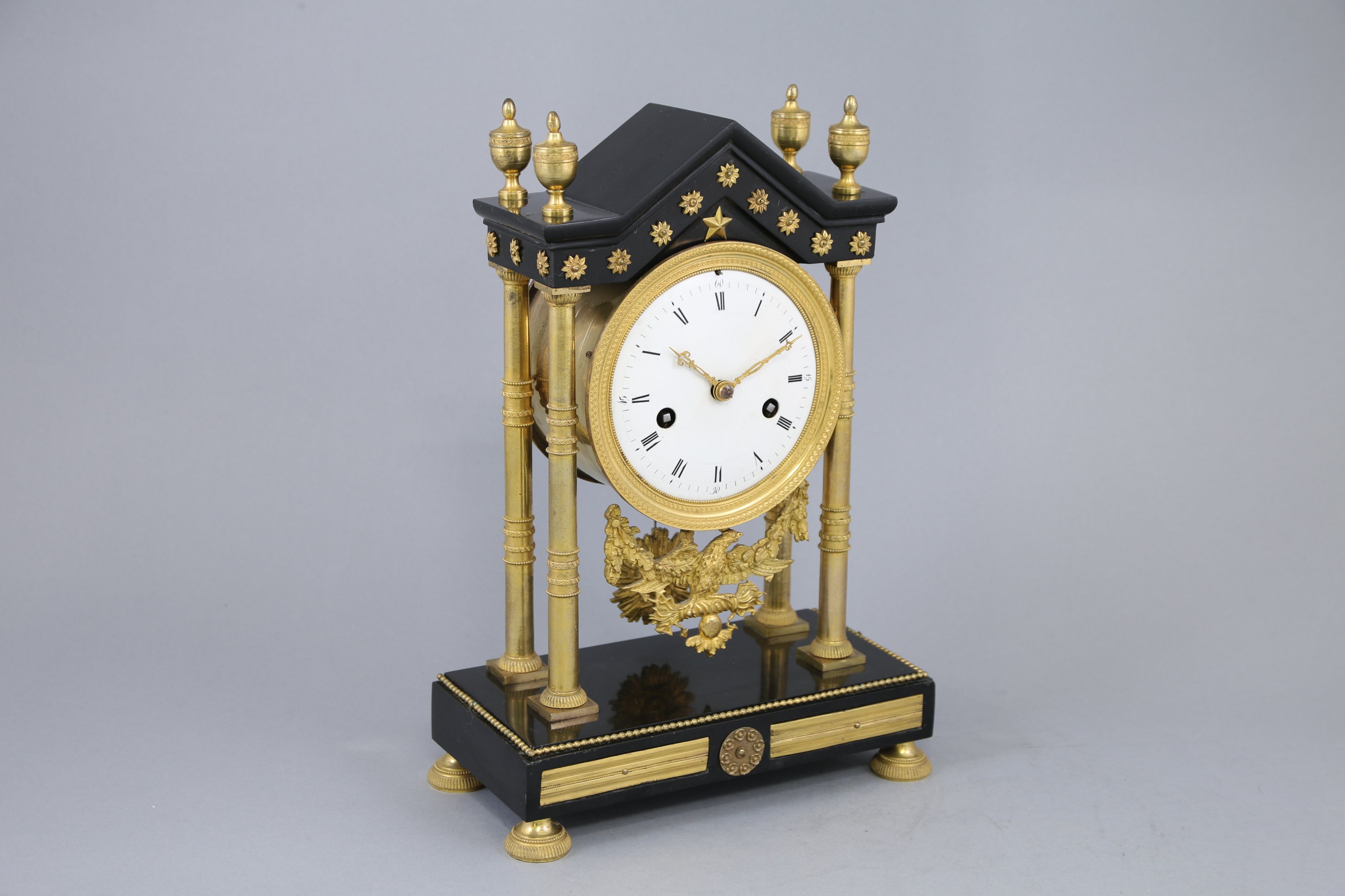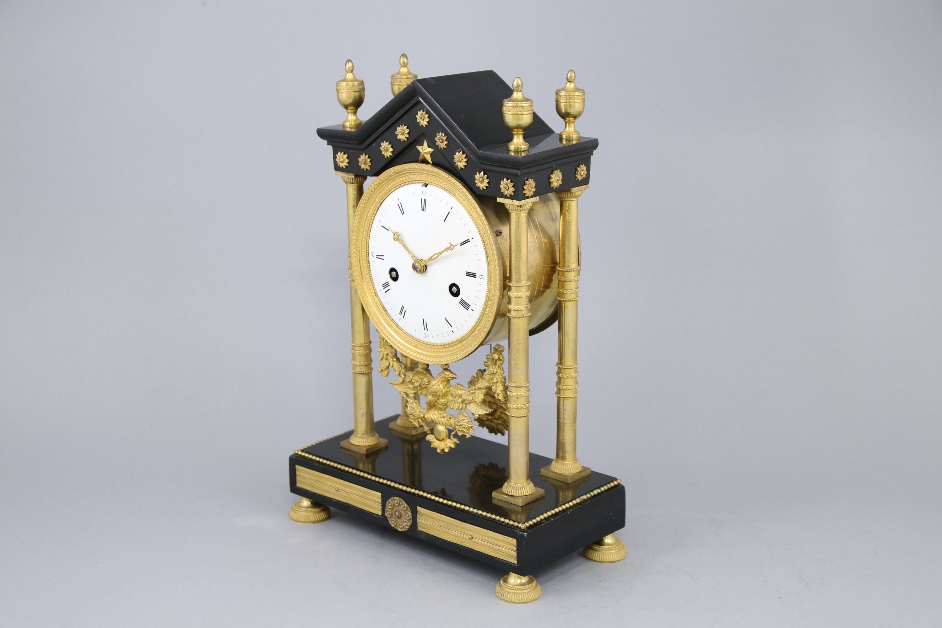 Le cadran émaillé blanc indiquant les heures par des chiffres romains, les minutes par un chemin de fer. Il est encadré par quatre colonnes baguées et se termine par une aigle dans un entourage de feuilles de chêne. La base rectangulaire soulignée d'une frise de perles. Quatre pieds patins.