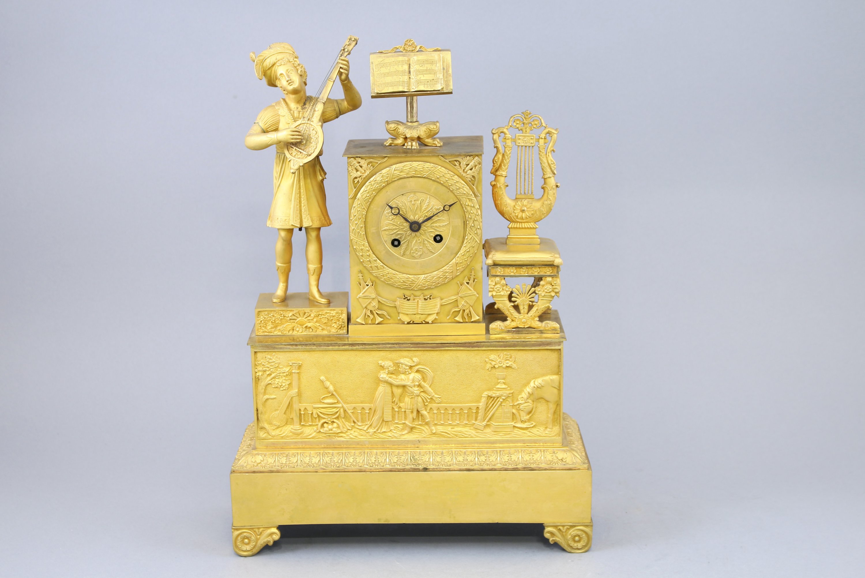 Le cadran indiquant les heures par des chiffres romains est inscrit dans une borne surmontée d'un lutrin et entourée d'un musicien et un tabouret à la lyre. La base rectangulaire soulignée de feuilles d'acanthe est ornée d'un bas-relief figurant un couple sur fond de balustrade et un cheval. Elle repose sur quatre pieds en enroulements.
