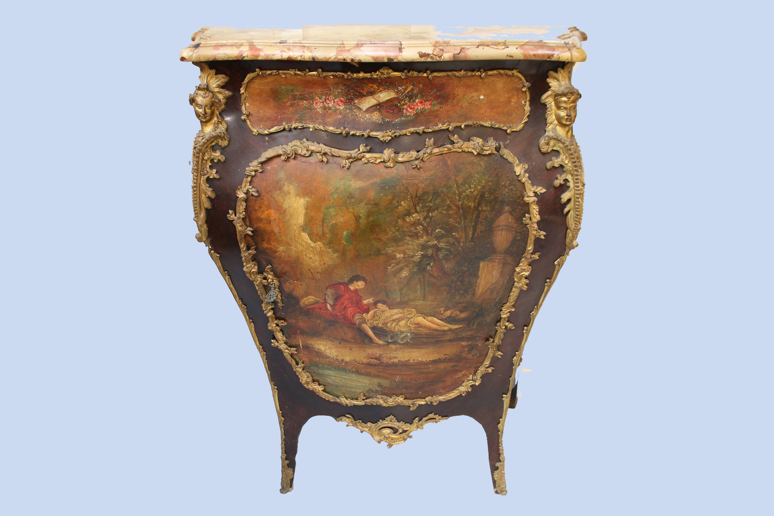 De forme bombée, il présente en façade un cartouche d'instruments de musique surmontant un vantail au décor d'une scène au couple près de l'eau.