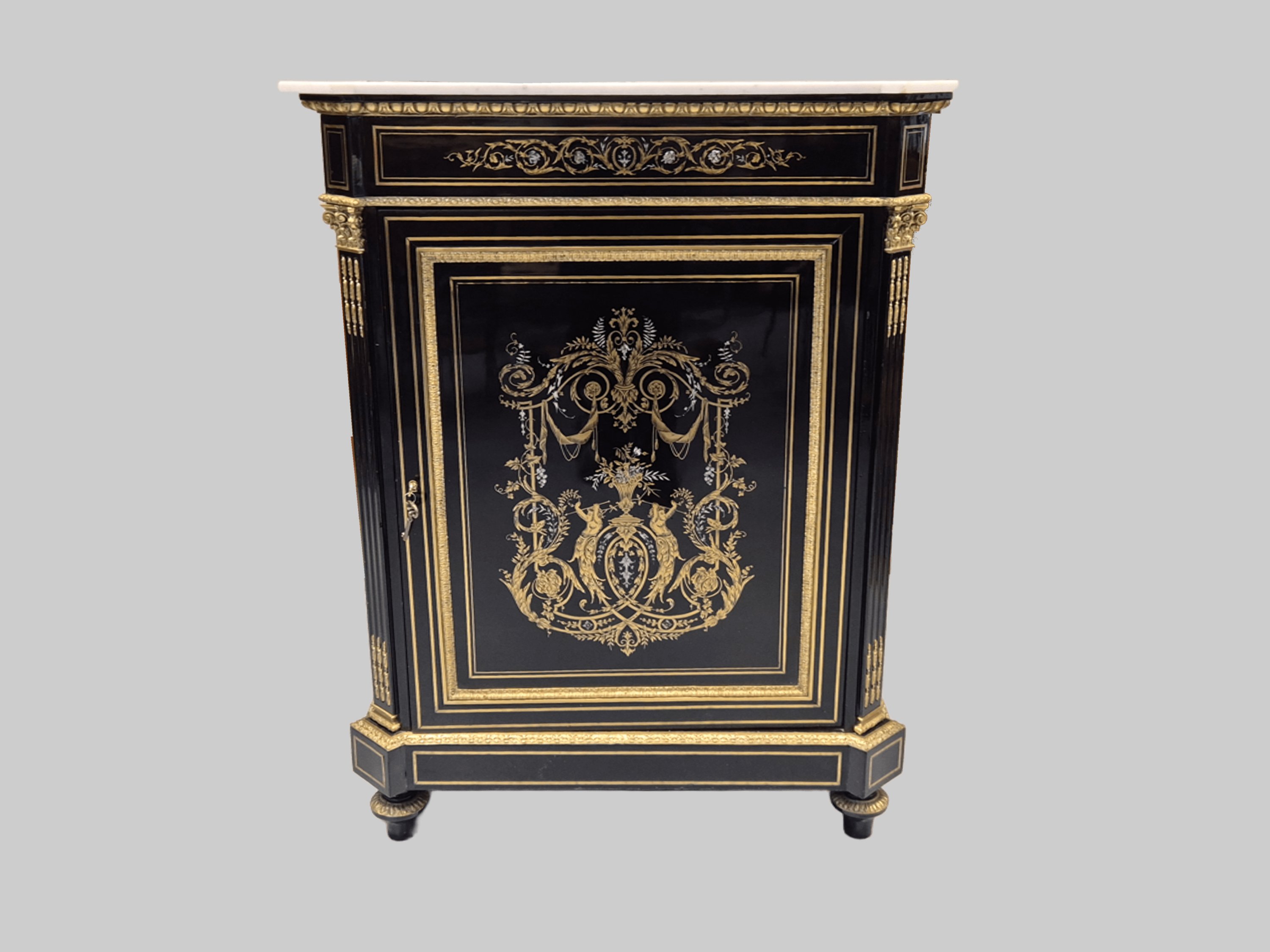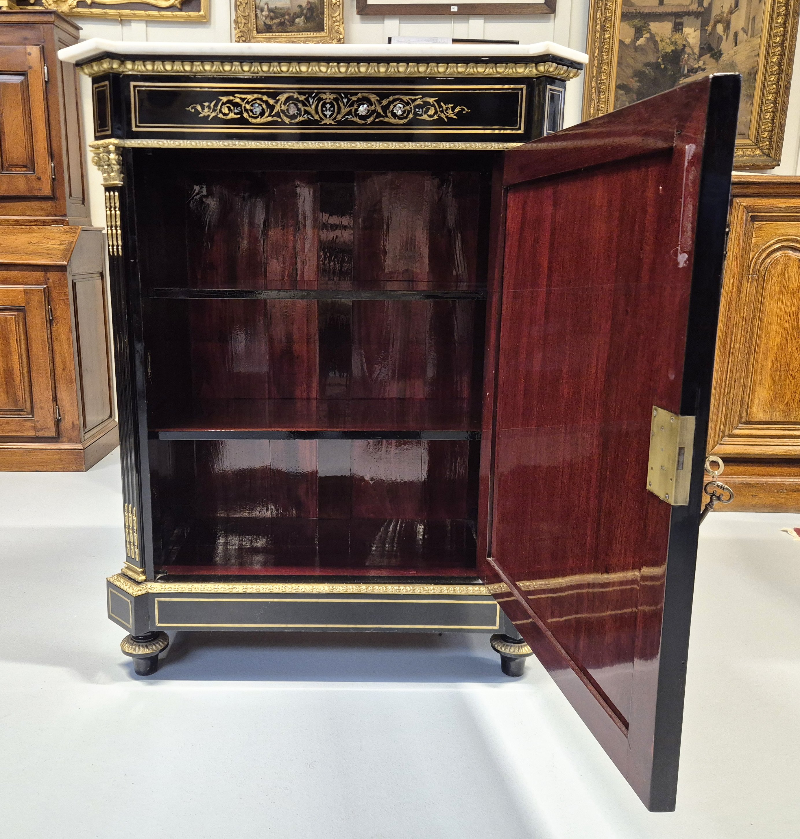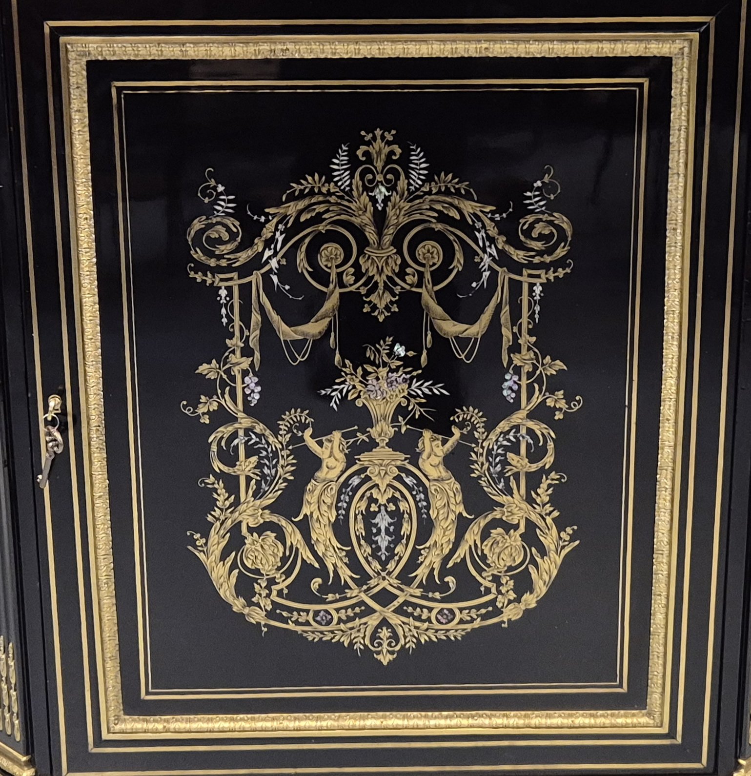Marqueterie de laiton et nacre sur fond de bois noirci.