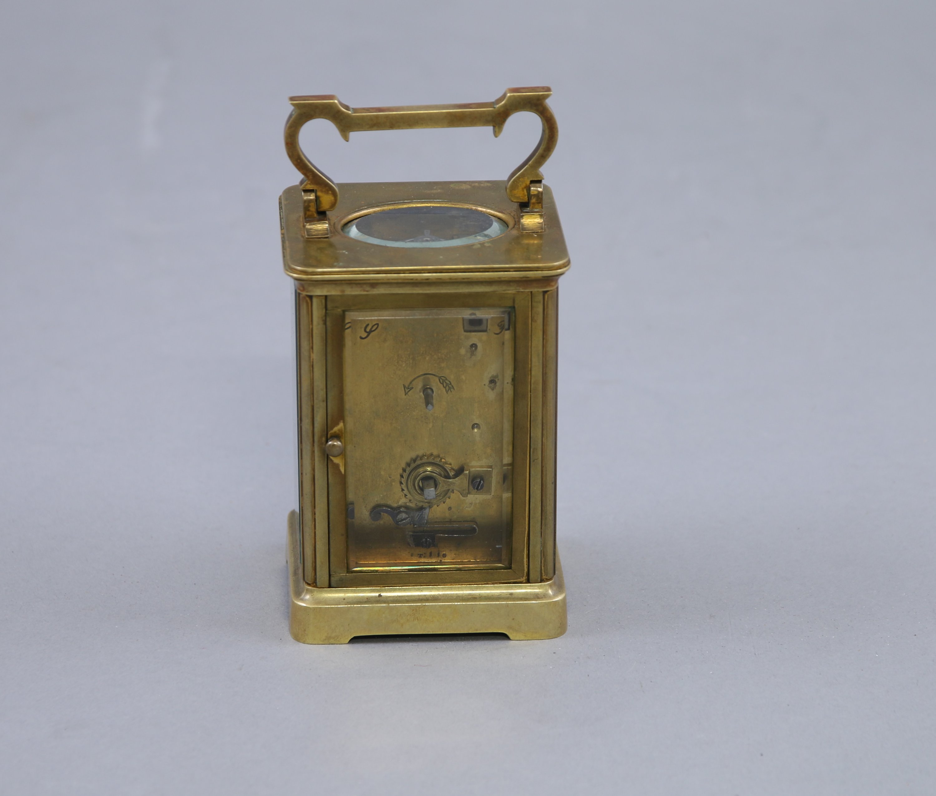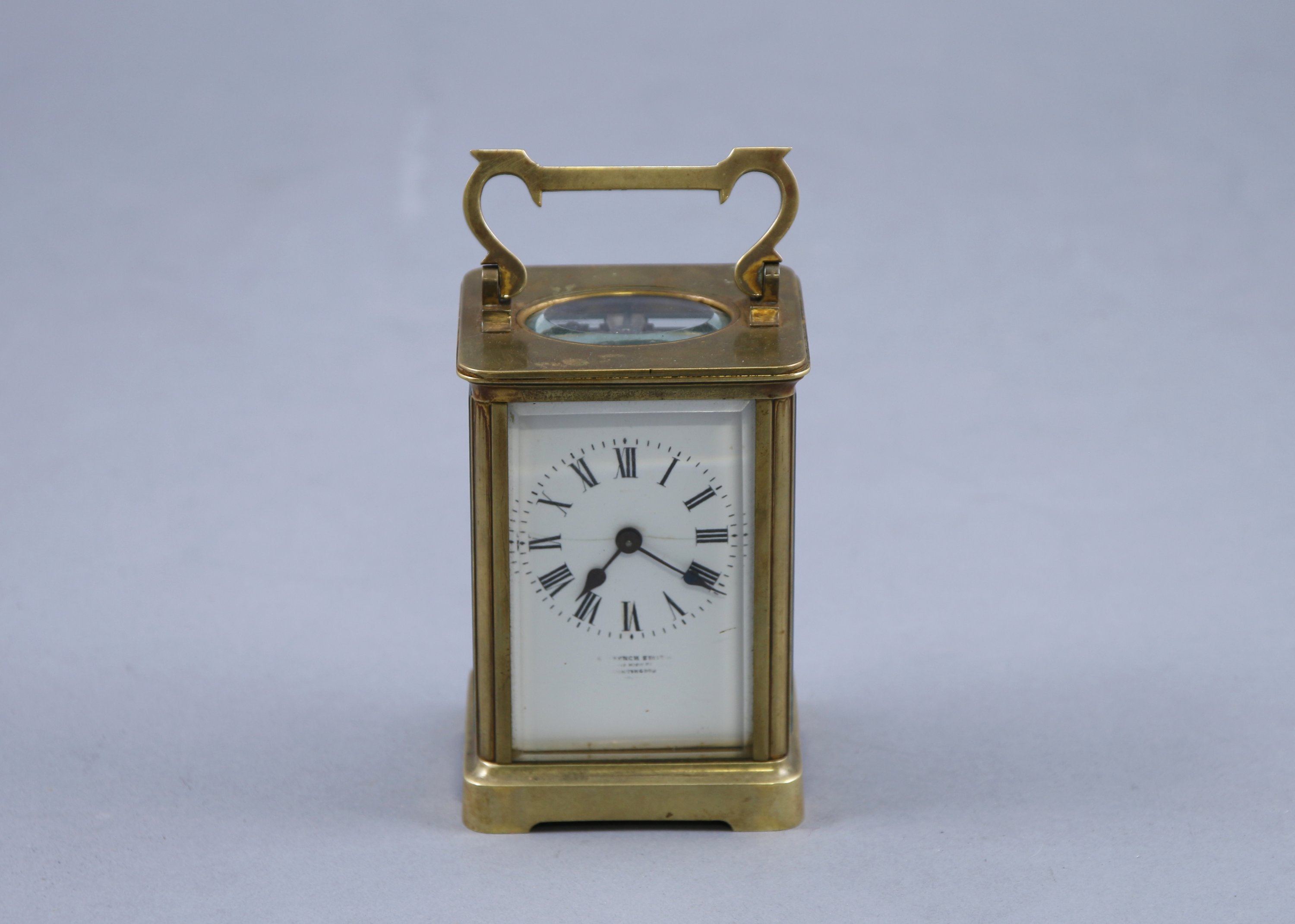 De forme cage à verre biseauté, il présente un cadran blanc indiquant les heures par des chiffres romains. Une poignée mobile.