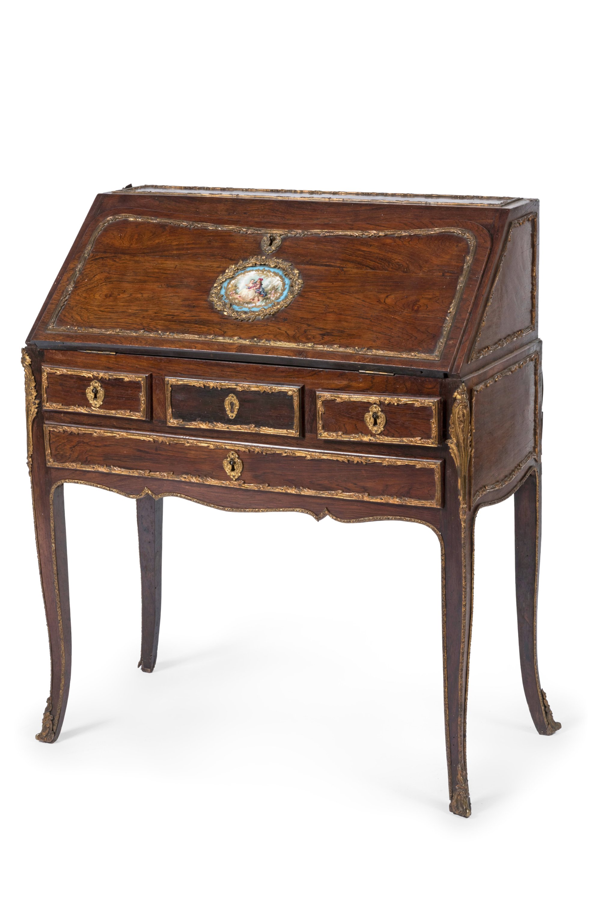 Les porcelaine ornée d'une scène galante sur fond de résineux. Il ouvre par un abattant découvrant à l'intérieur deux rangs de tiroirs surmontés par des niches. La ceinture ouvre par quatre tiroirs sur deux rangs. Il repose sur quatre pieds cambrés.