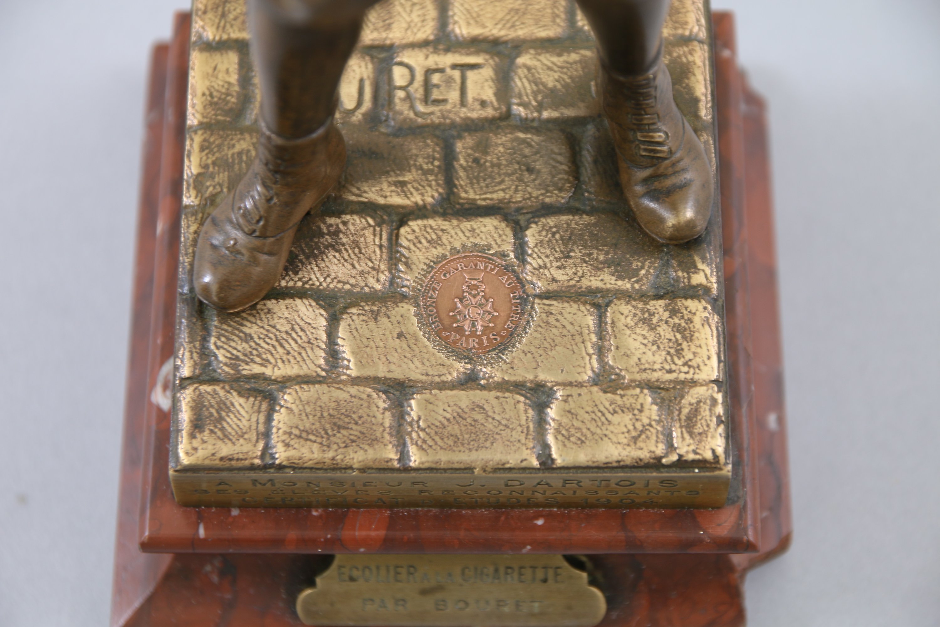 Signé. Cachet de fondeur : "bronze garanti au titre". La base marquée : "à Monsieur J. Dartois ses élèves reconnaissants Certificat d'Etudes 1904".