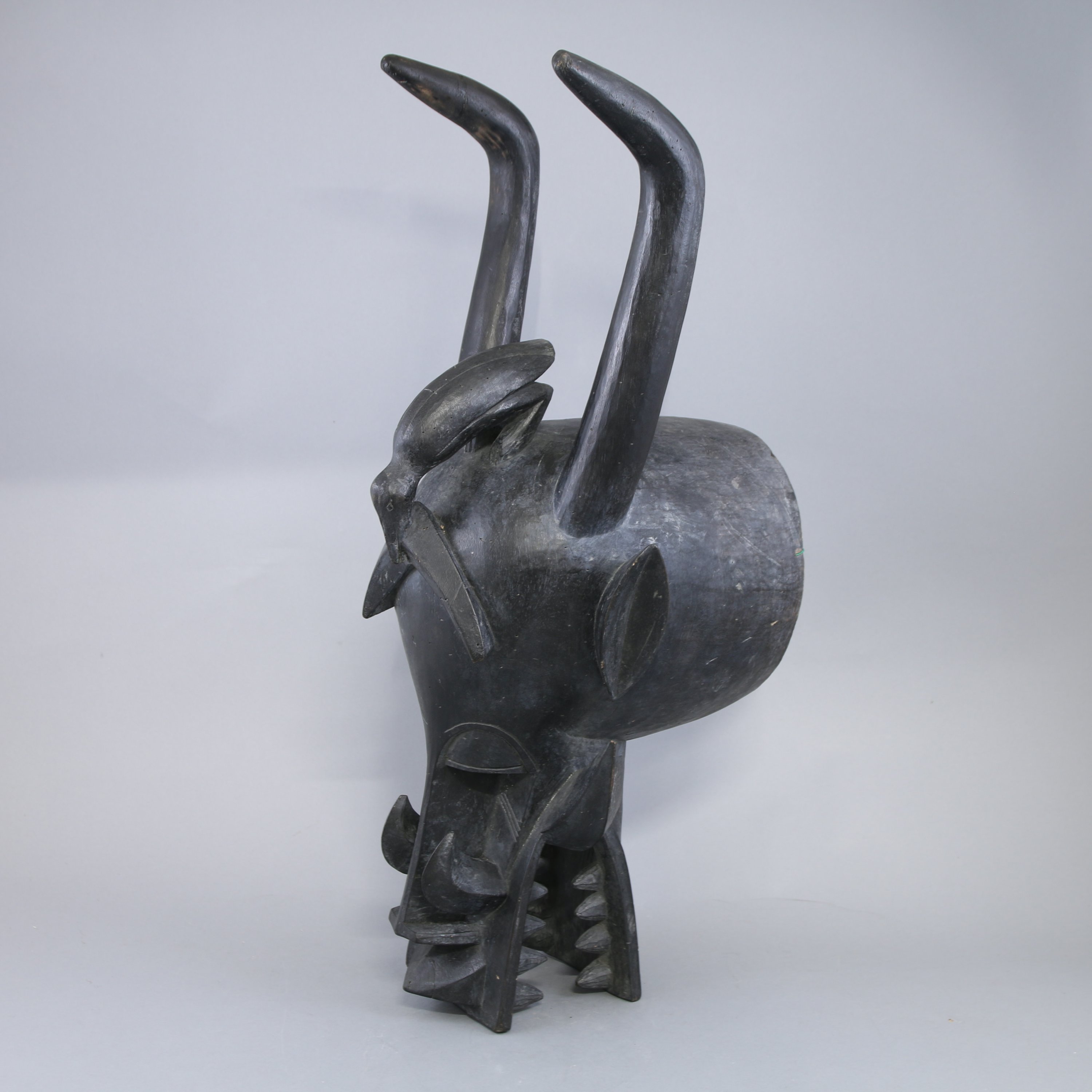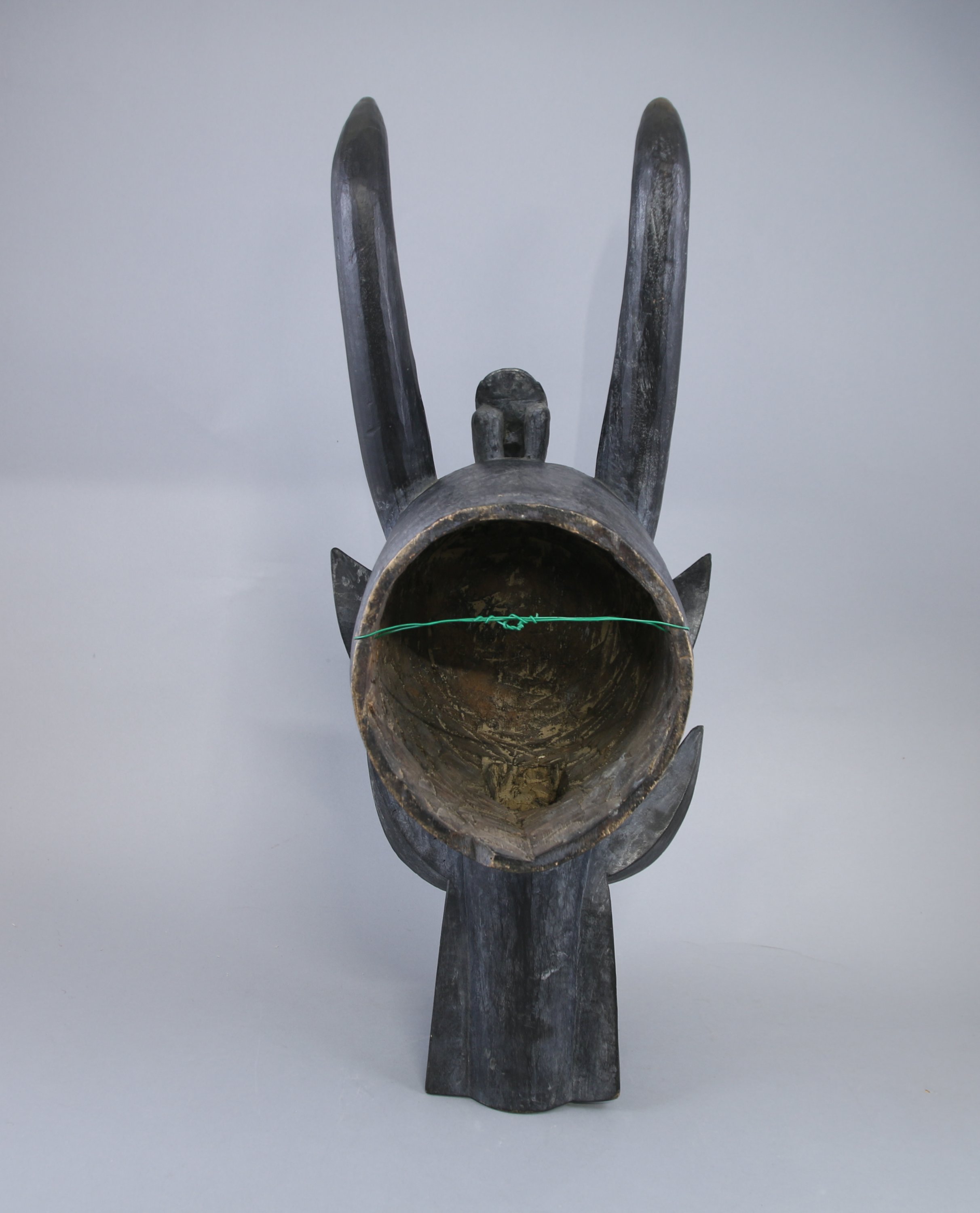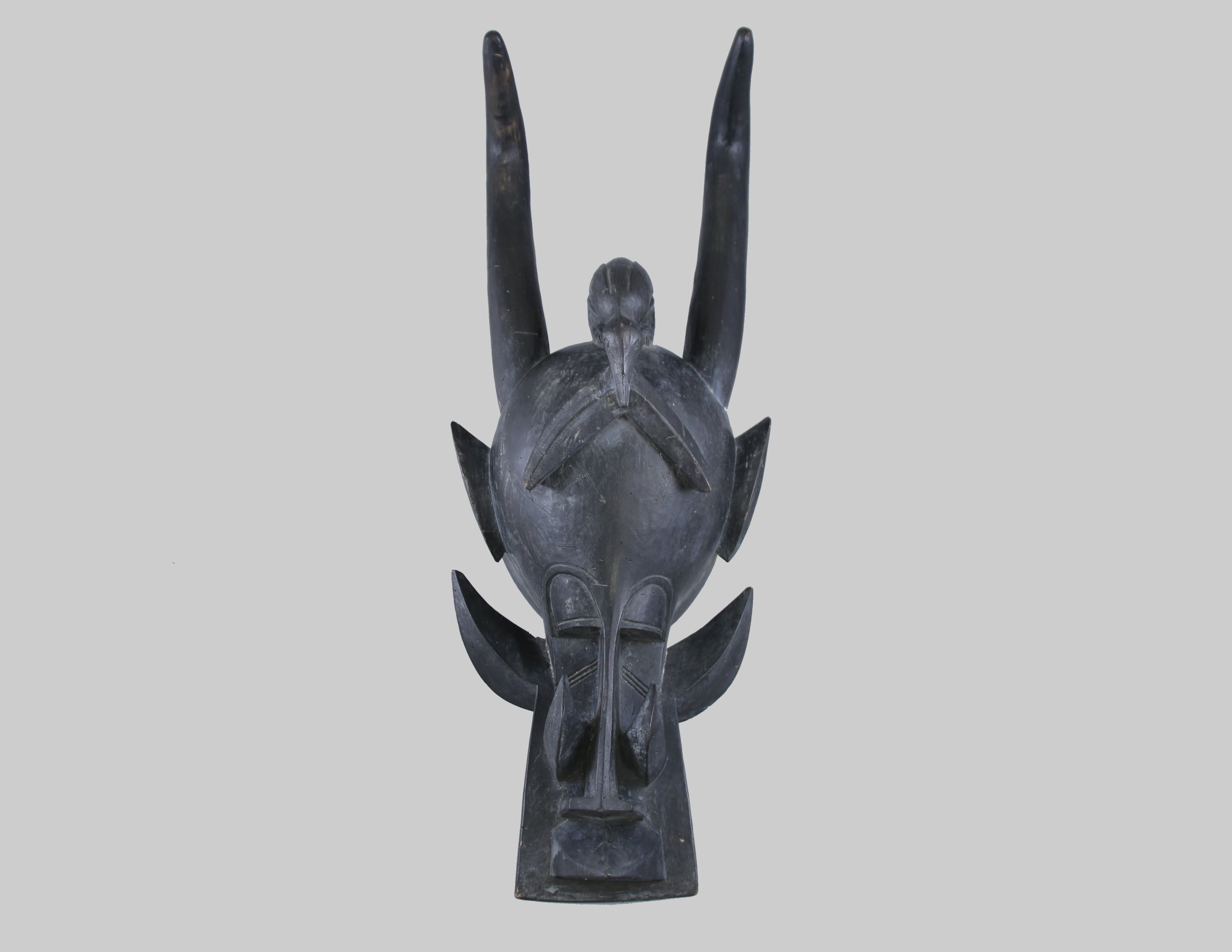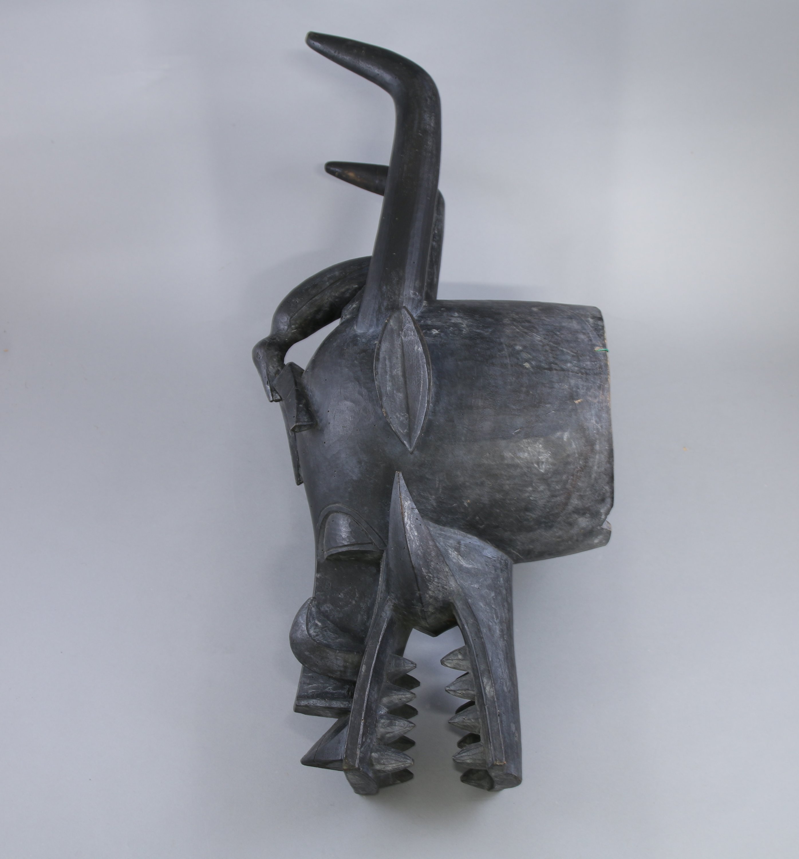 Ce masque- heaume « Waniugo » dit « cracheur de feu » est une représentation zoomorphe complexe d'un animal chimérique dont les éléments iconographiques sont liés aux pouvoirs agressifs et combatifs des dangereuses créatures de la brousse. Ces attributs sont les mâchoires et dents comme celles du crocodile, les cornes comme celles de la grande antilope et les défenses comme celles du phacochère. L'association de l'oiseau calao posé sur la tête, son bec reposant sur la queue enroulée d’un caméléon, renvoie à la genèse sénoufo.