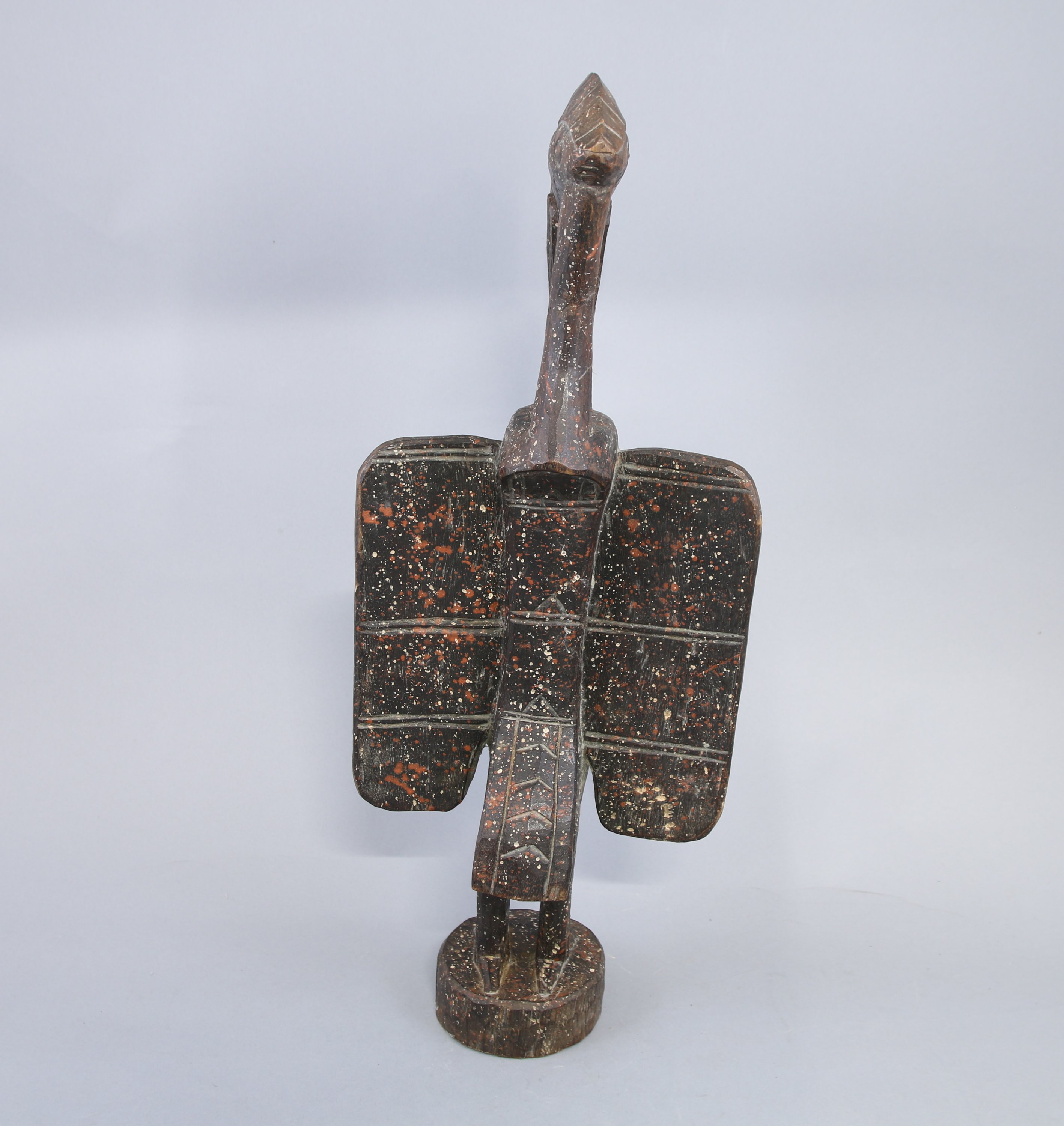 Statue représentant un oiseau calao debout sur une base circulaire, les ailes déployées, le cou gracile et le long bec dans un geste symbolique, rejoint le ventre qu’il vient de féconder.