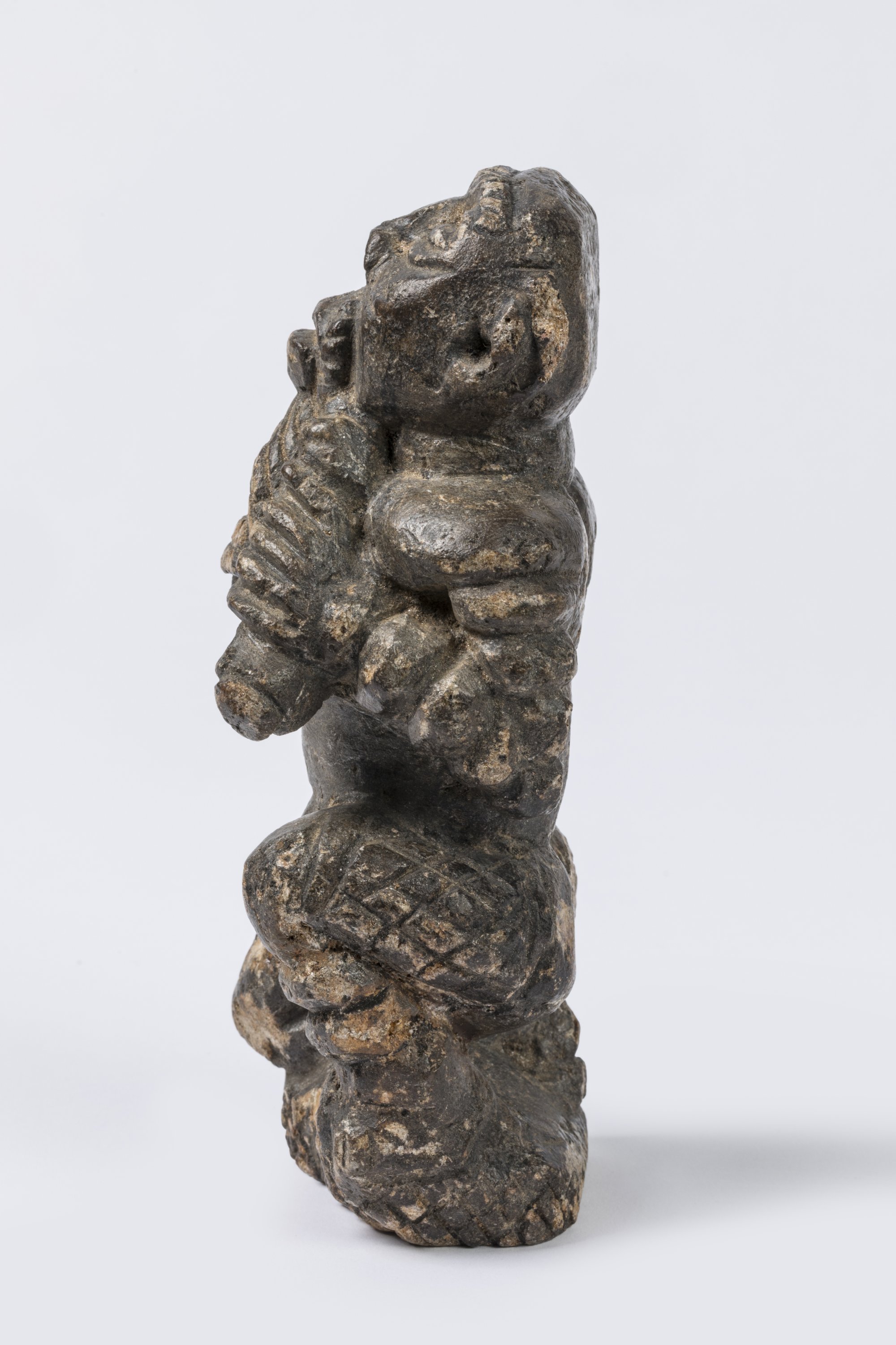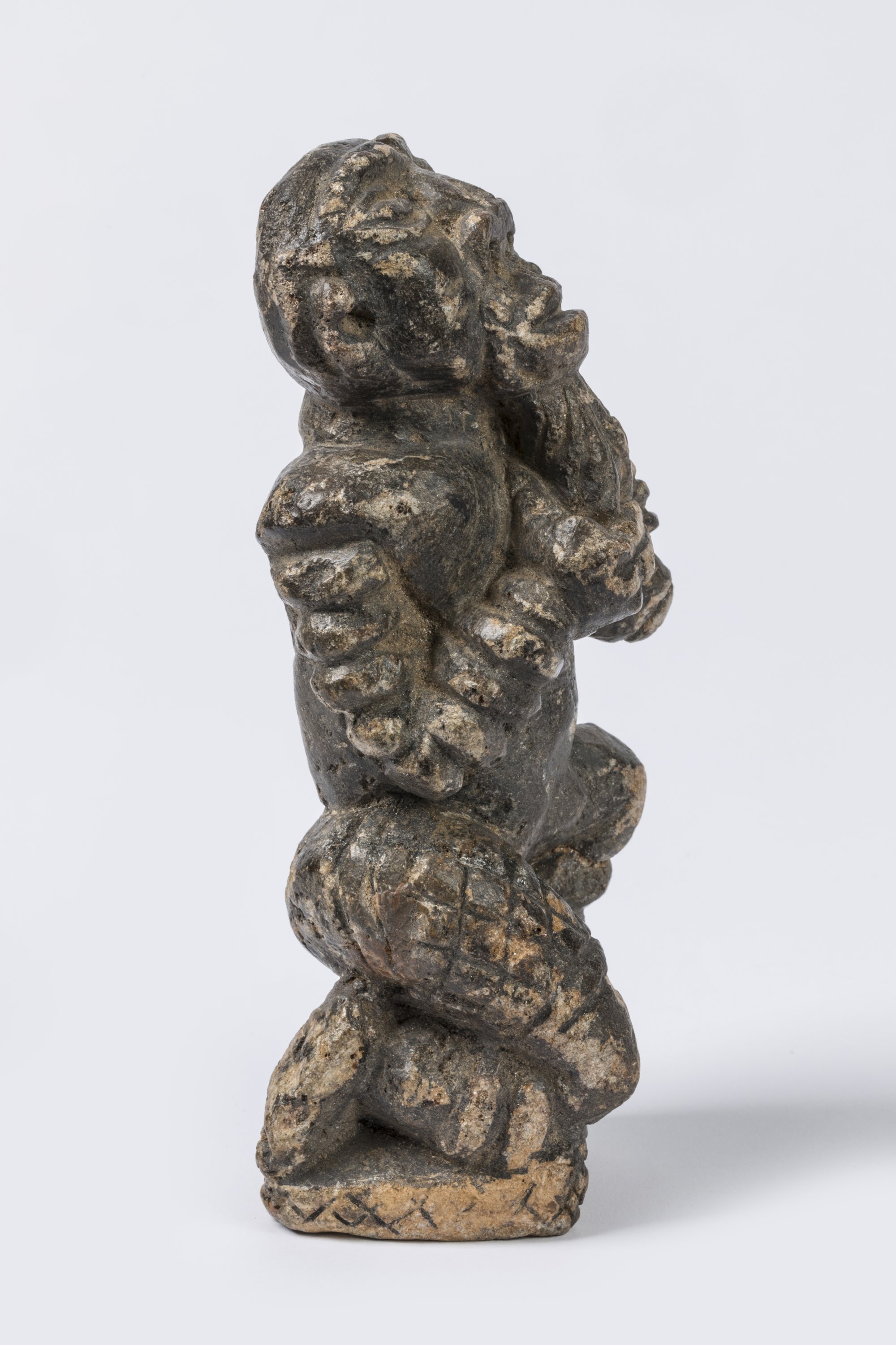 Pierre tendre sculptée, patine d'usage grisâtre.