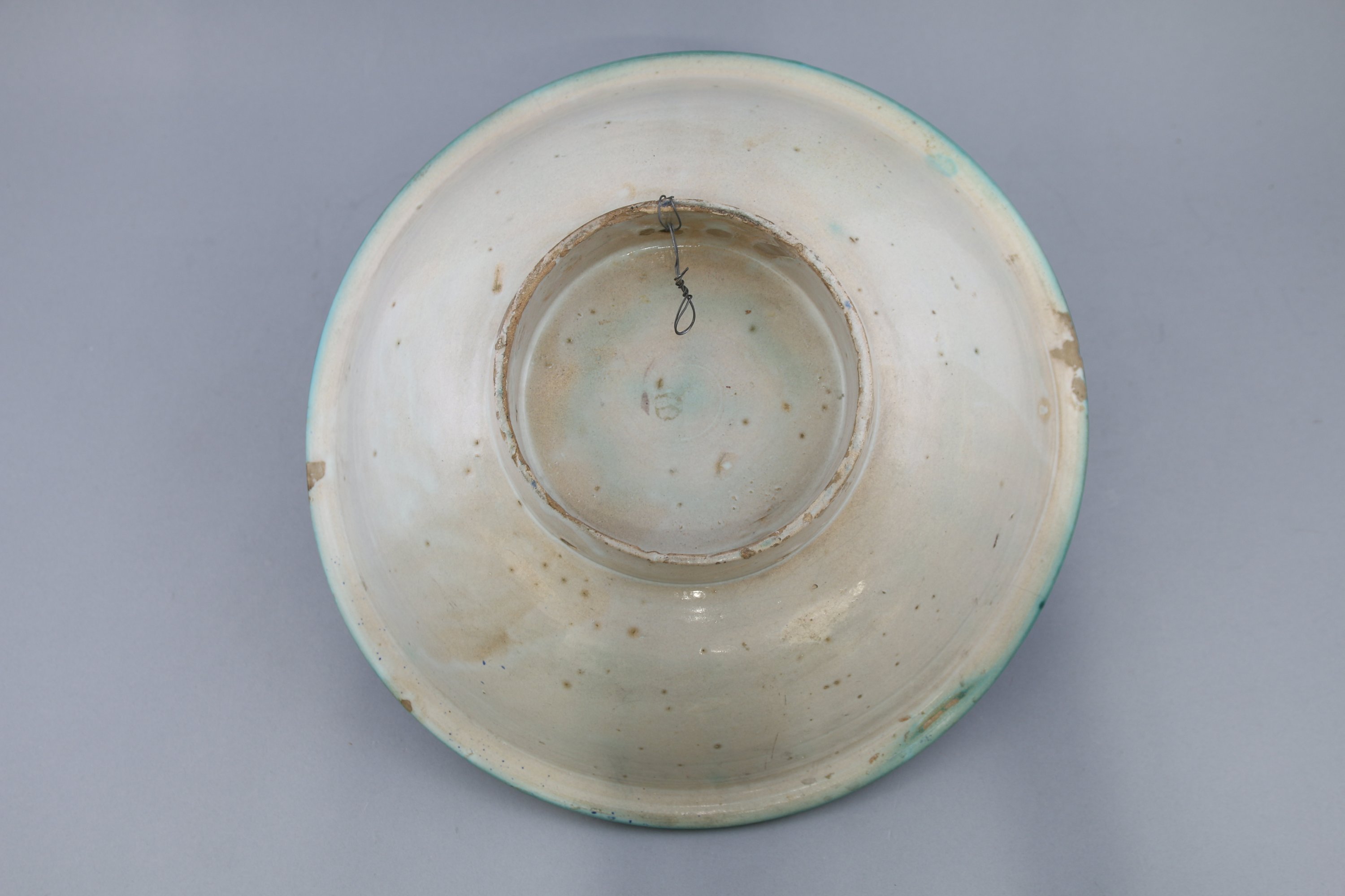 Faïence à décor polychrome, d’une rosace à huit pointes dite sceau de Salomon et d’un motif type « mille pattes » sur les parois.
