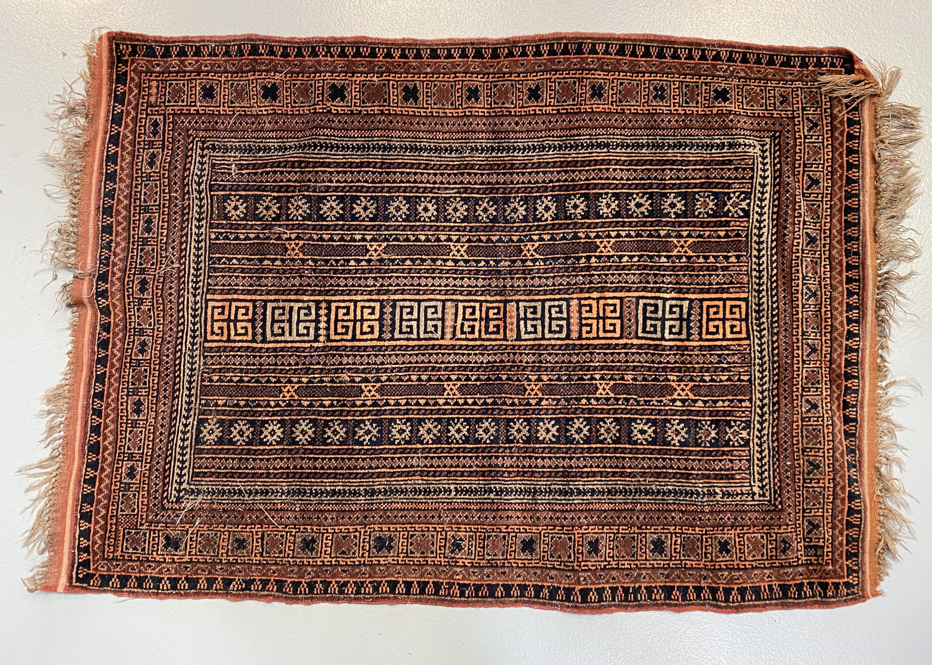 Décor rouge d’une frise de doubles crochets ou cornes de béliers, entre des montants bayadères, bordure géométrique.