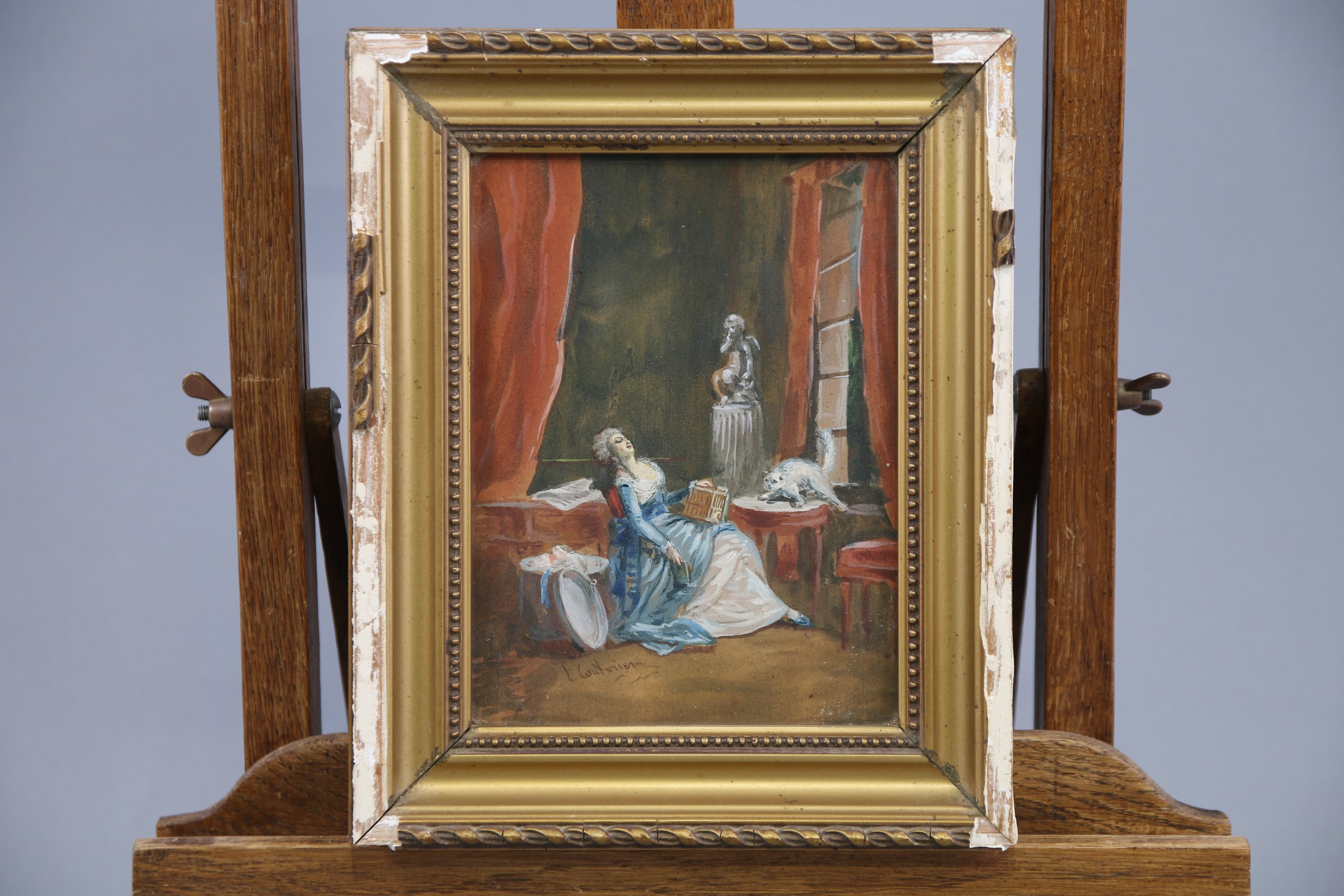 Joint : Attribué à Philibert Léon Couturier (1823-1901). La femme au chat. Gouache et aquarelle. Haut. 16,5 x 12 cm (à vue). Cadre en bois mouluré, sculpté et doré, 23 x 18,5 cm.