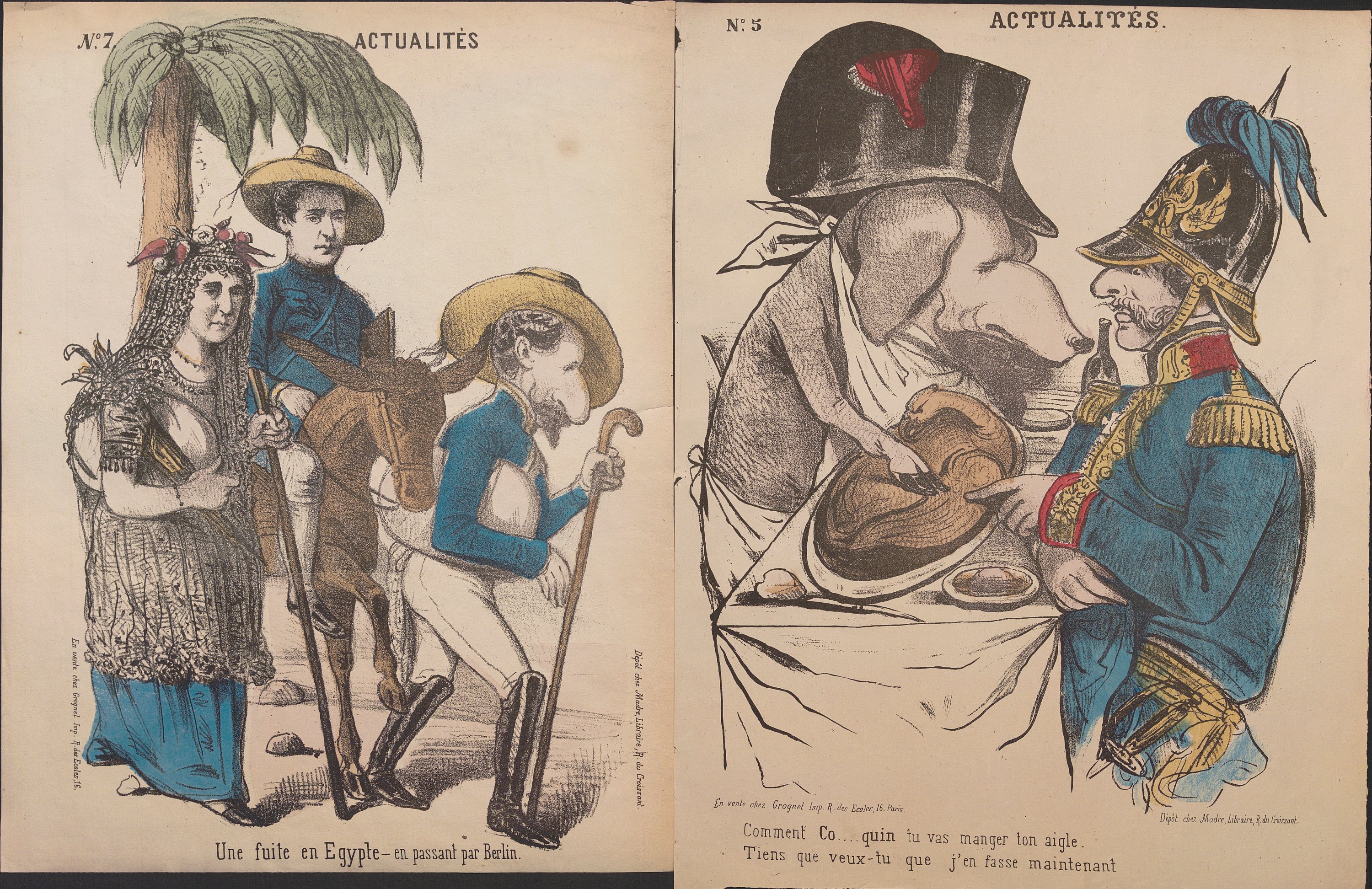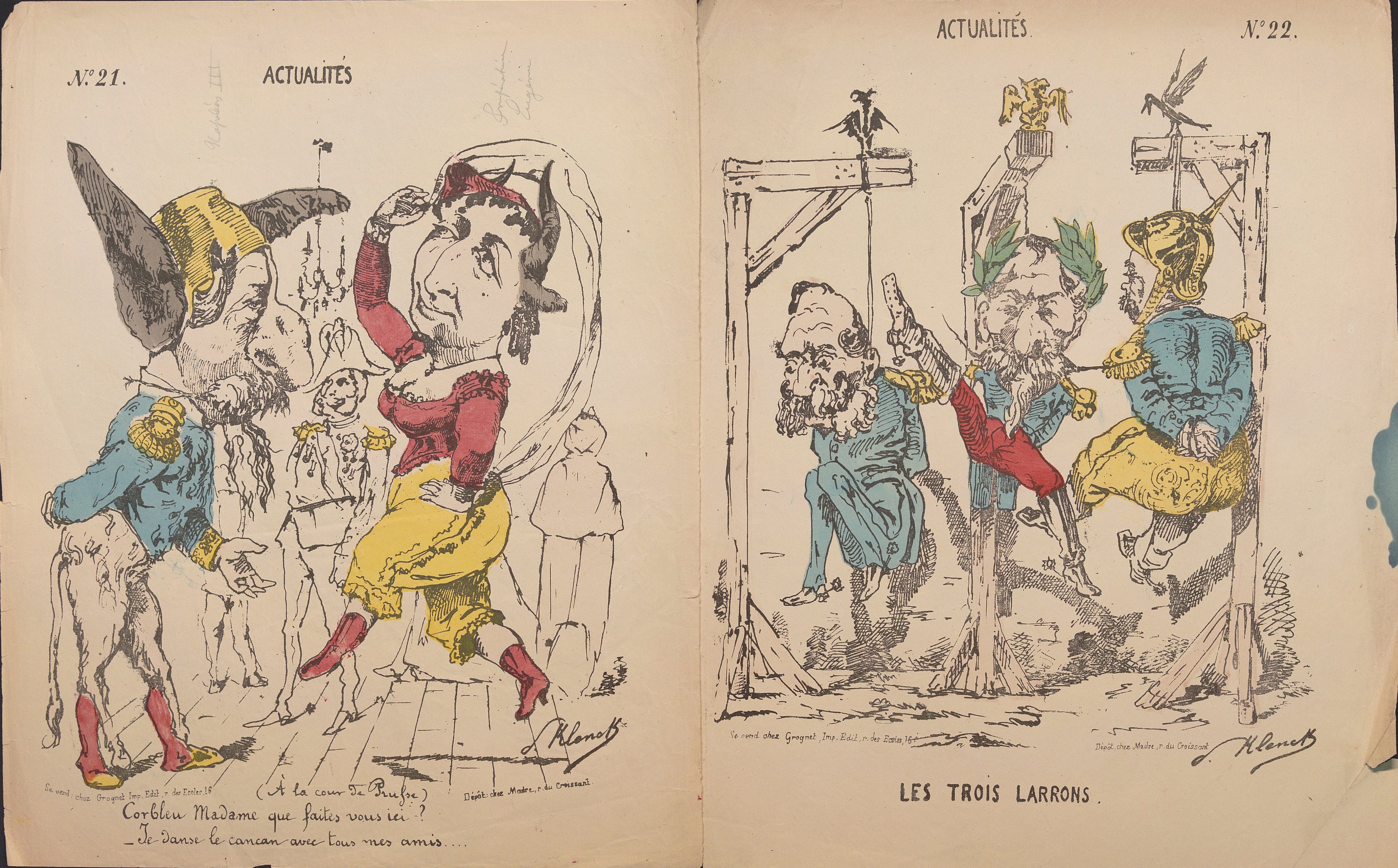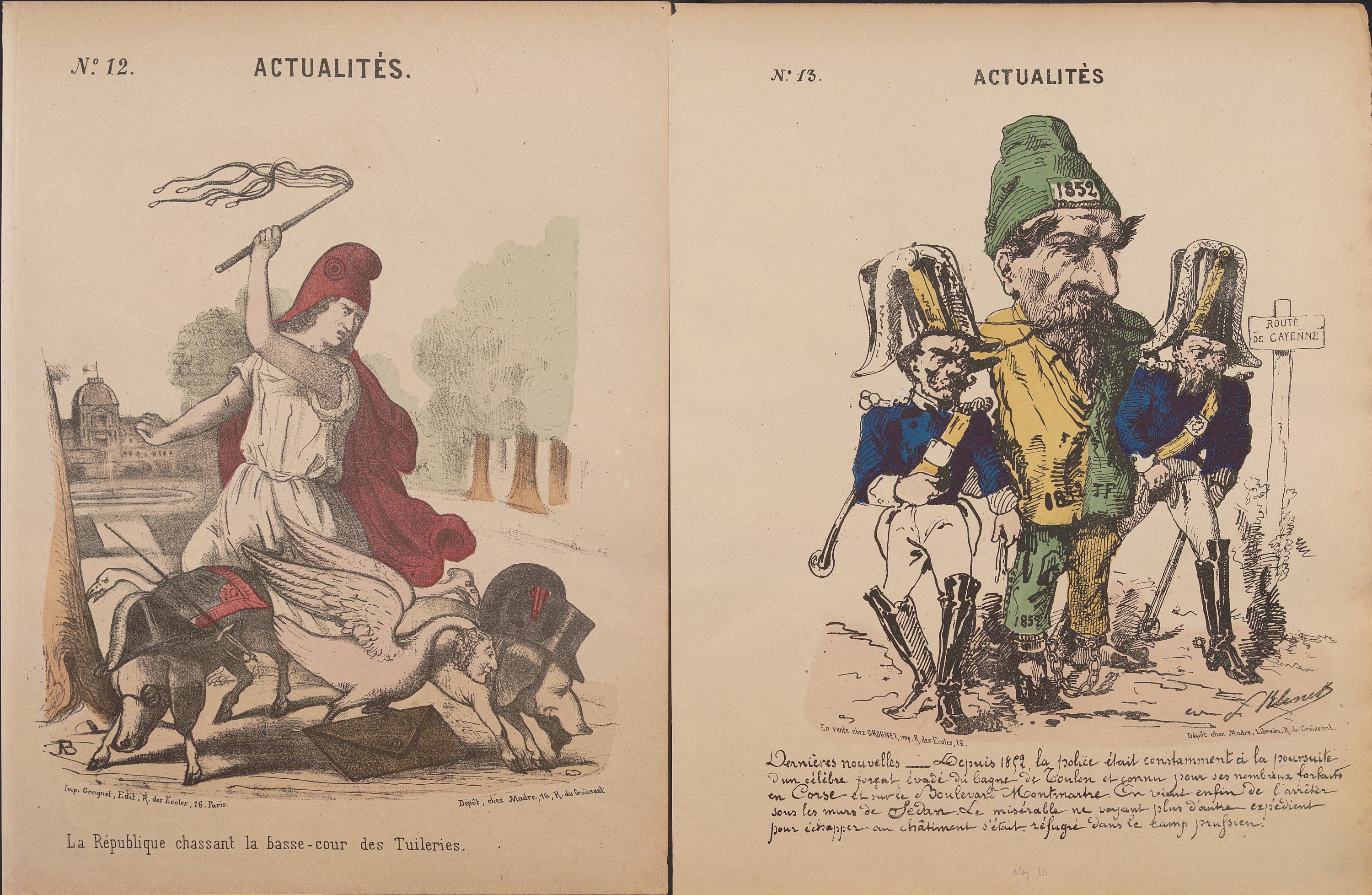 « Actualités », série quasi-complète n°1 au n°87 (mque 79, 80, 82, 83 et 87), formats divers ; feuilles volantes illustrées par différents dessinateurs/illustrateurs publiées et vendues dès le début de la guerre de 1870 jusqu’à la fin de la Commune de Paris ;
