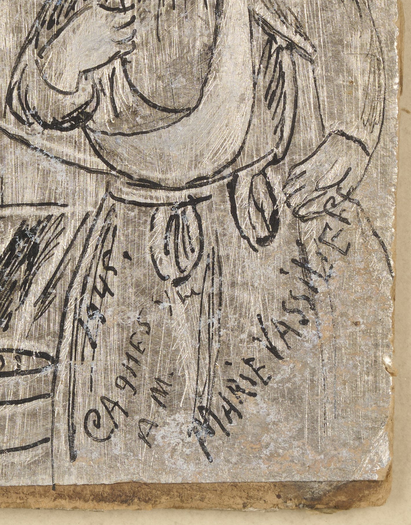 Papier argenté, crayon, peinture, encre sur carton.