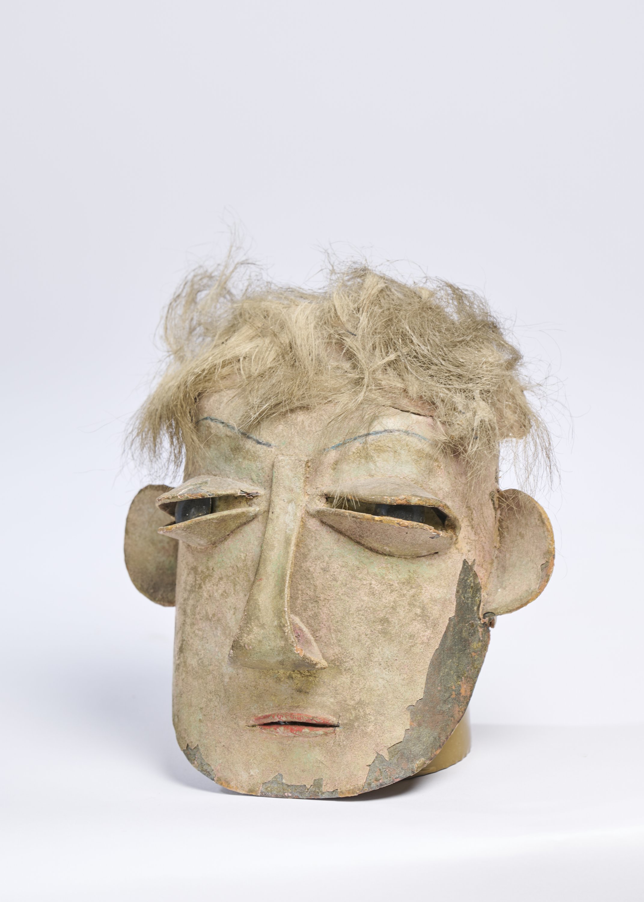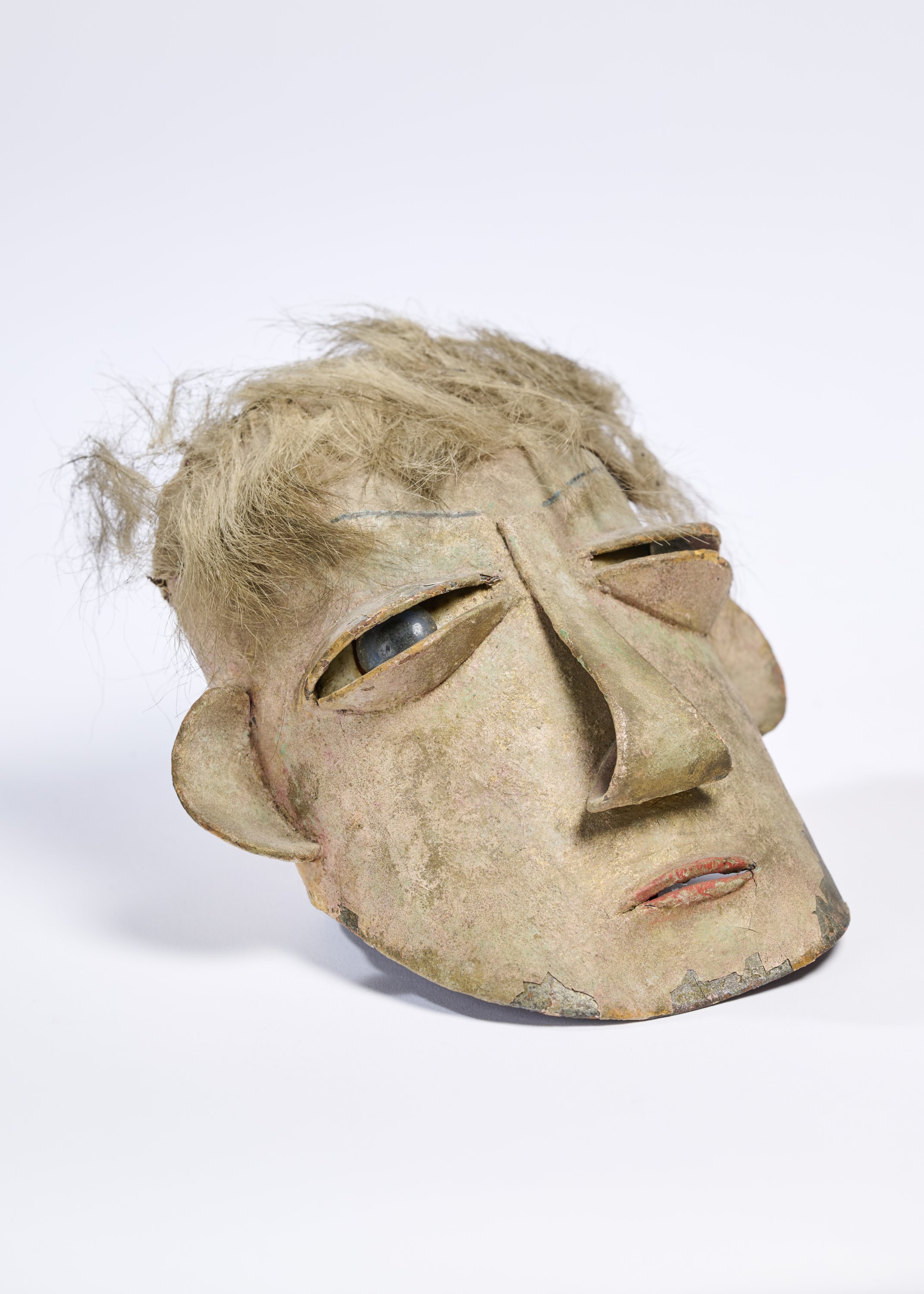 Cartonnage polychrome, cheveux, yeux de verre.