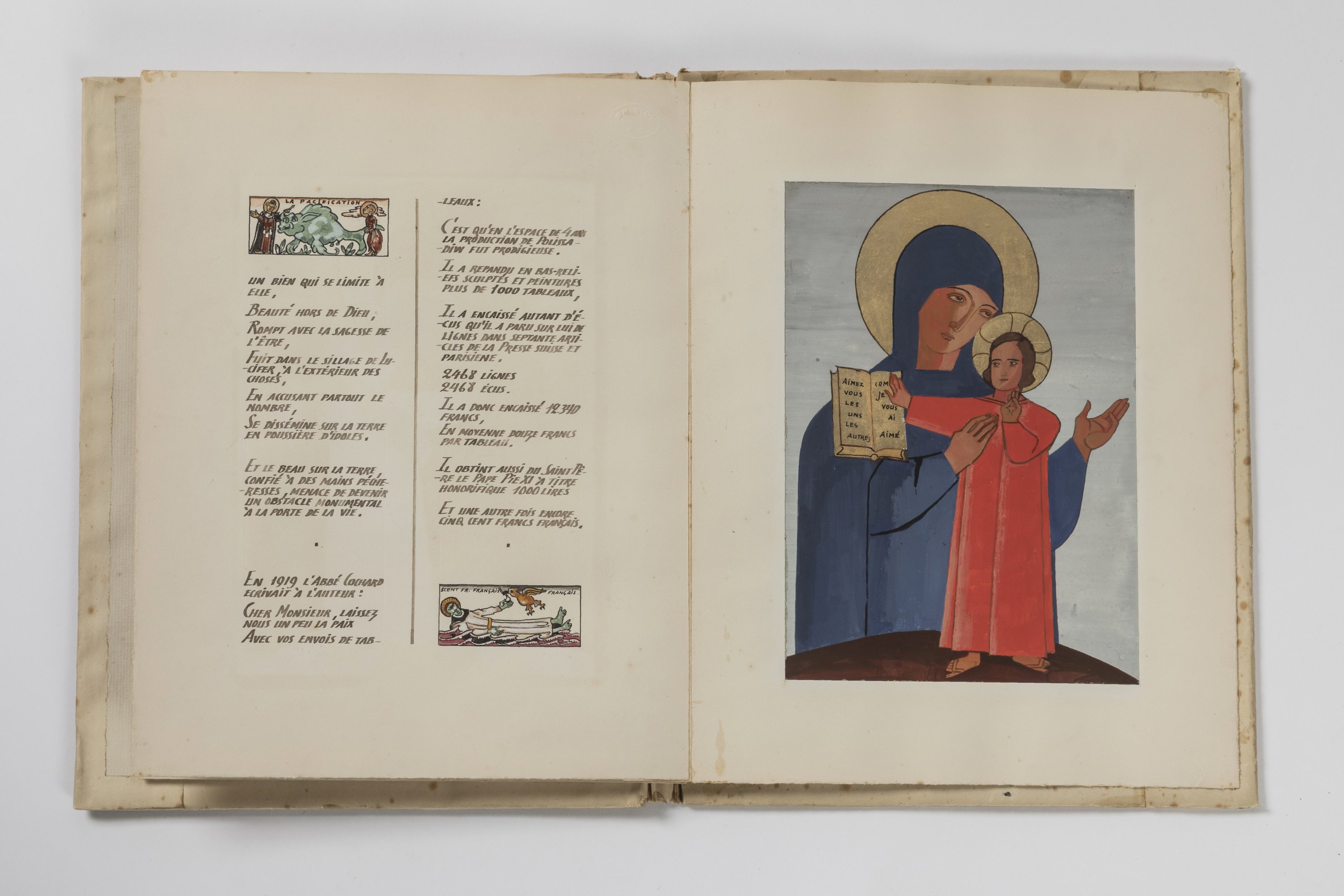 Le texte est illustré de 10 petites vignettes légendées in-texte, et de 4 grandes compositions hors texte pleine page représentant différentes versions de la Vierge à l'Enfant à la manière du type Hodigitria aux couleurs or/argent et couleurs vives (bleu lapis, rouge profond).