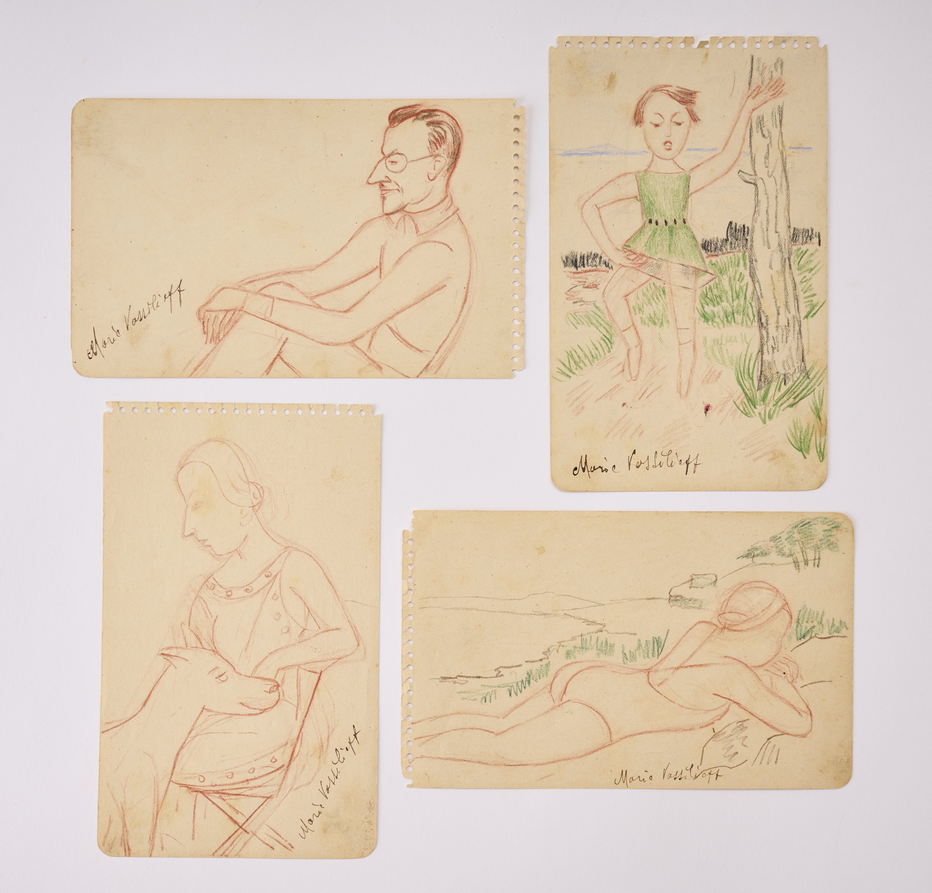 Quatre dessins aux crayons de couleur tirés d'un carnet.