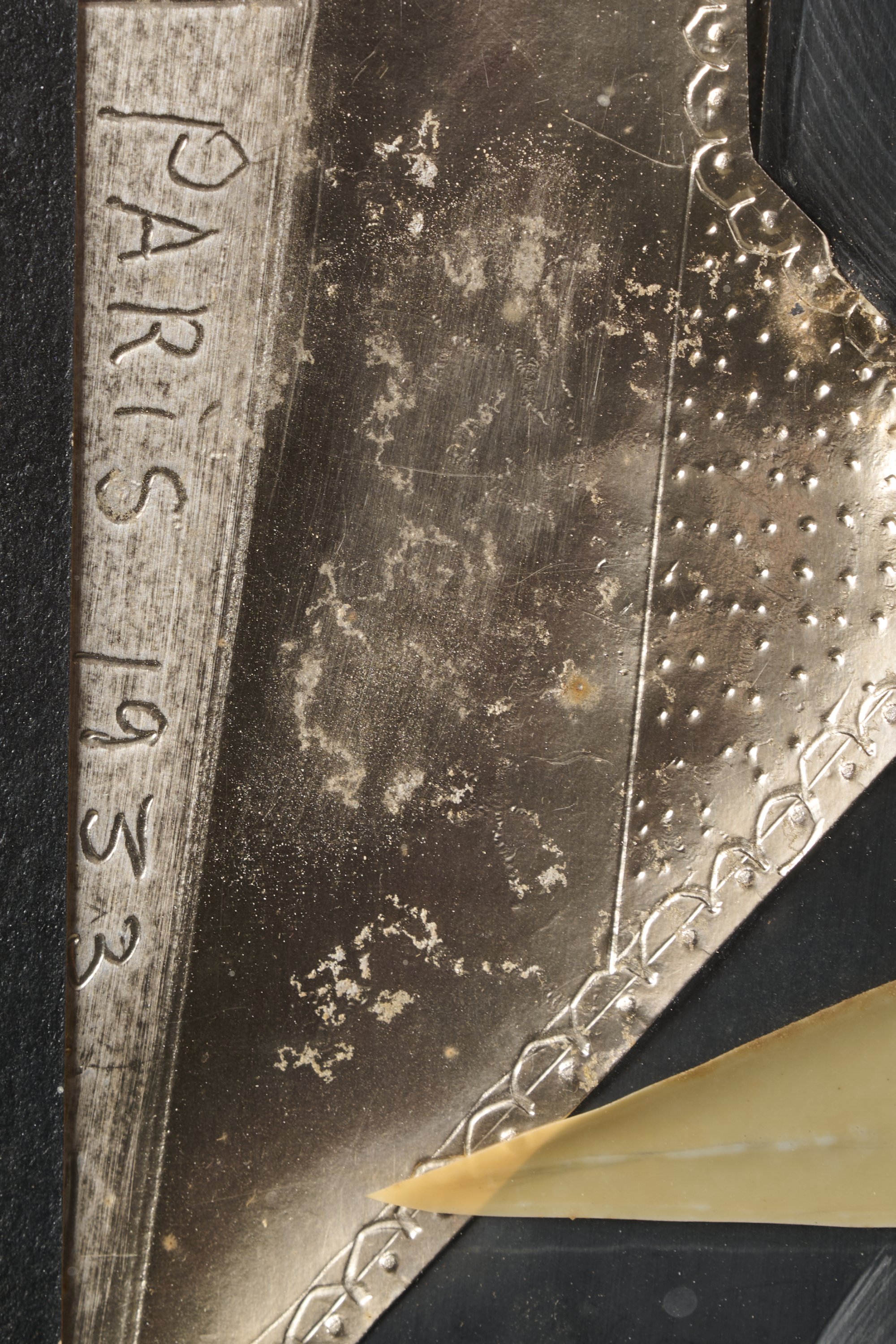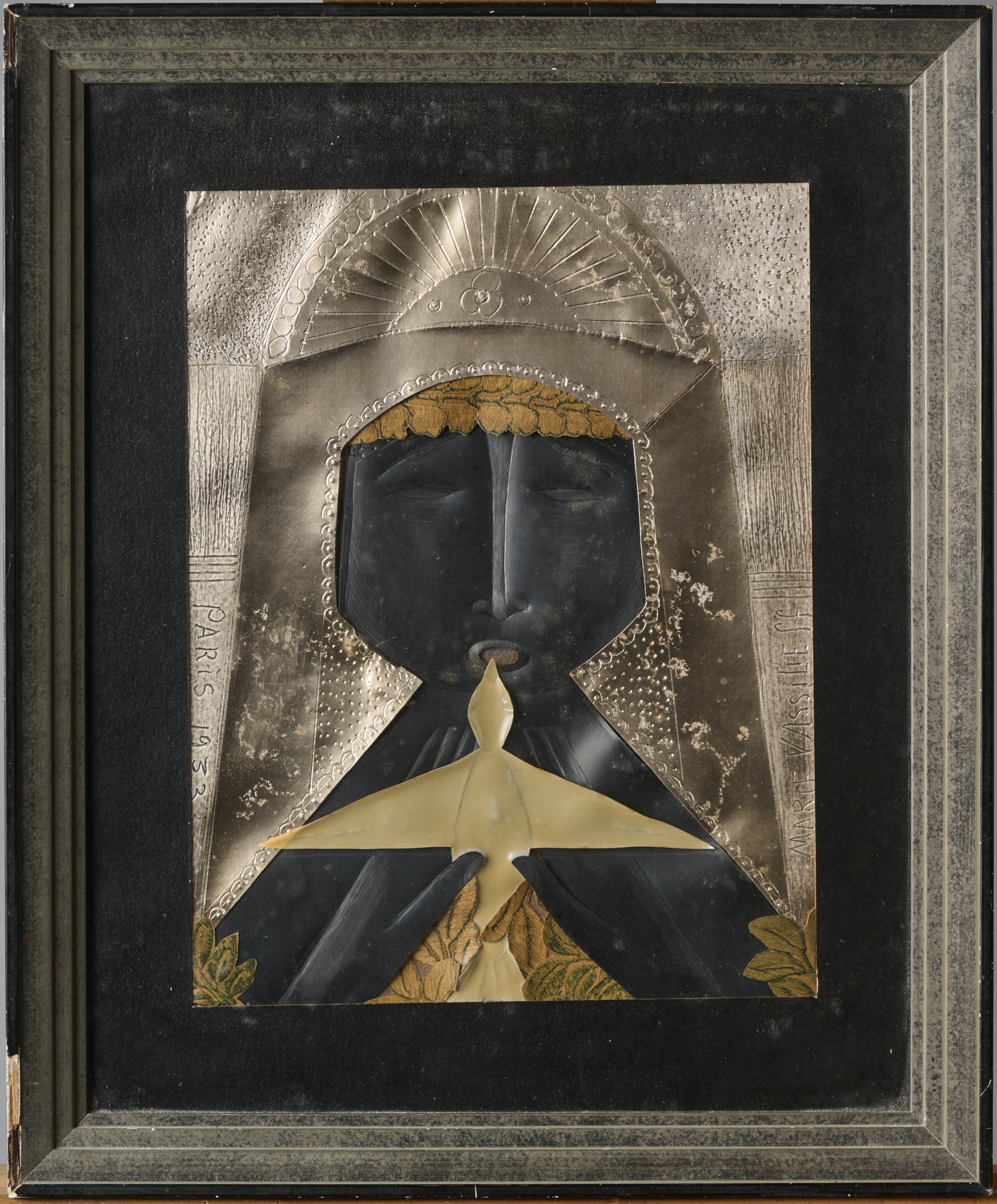 Papiers découpé et gravé, carton argenté, collage, rodhoïde,