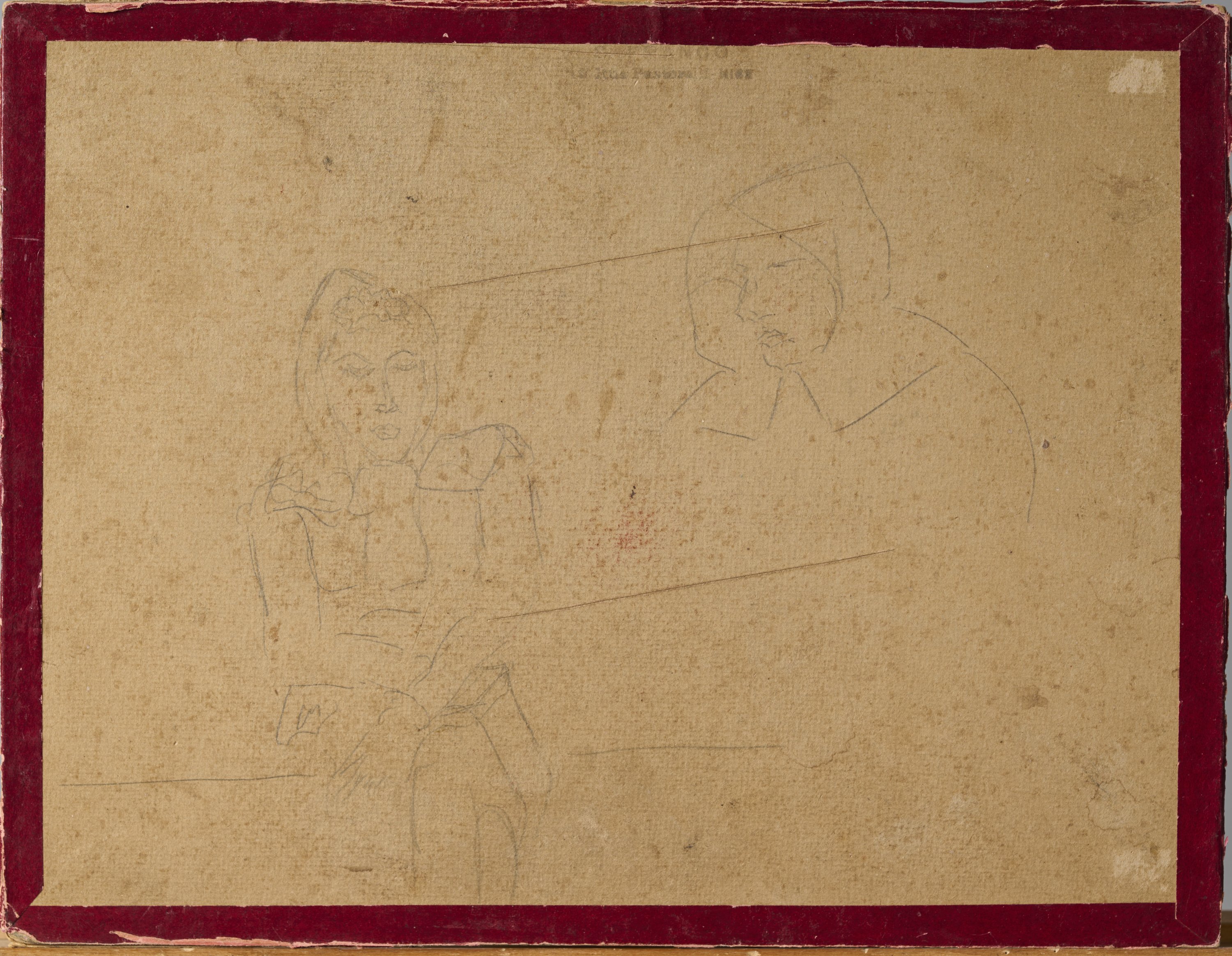 Contrecollé sur un carton au format avec une étude de personnages au dos.