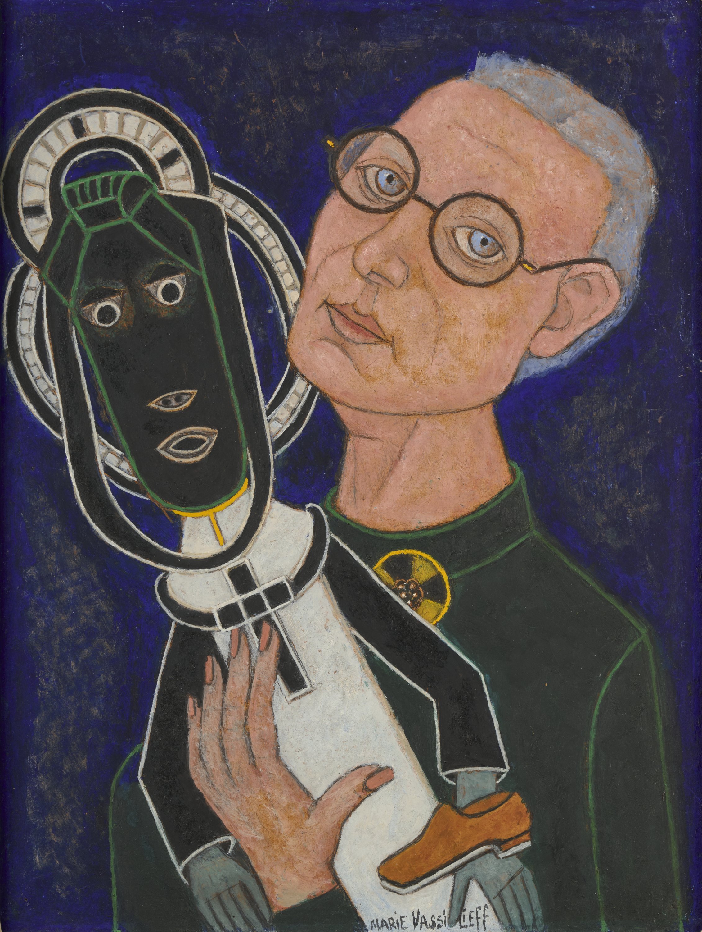 Sur fond noir, Marie Vassilieff se représente légèrement penchée, les yeux bleus cerclés de lunettes rondes, les cheveux gris coupés court. Contre son corps, elle tient une grande poupée de Vierge noire au vêtement blanc, une croix noire autour du cou, le visage auréolé à la façon du caoutchouc mi-icône byzantine, mi totem africain. Devant sa main gauche, une chaussure. Ce tableau place l’artiste face à sa créature, la femme face à son double sacré, le corps vieillissant face à l’objet fétiche. La chaussure, accessoire dérisoire et prosaïque, introduit une note d’humour noir dans cette scène d’une gravité mystique. Jimerson note que lorsque Vassilieff se représente avec ses poupées, le corps élancé de celles-ci n’exhibe aucune caractéristique masculine ou féminine prolongeant dans la peinture la question de l’androgynie qui traverse toute son œuvre.